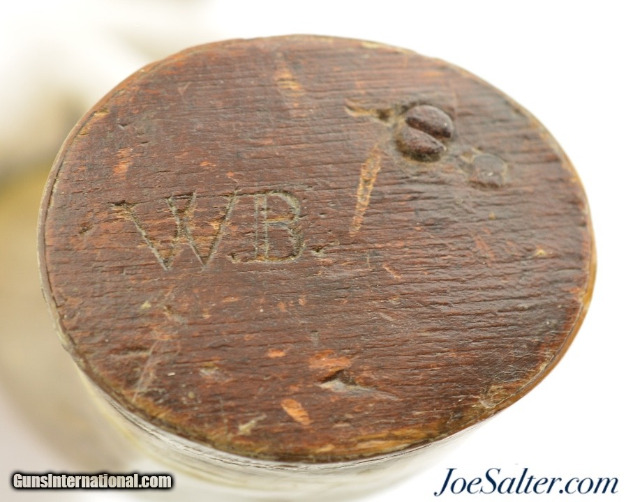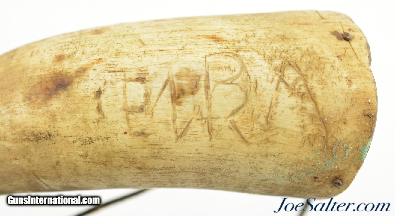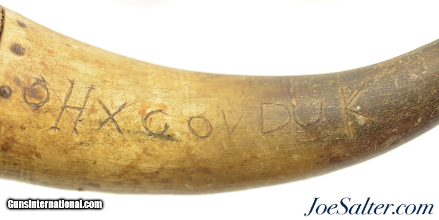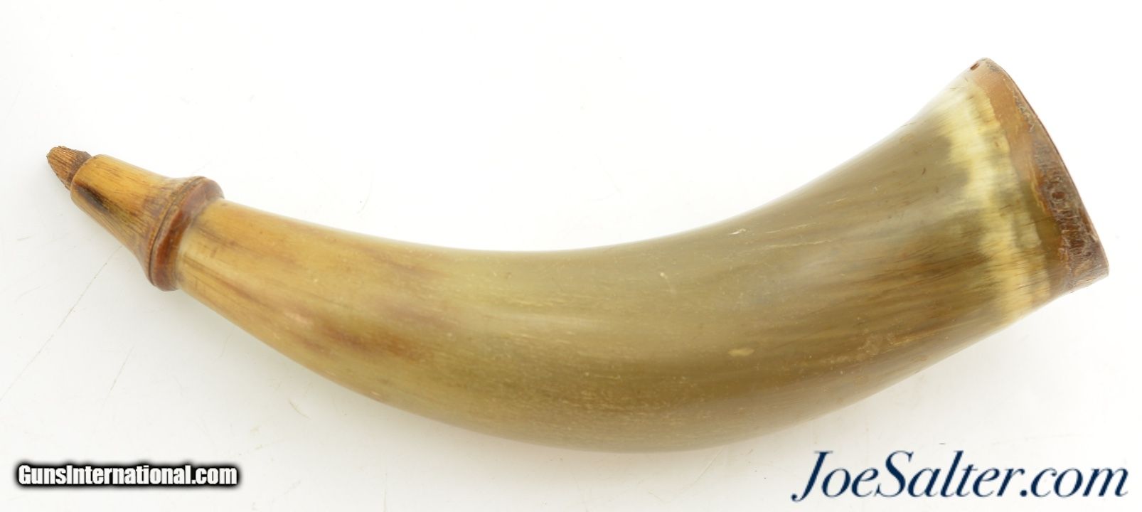 Description: This is a collection of 3 vintage powder horns containing 1 good condition, 6 1/2" horn with a large 1 3/4"x3/4" wooden plug, firmly nailed with 13 nails to the base of the horn. This one is etched "OHXCOVDUK" along the inside curve. The next is 9 1/2" with ornate carved collar with a small broken tip/plug. The wooden base is flat and nailed to the horn with "W.B." etched into the base in very good condition. The last is just over 10" and is the crudest of the three, the base having 3 nails but may be the oldest in the group. This has what appears to be an ARROW on one side and "P/l/BA" on the top curve. This is in good condition without a stopper and has a contemporary; Price: $119.00 Contact Seller |