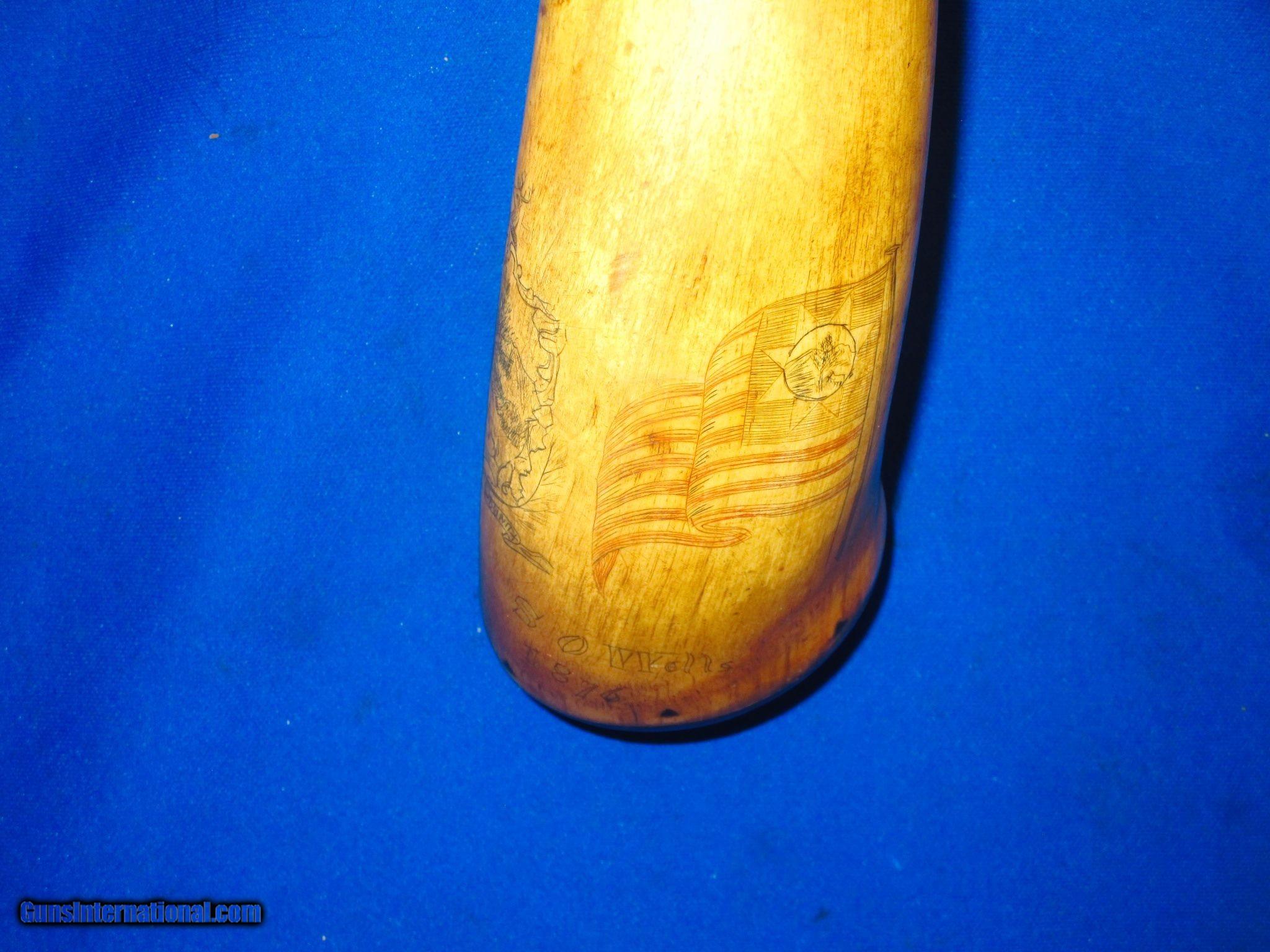 Description: An Early 1800's Vermont Fully Carved Powder Horn Given To The Owners Son, "S.O. WELLS" In "1876" In Fine Untouched Condition. All original throughout with an early 1800's tool tied to it. The ornate carved horn measures 15 inches in length and is completely untouched with a wonderful color to it. It has carved on it "An American Flag With The Vermont State Tree On It", "The State Seal Of Vermont", "Uncle Sam", "A Very Large Building Or Home" with an unusual flag flying above it with the initials "JE' on it. On the bottom of the horn in a totally different hand is carved "S.O. WELLS, 1876" This was definitely added on later on, most likely a son of the original owner. There is also a row of musical notes that goes around the horn. This Horn Is A Wonderful Piece Of Americana That Deserves To Be Researched Further As It Just Came Out Of A Very Old Estate! Price: $2,395.00 Contact Seller |