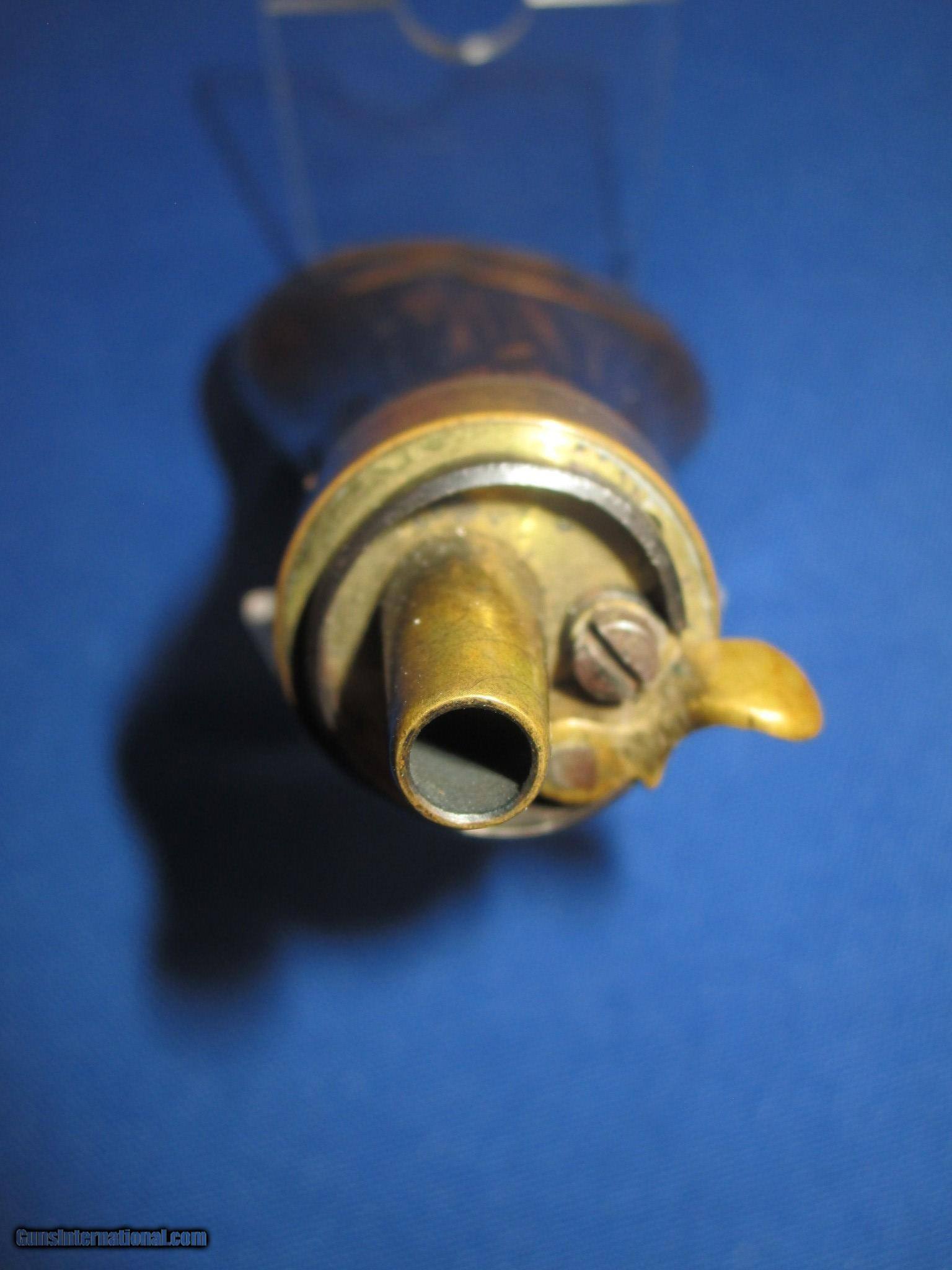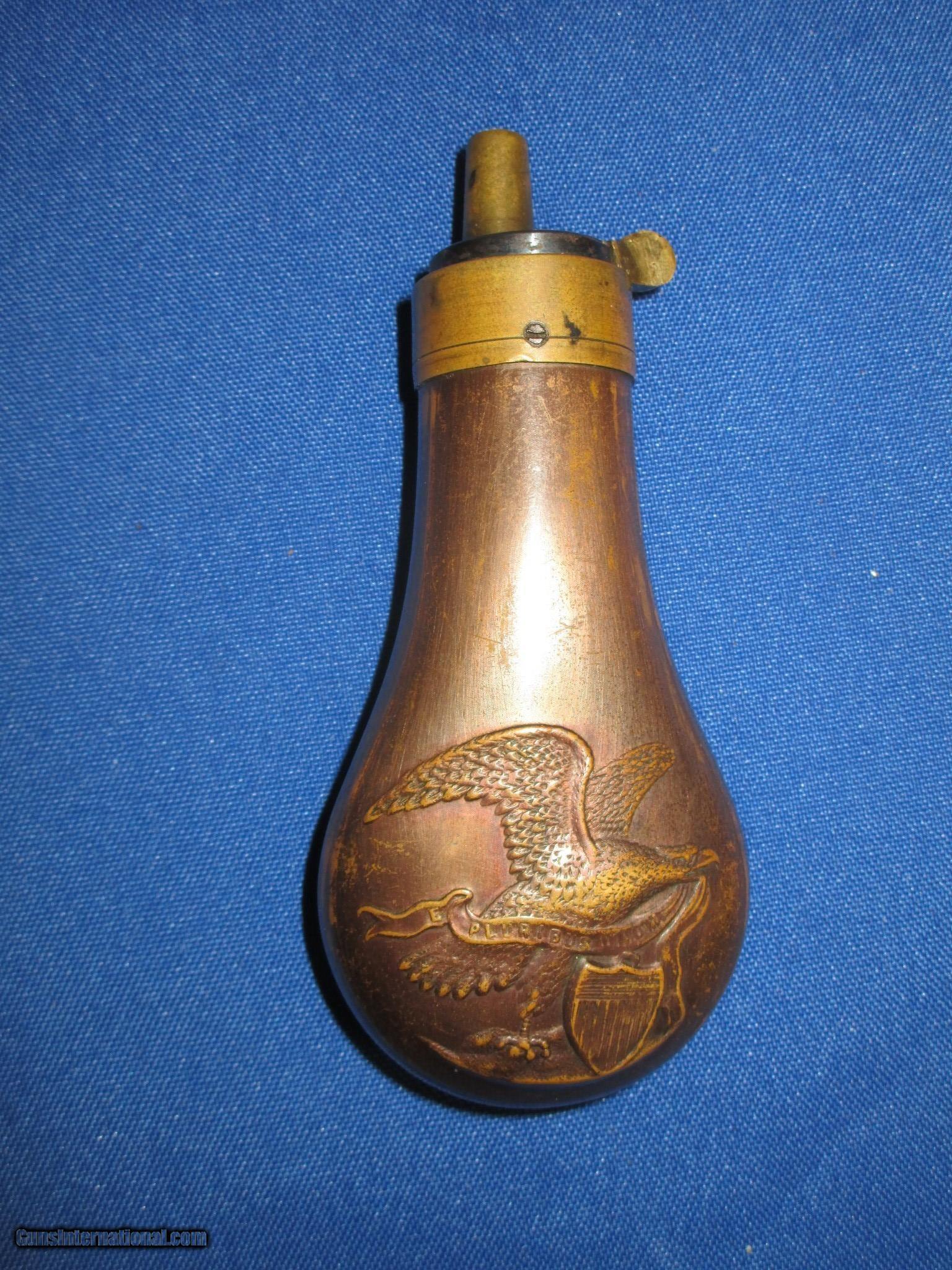 Description: This is an Early Civil War Eagle and Shield Flask for a Colt or Other Pocket revolver in Excellent Condition. The Flask is all original and works fine. SOLD |