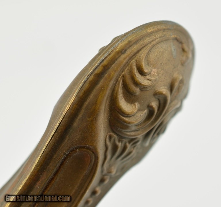 Description: This is an excellent condition pistol sized, 4"X1 3/4", Panel style flask with a fully functioning common top with screw off charger, excellent patina, no splits and 2 hangers. Although not marked this flask is attributed to the Capewell Co. as seen in Ray Rilings "The Powder Flask Book" on page 304 #447. SOLD |