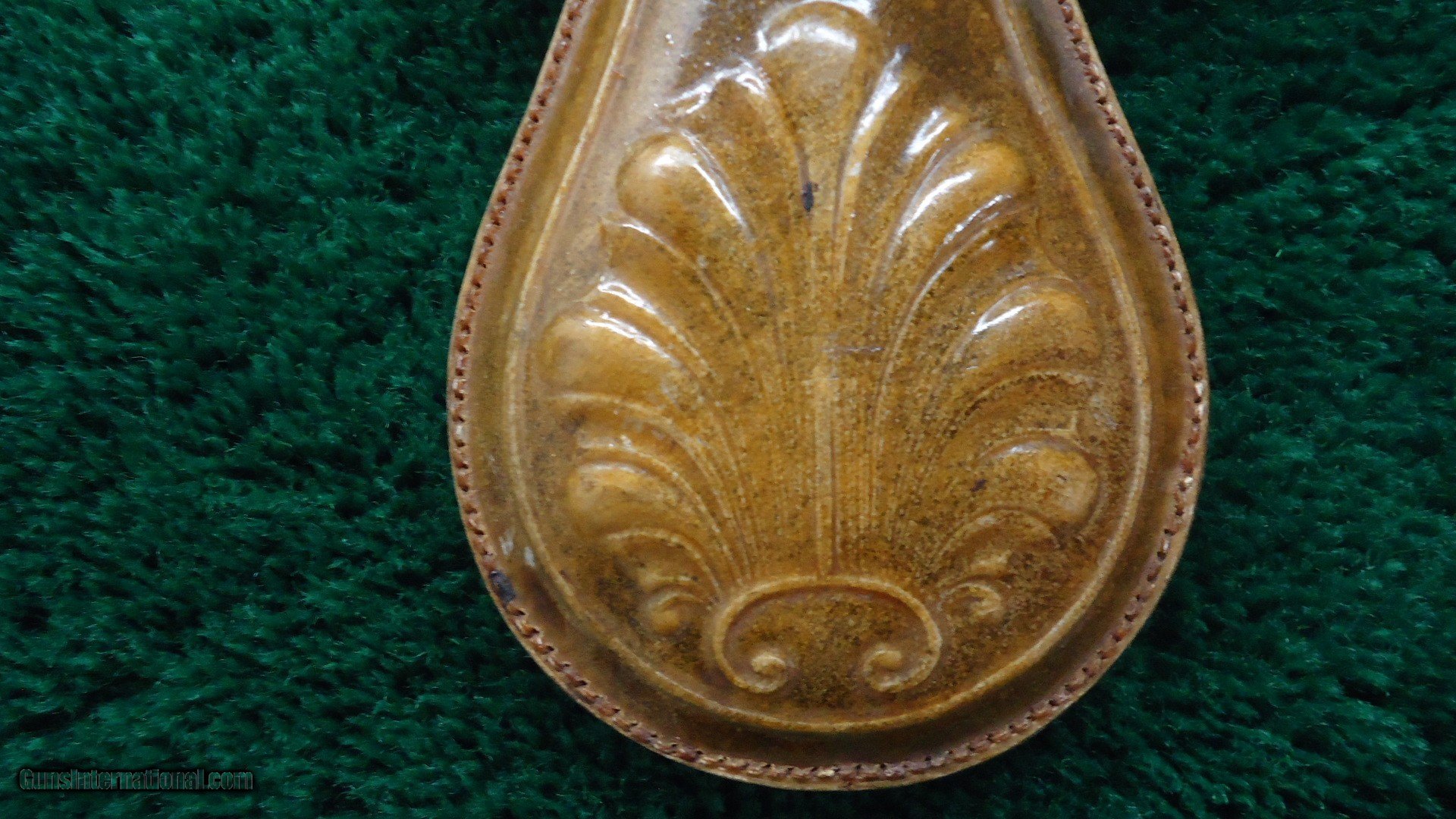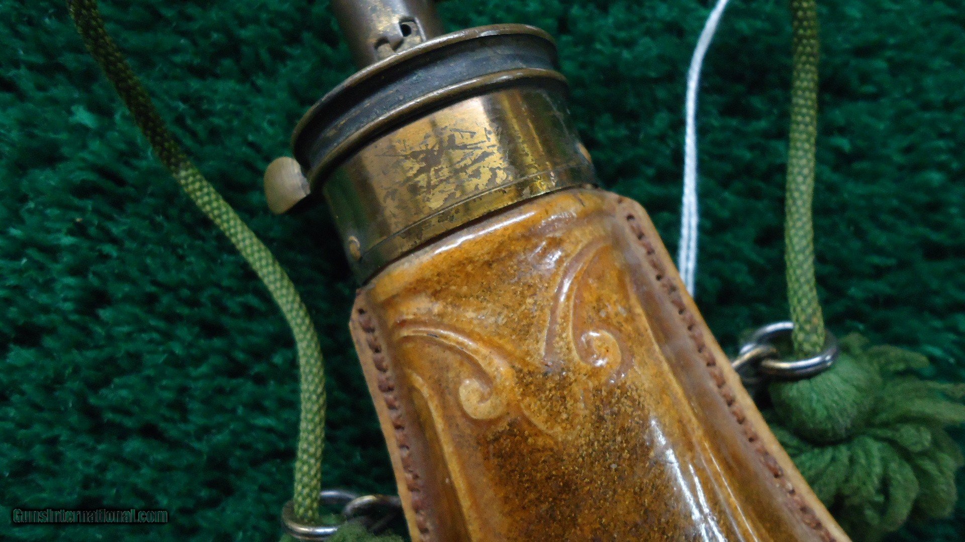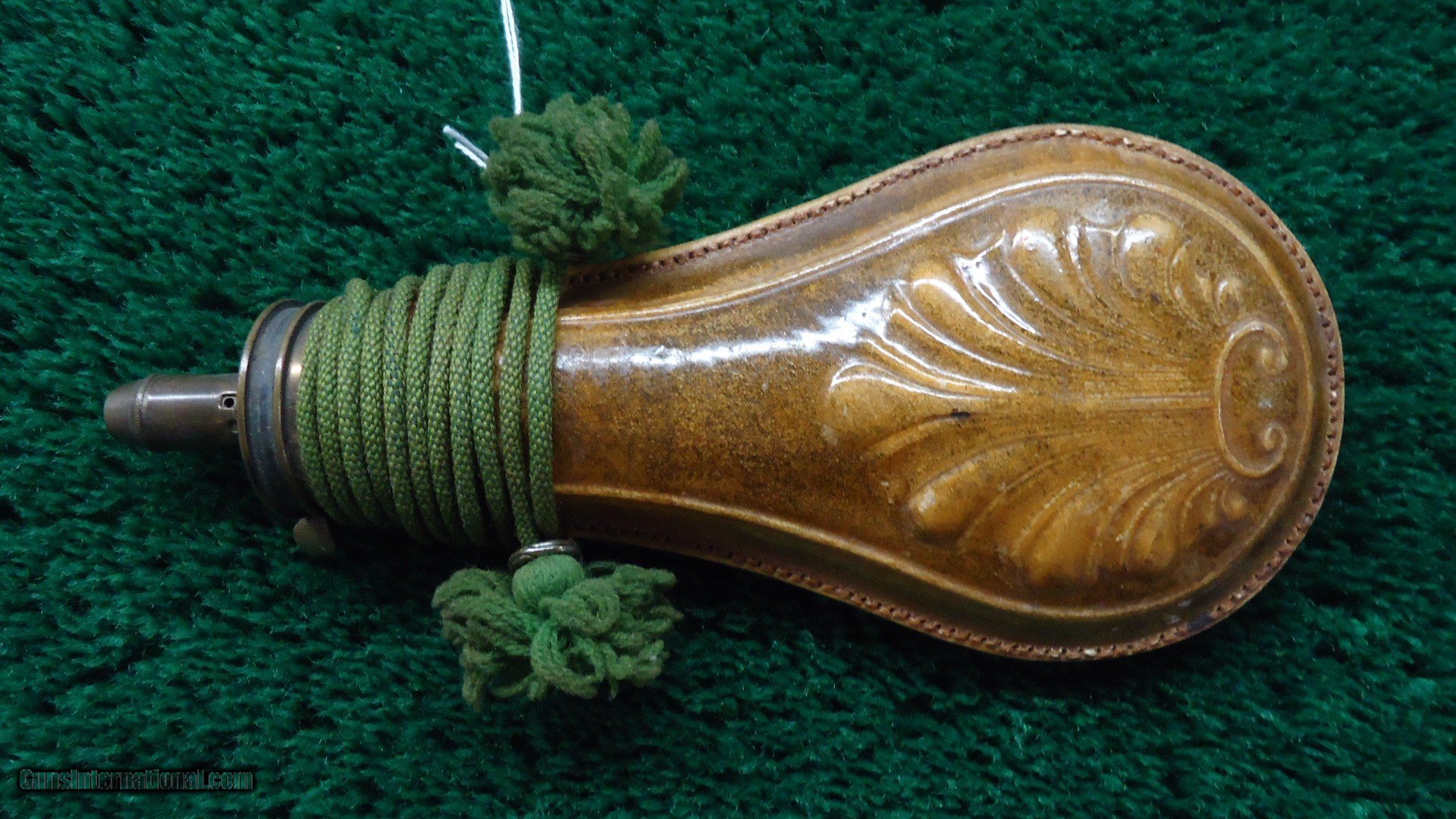 Description: Number 1246 in Riling's book. 6-3/4 inches from the bottom of the body to the bottom of the charger. Die-pressed rawhide flask. The inventor claimed it to be "the most durable flask ever made" with the added advantage of translucence so that the contents could be estimated. 2 eyelets with green carrying strap. Screw-off patented top adjustable with inside spring. Adjustable charger with 3 graduations. Missing the Adjustment Stop Screw. Leroy Merz Antique Firearms specializes in antique and vintage Winchesters and other fine American firearms. Since 1965 Mr. Merz has taken part in the world of firearms and has been a contributor to many well known reference books. We have hundreds of additional guns in every price range at our home online. Search for Merz Antiques in google. SOLD |