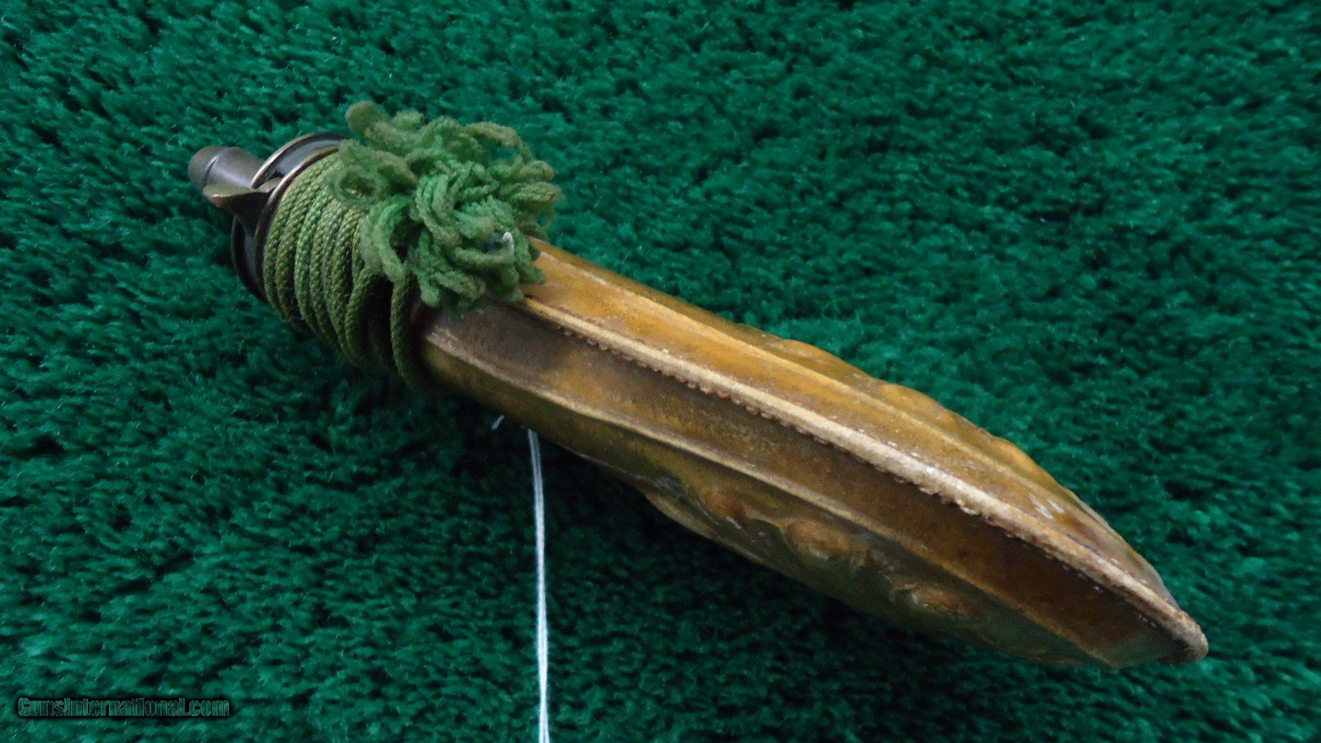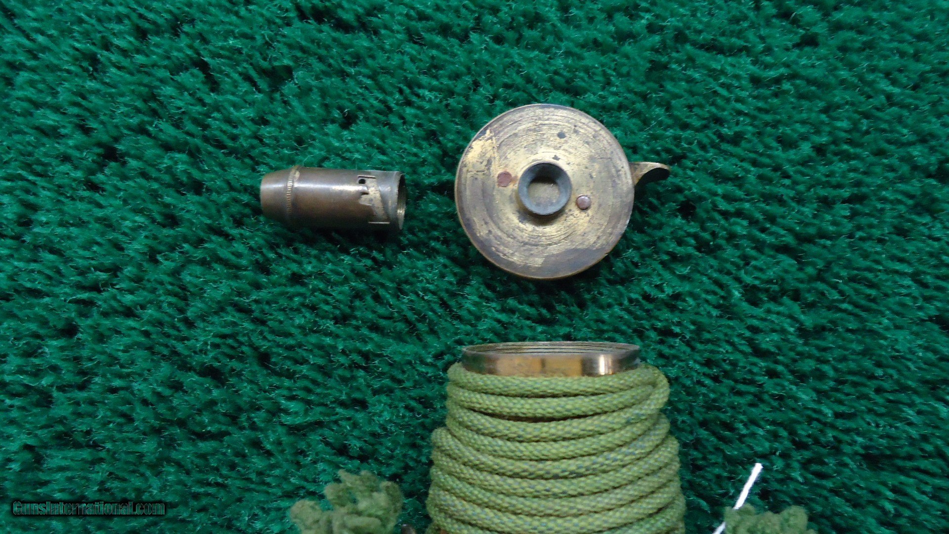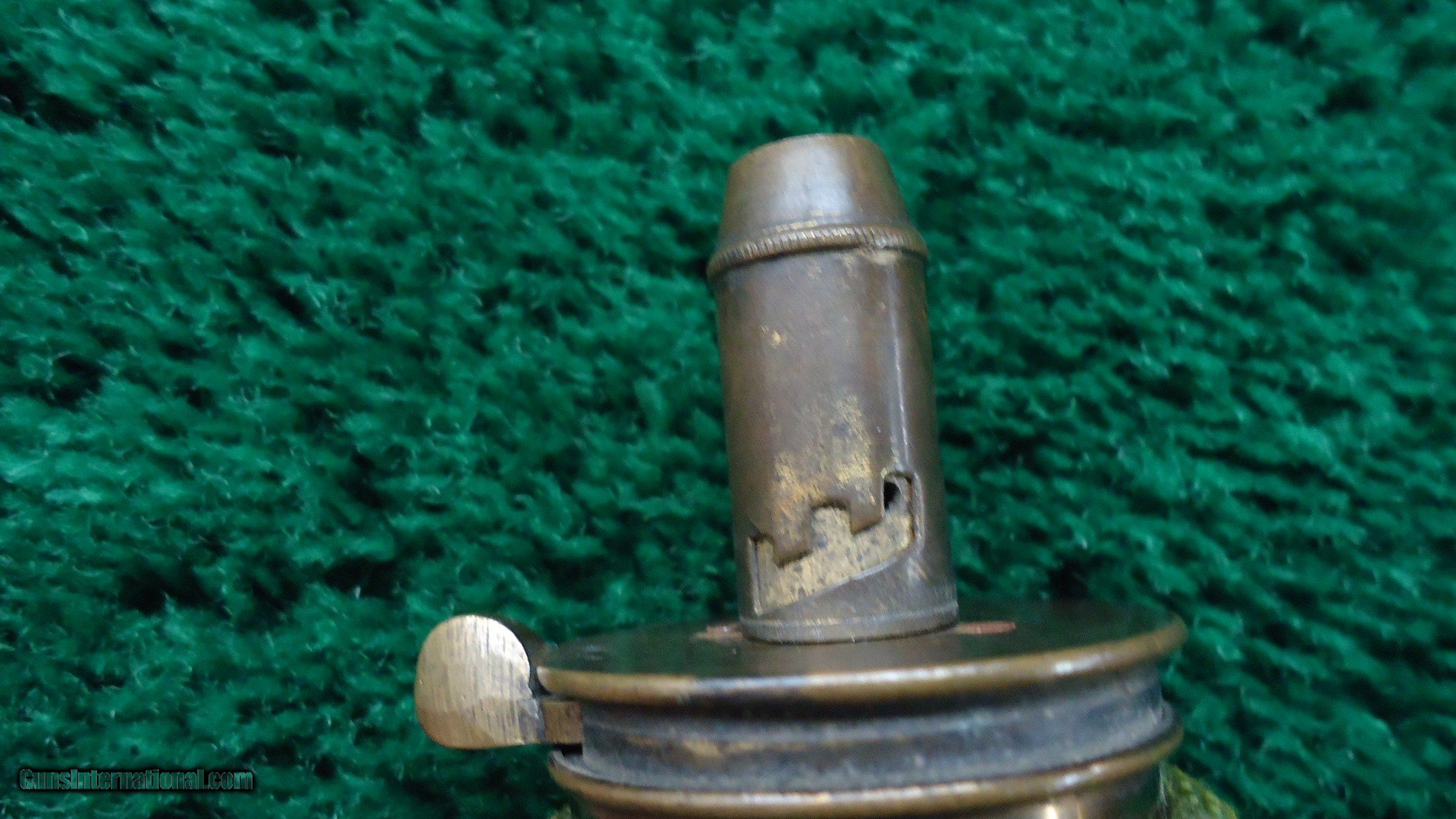 Description: Number 1246 in Riling's book. 6-3/4 inches from the bottom of the body to the bottom of the charger. Die-pressed rawhide flask. The inventor claimed it to be "the most durable flask ever made" with the added advantage of translucence so that the contents could be estimated. 2 eyelets with green carrying strap. Screw-off patented top adjustable with inside spring. Adjustable charger with 3 graduations. Missing the Adjustment Stop Screw. Leroy Merz Antique Firearms specializes in antique and vintage Winchesters and other fine American firearms. Since 1965 Mr. Merz has taken part in the world of firearms and has been a contributor to many well known reference books. We have hundreds of additional guns in every price range at our home online. Search for Merz Antiques in google. SOLD |