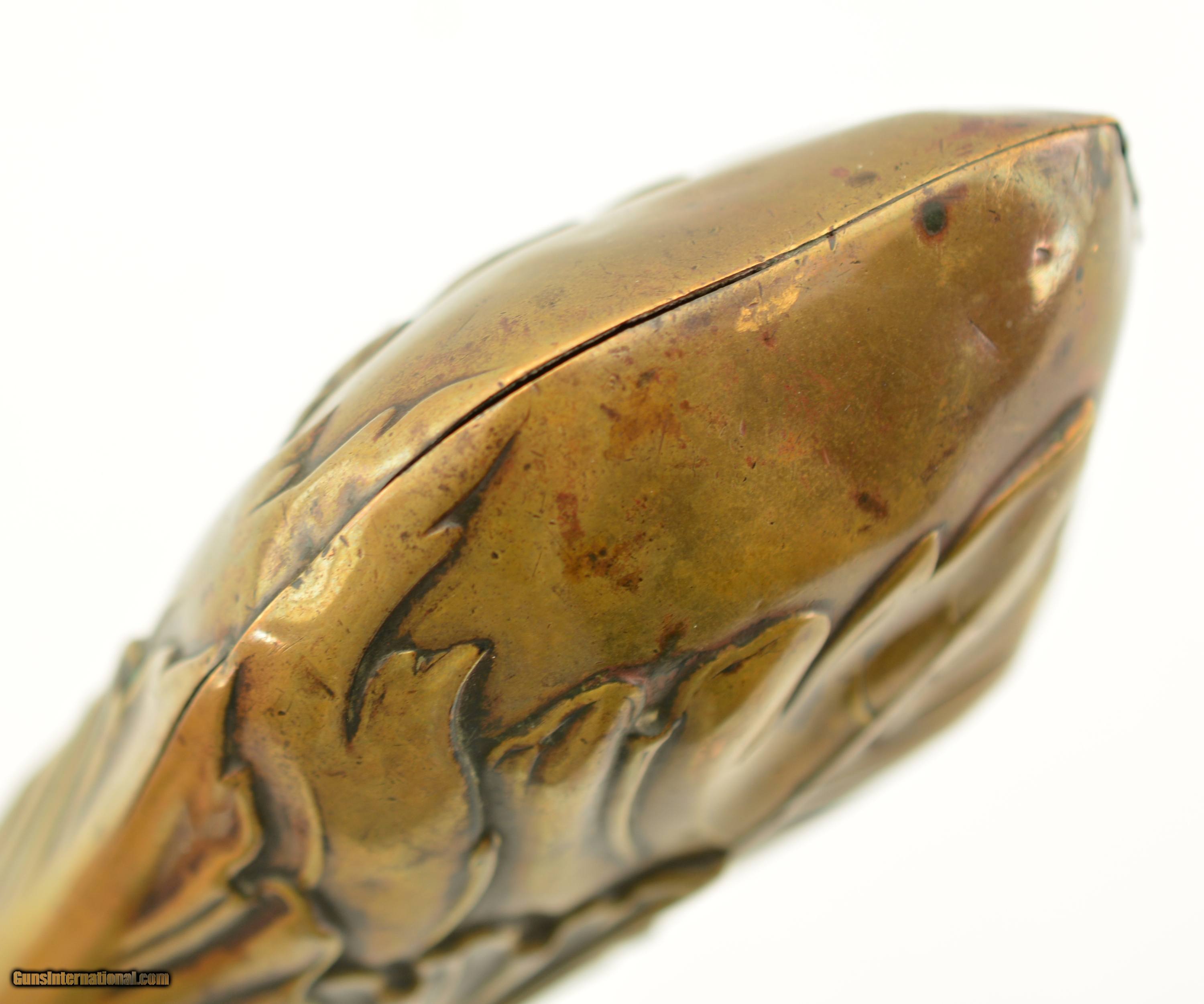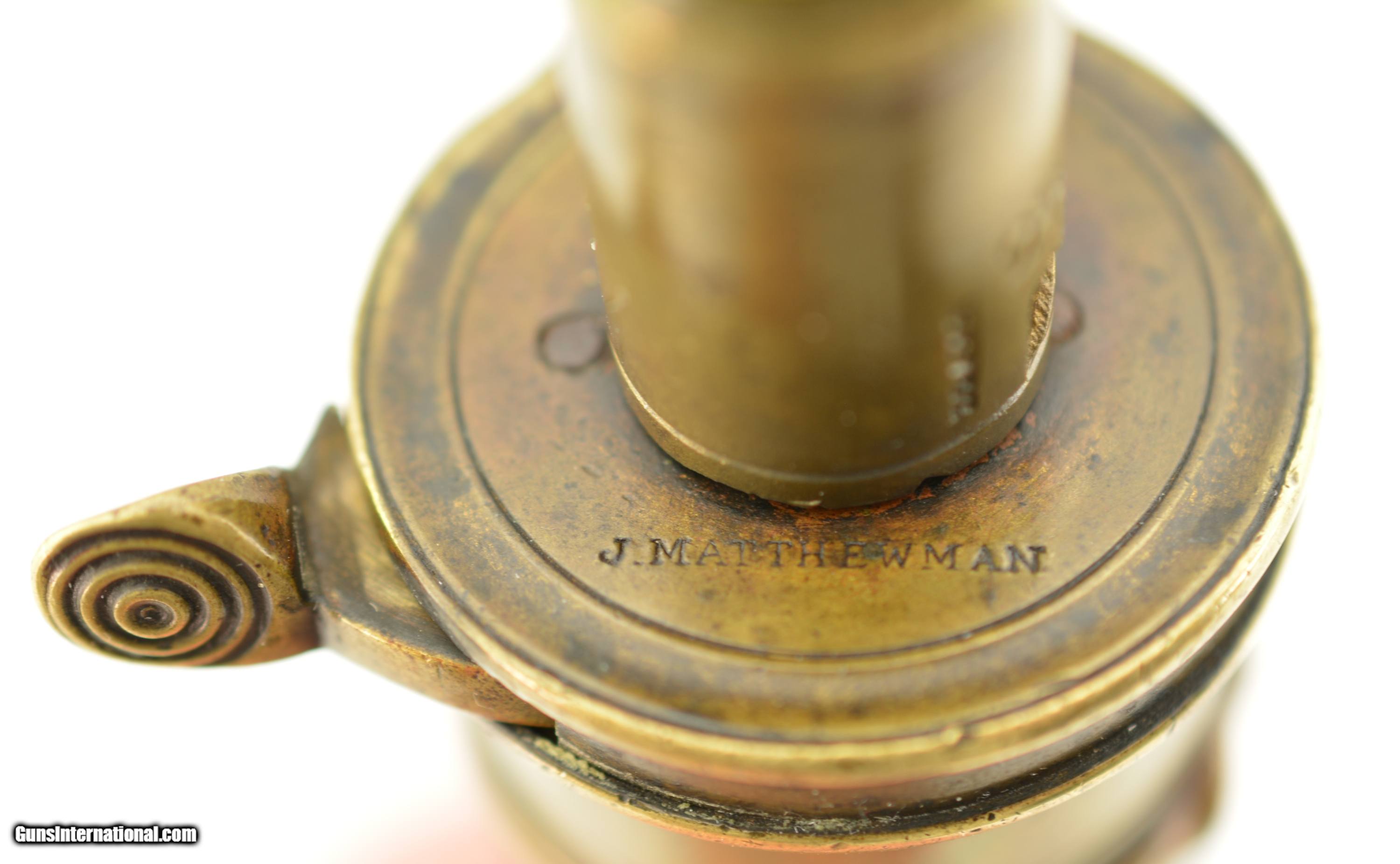 Description: This is an Antique 1840's-60's, J. Matthewman Brass and Copper Powder Flask. The charger is marked on top J. Matthewman for John Matthewman of New Haven CT. This flask can be found on page 325 flask #654 in Riling book. The body is 6 inches with a width of slightly over 3 inches. This flask has been repaired on the bottom right side and is slightly separated on the left bottom. The spring is not operation and the thumb piece moves with no resistance. The patina is a deep rich bronze copper the brass is a shade closer to golden. This flask comes standard with a set of hangers and this one appears not to have had them. An honest period flask in good to very good condition. SOLD |