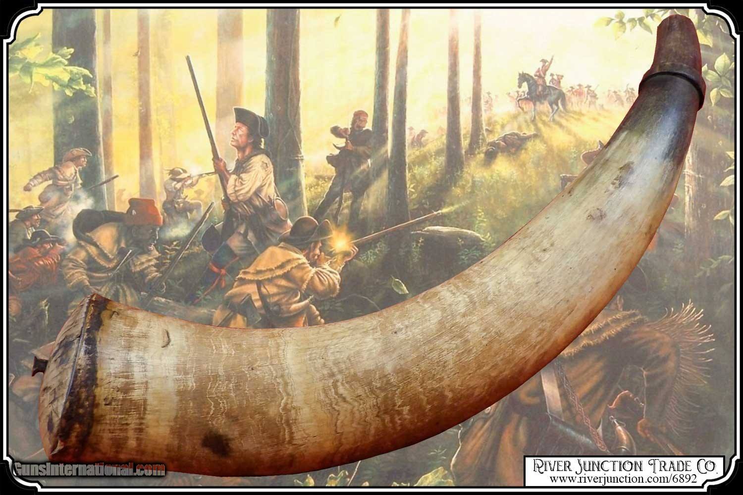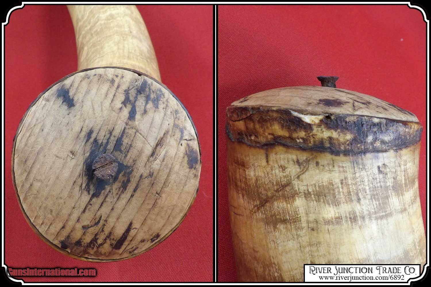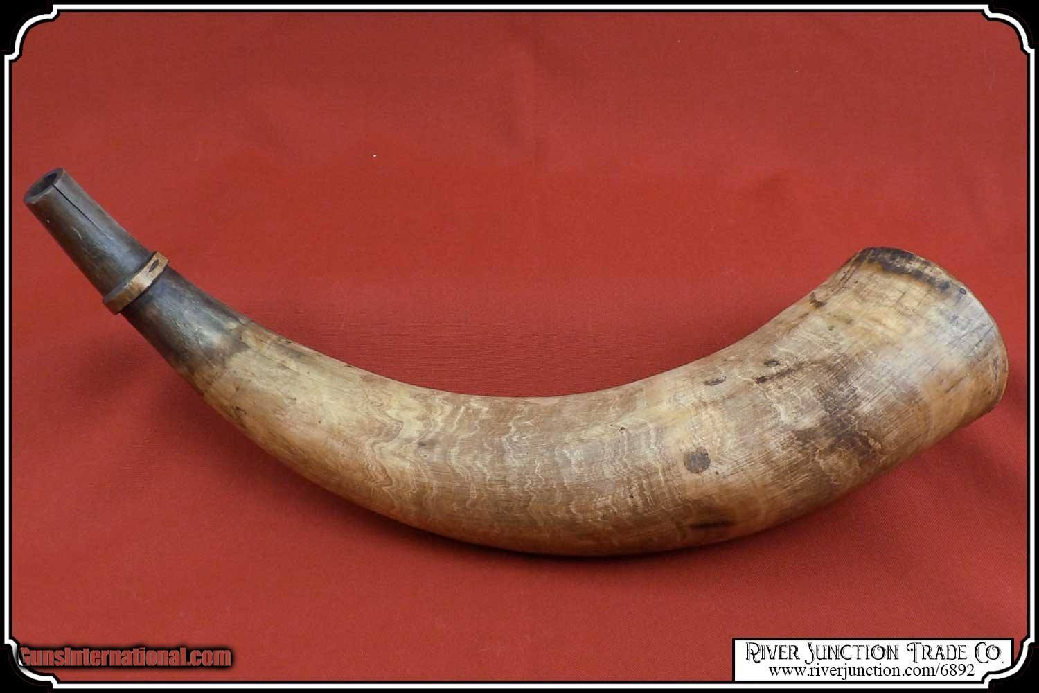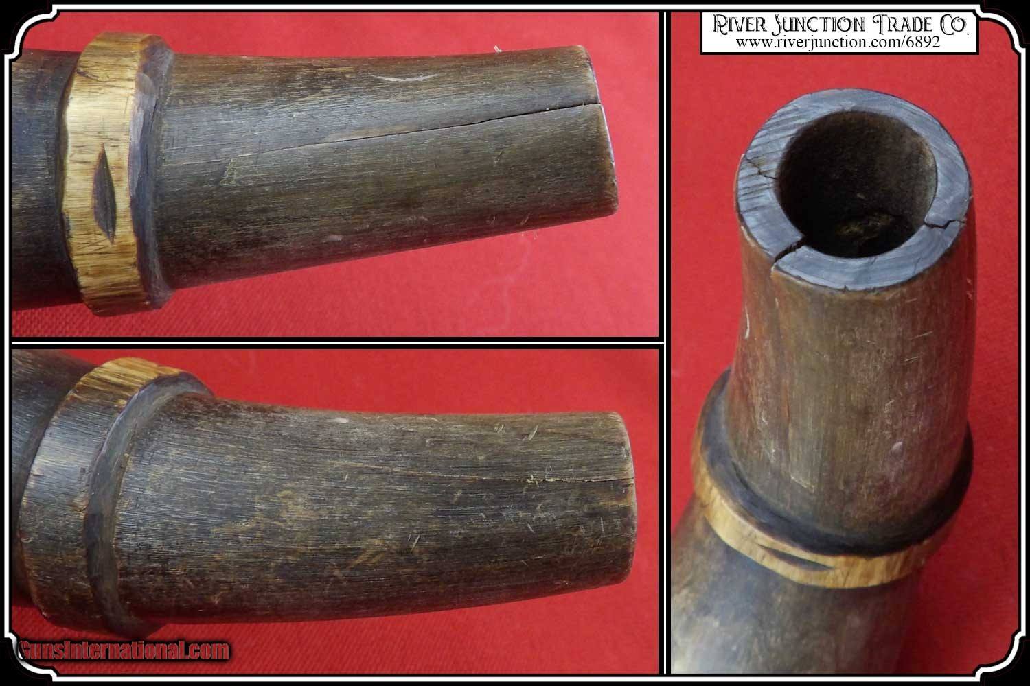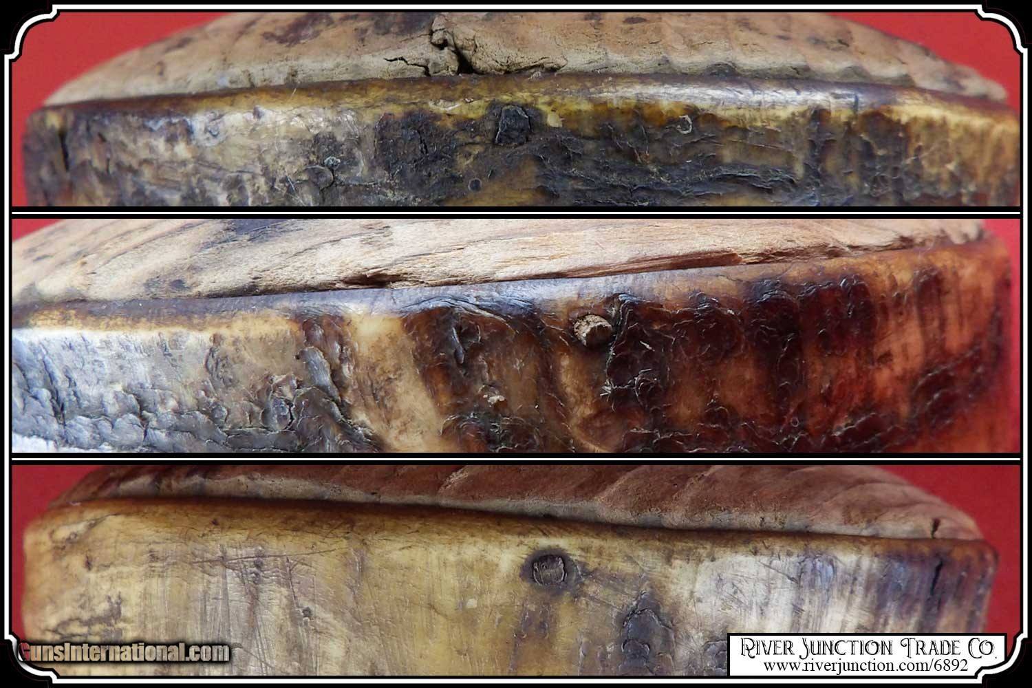 Description: A beautiful Large Powder horn. These large Plain Military Type powder horns are typical of the North Eastern US. It has a beautiful original patina and is in overall very nice antique condition it's quite impressive measuring 17" along the double curve. I guaranteed it to be of the late 1770s, or earlier. The photos give an accurate description of flaws and damage if any, so please spend time examining them. A large antique powder horn with a wonderful natural patterning that only mother nature can provide. Close examination of the plug shows small square nail heads and fact that another is completely missing. The large wood plug looks to have been hand turned on a primitive lathe. Rather than a metal staple a rusty screw provides a location for a carry strap.. That strap has long gone missing. There are no moth chews that I can find. The horn surface has a beautiful caramel colored patina with a very well executed collar then tapered to the spout. The spout plug is missing. Other items show are not included. This is a really a beautiful horn showing the the age of two centuries and more. Price: $250.00 Buy Now Contact Seller |