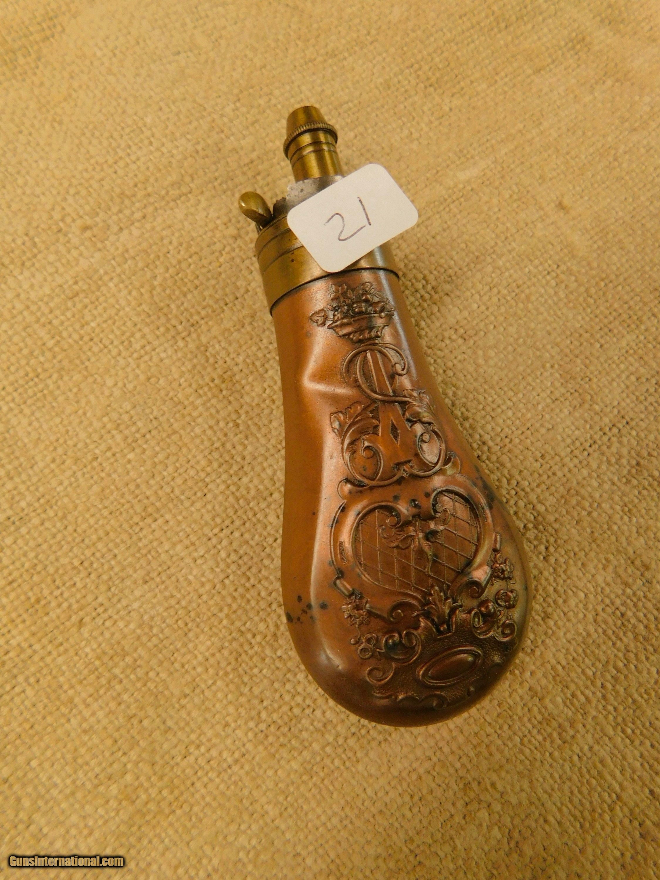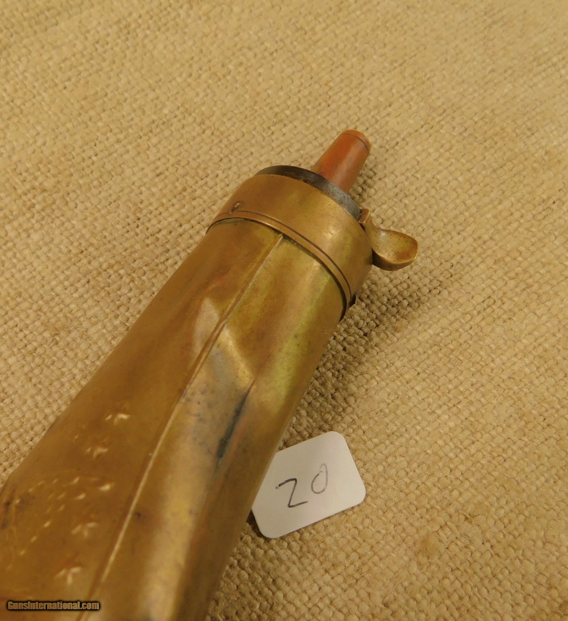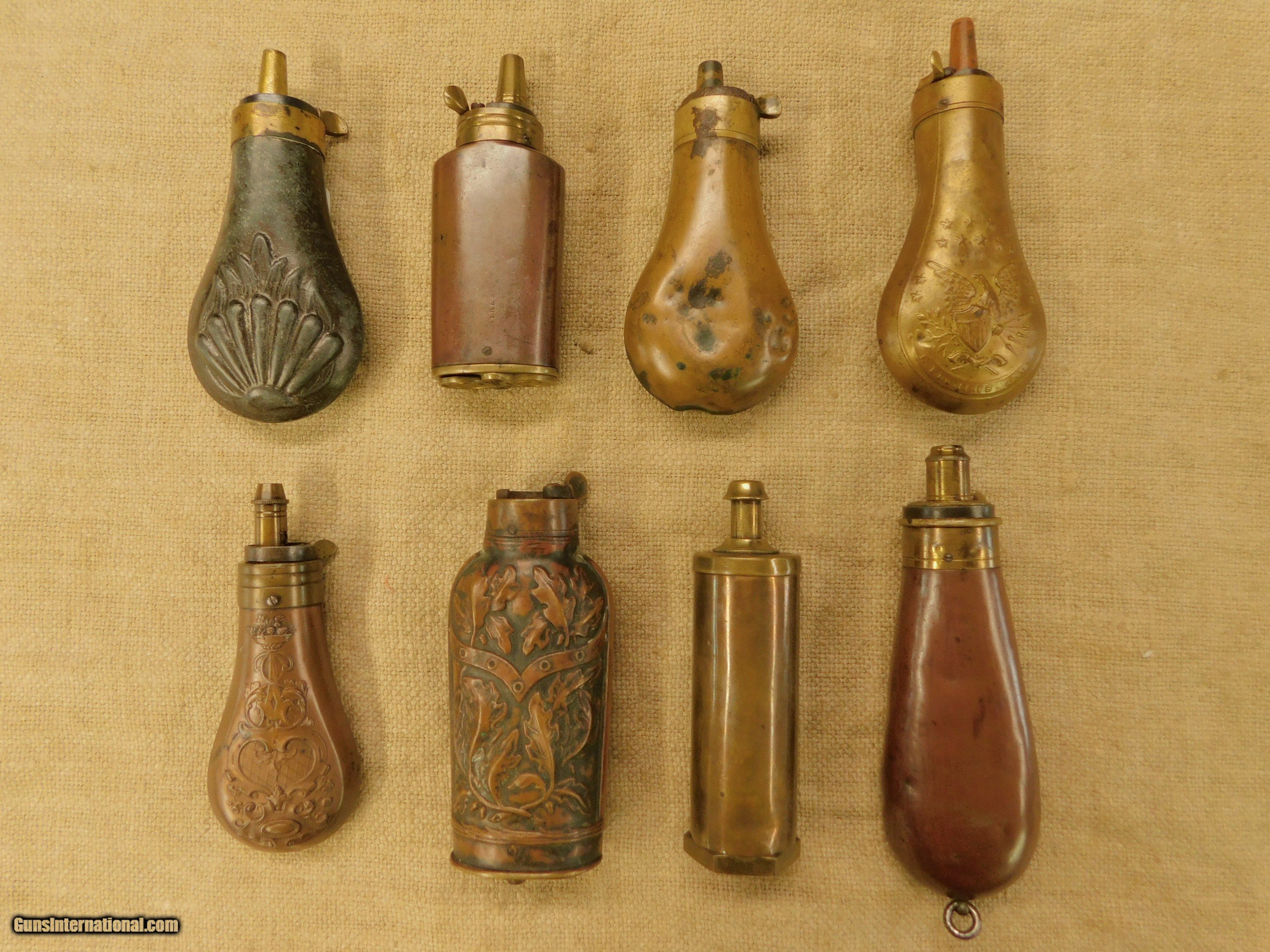 Description: Offered is a lot of 8 small powder flasks. Seams are good. No. 18 is a compartment flask; No. 24 is marked C & J.W. Hawksley. Regarding condition, Nos. 19, 20 & 21 have dents. No. 22 is a compartment flask. It is missing the charger & spring, and is also dented. Please look over the photos carefully to help determine condition. Price was $1625.00. Redueced to $1425.00 which includes shipping, USPS Priority Mail. Payment can be made with USPS money order or bank check. SOLD |