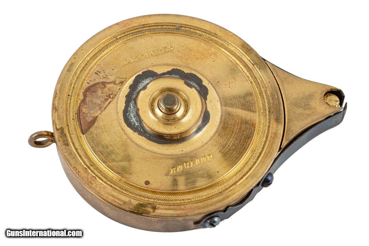 Description: PERCUSSION CAP DISPENSOR, BY KEN STEGGLES, ENGLAND CIRCA 1970'S BRASS SNAIL BODY WITH SCREW RETAINED LID, SPRUNG ROTARY CAP MECHANISM ON THE INSIDE, BLUED SPRING STEEL CAP RETAINERS ON THE OUTSIDE EMAIL INQUIRY ONLY ON NON GUN ITEMS PAYMENT BY CHECK OR MONEY ORDER ONLY ON NON GUN ITEMS FREE SHIPPING SOLD |
