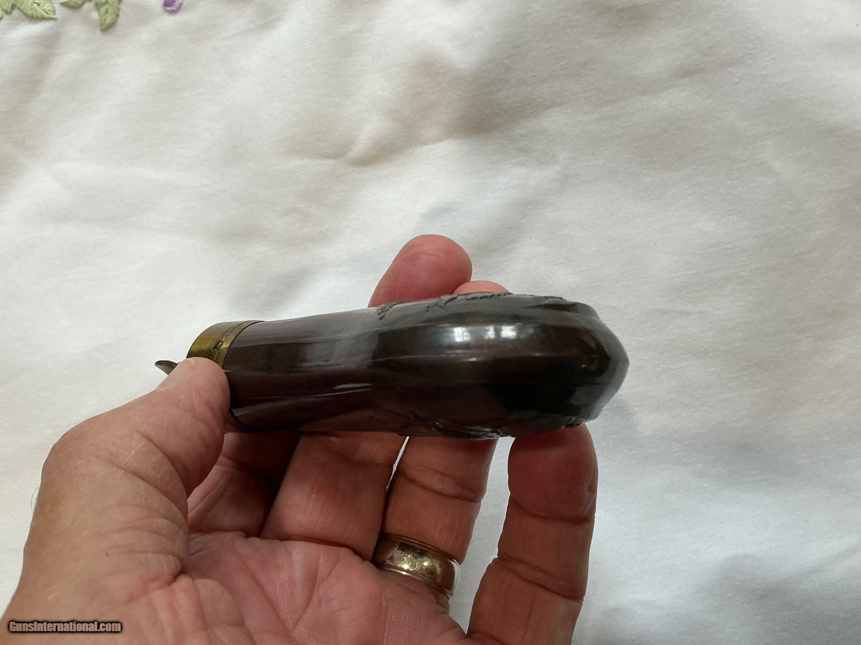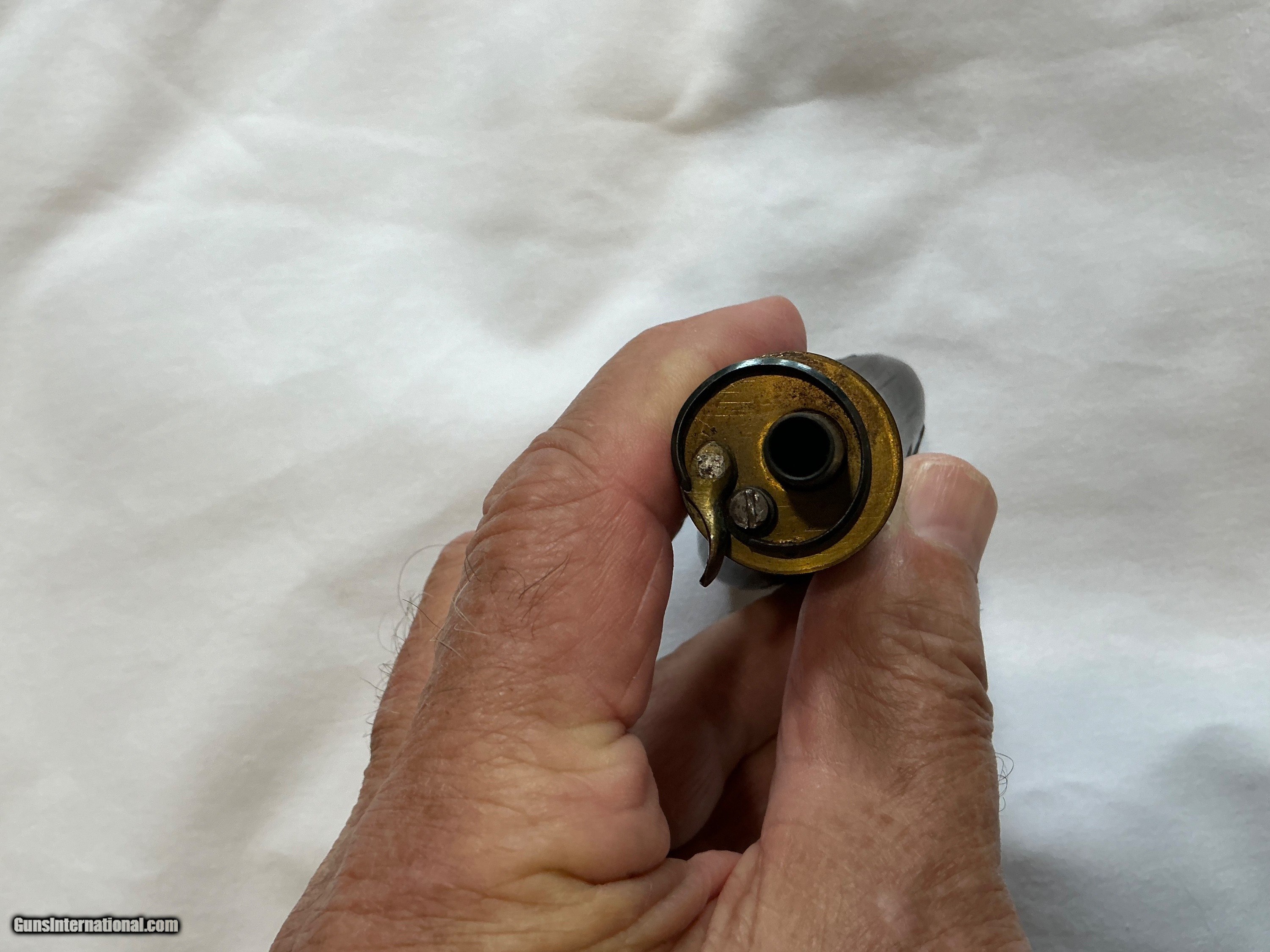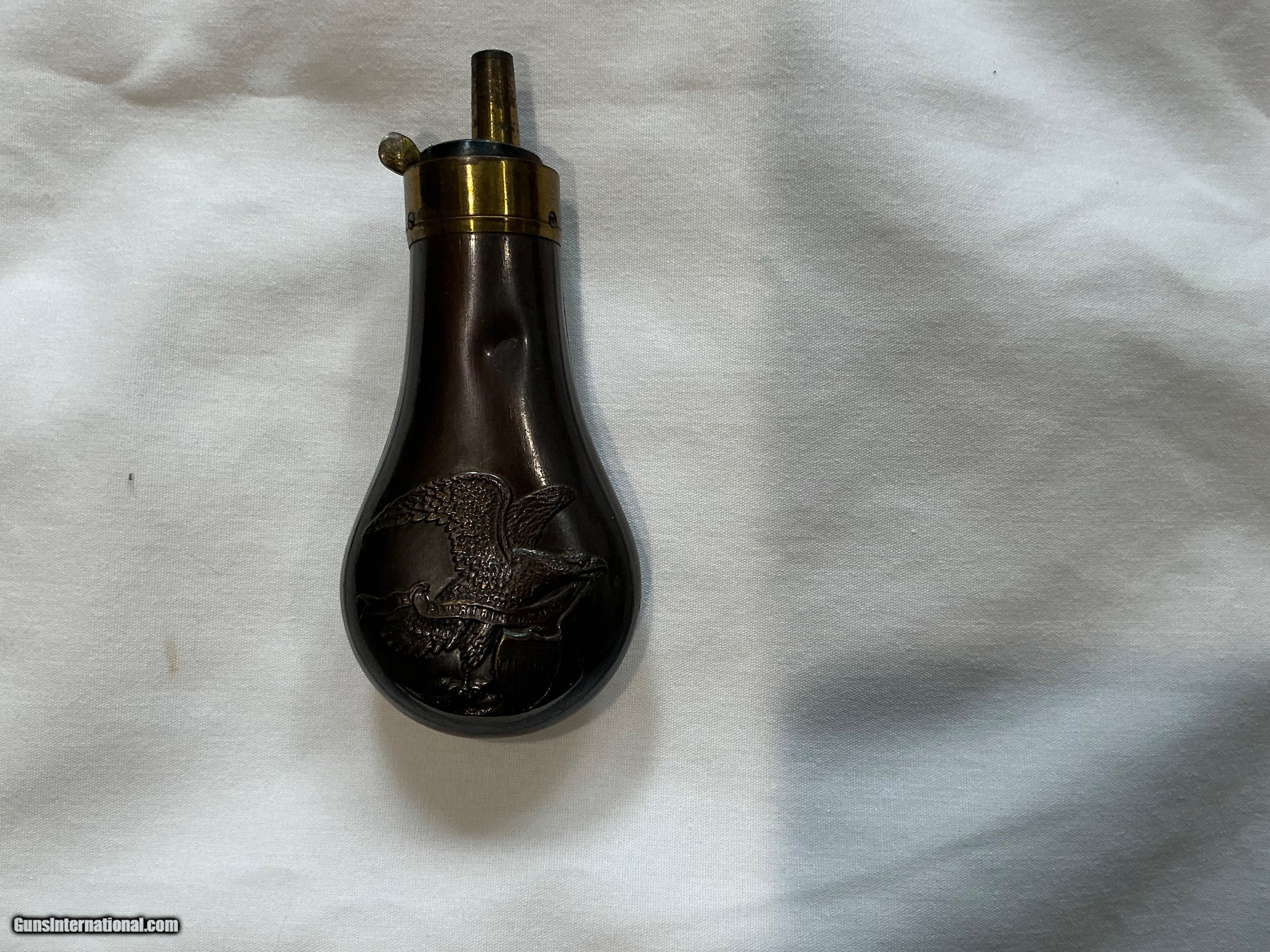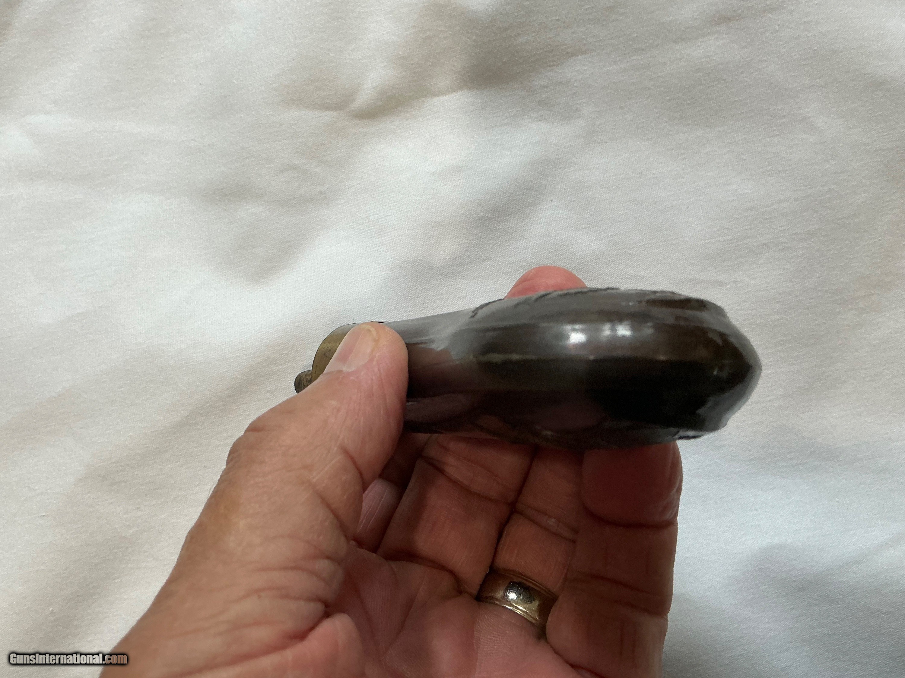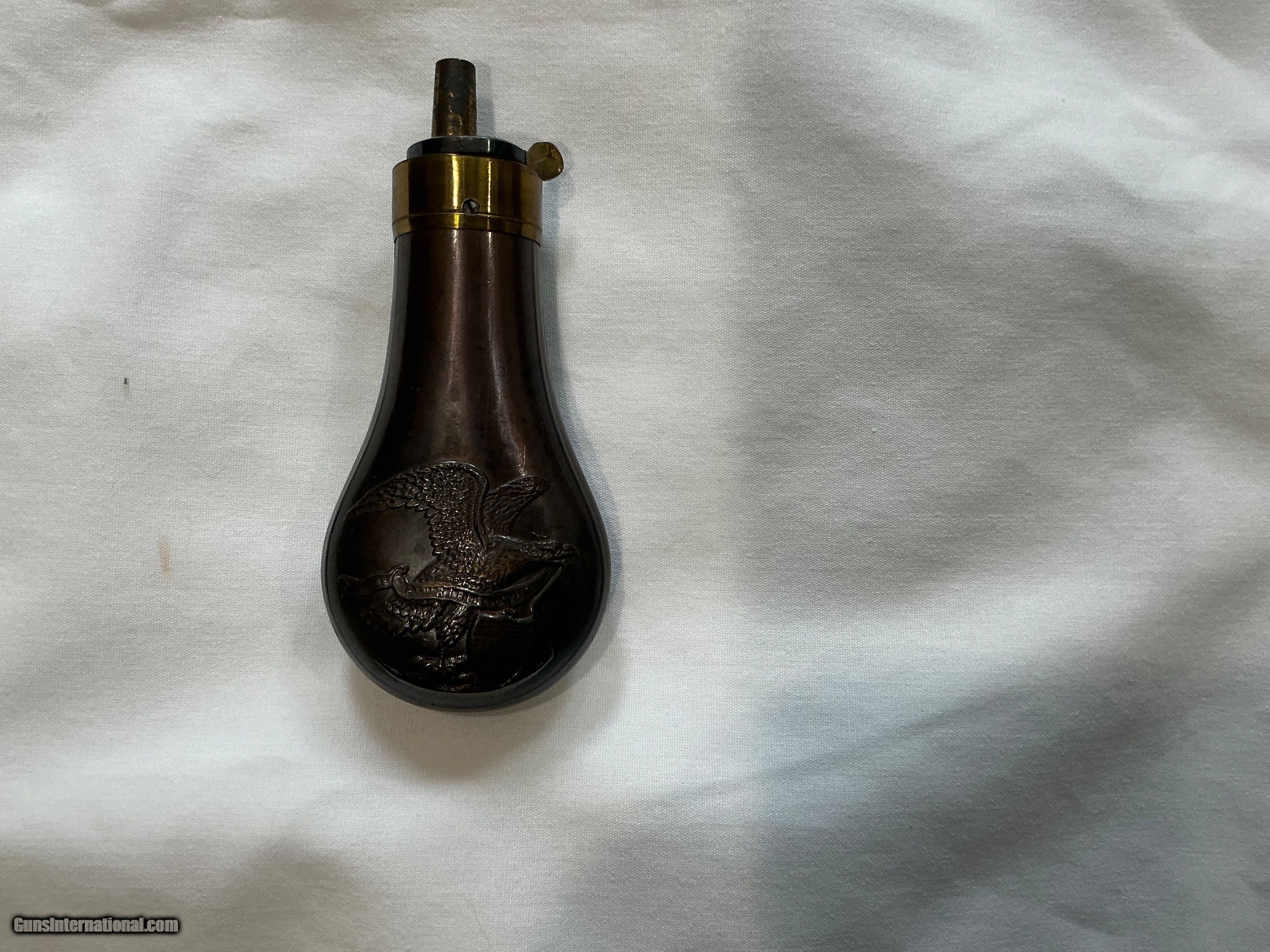 Description: SALE PENDING 9/6/24 Small spread eagle flask for pocket revolvers often found in Cased 1849 Colt Pockets but not Colt specific. Flask is in near mint condition with near 100% lacquer remaining and nitre blue spring. Fully functional with seam intact all around. Only flaw is one shallow horizontal dent on one side of flask as seen in photo. Questions and requests for additional photos encouraged Final negotiated price includes shipping to lower 48. SOLD |