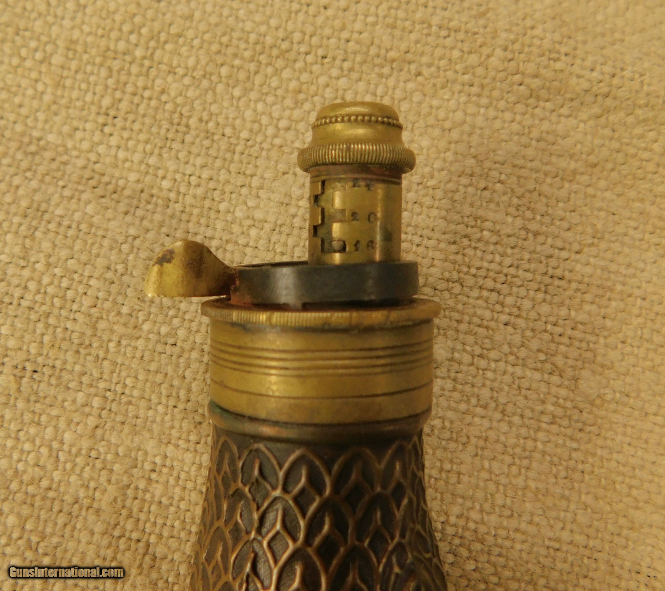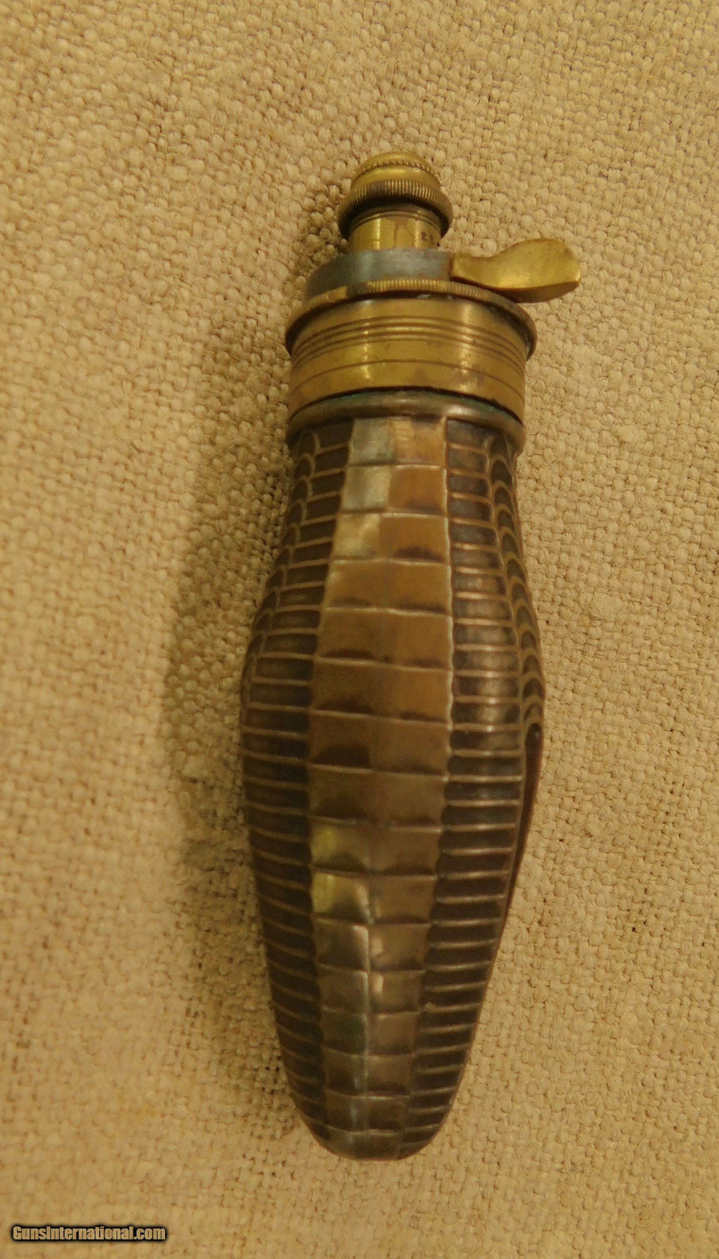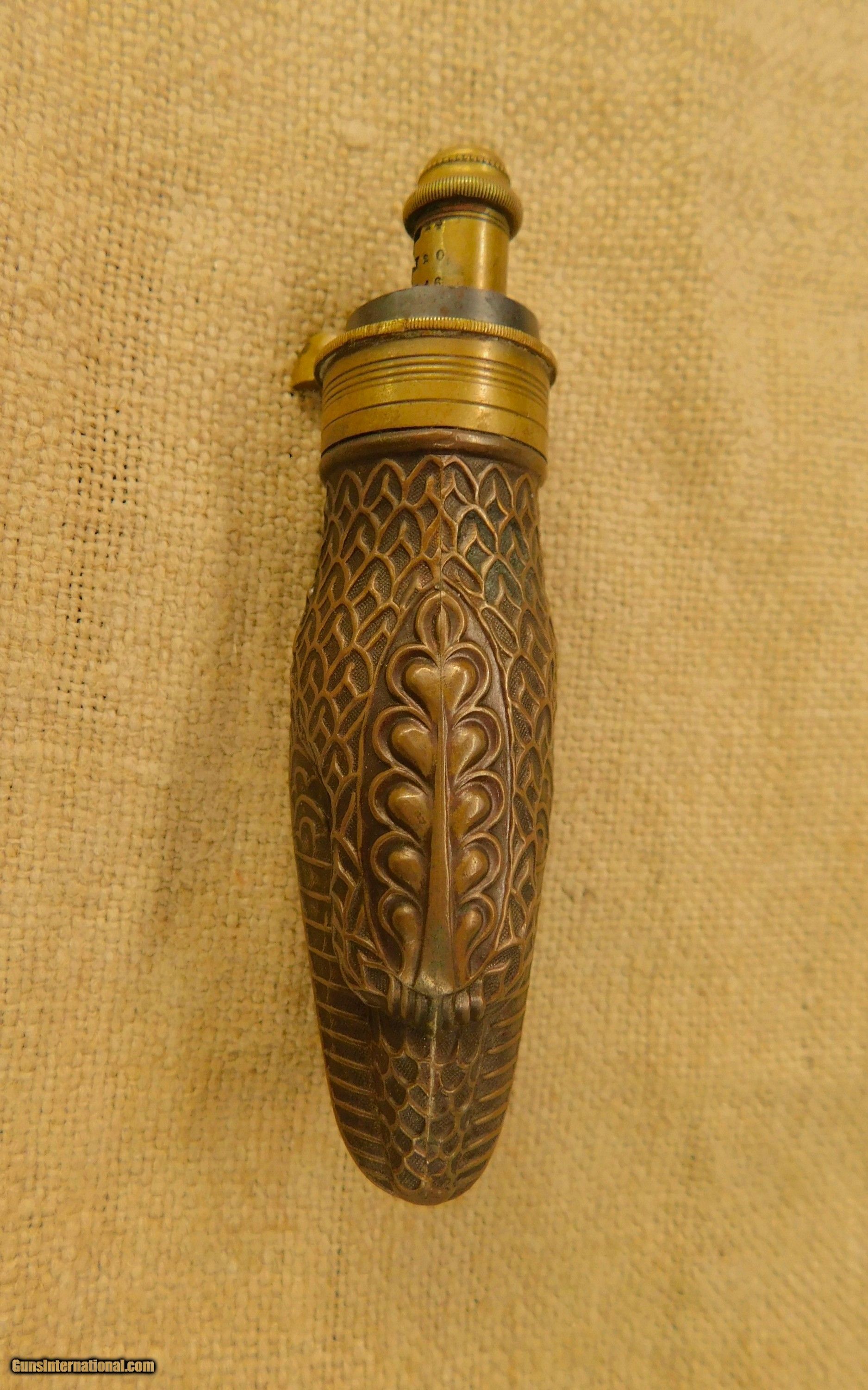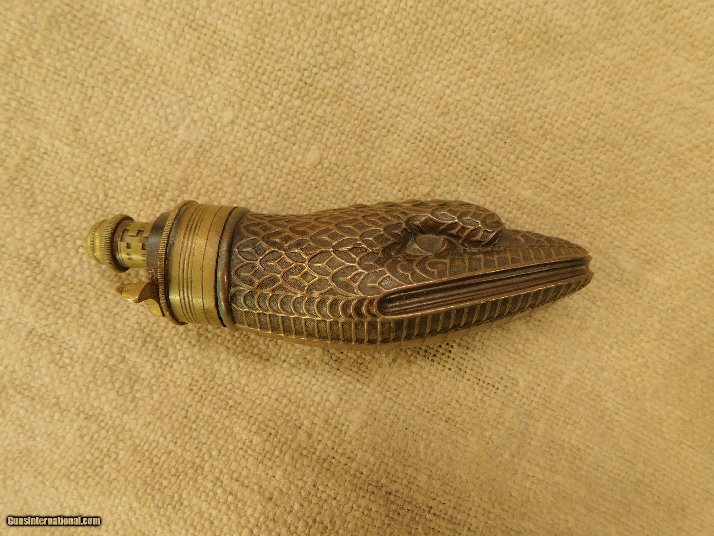 Description: Offered is a scarce flask (Riling 1259). In very good condition with good spring, no seam issues. Overall length is 4 1/4". On page 410 of Riling’s “The Powder Flask Book”, he offers the following description: “… Three views are shown of the rare flask Figure 1259. This common top French flask of copper is formed and decorated to represent the head of a serpent. Although it was die impressed and therefore presumably made in production, we know of only one specimens of this flask.” $1350.00. Payment can be made with USPS Money Order or Bank Check. Add $20.00 postage, USPS Priority Mail. SOLD |