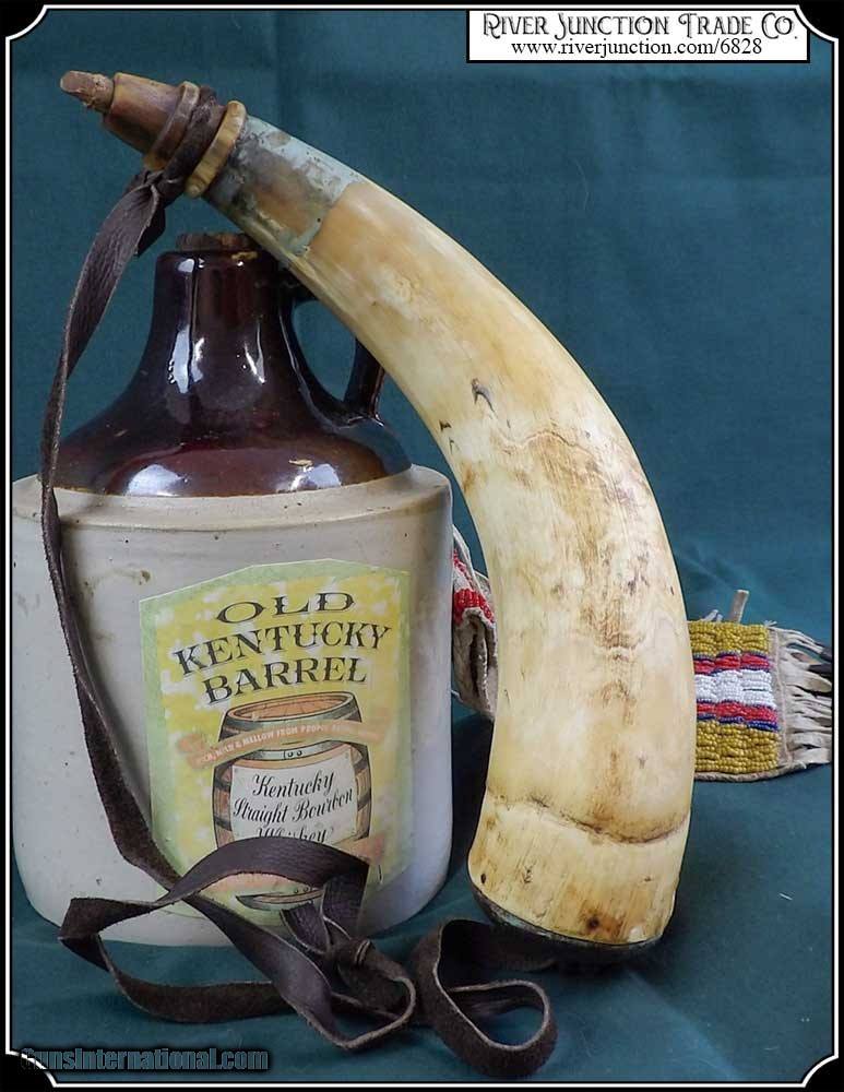 Description: ORIGINAL ANTIQUE: COLONIAL/AMERICAN REVOLUTIONARY WAR PERIOD AMERICAN POWDER HORN ca.1750-1770: In overall good + untouched condition and a classic mid-18th Century Colonial American form with a wooden base-plug and a chip-carved/turned and collared pouring-spout. Natuaul colored cow-horn surfaces with traces of colonial blue milk paint on the base-plug. Of medium-size with a carved neck pouring-spout-collar and its original carved, convex, reddish-brown-colored, hardwood (walnut?) base-plug. Original square-shank-tacks and complete with its rust iron eye screw for a suspension cord. In overall untouched condition with a few minor moth chews and wear. Minor scuffs, abrasions and smooth. Below the collar is a blue milk paint painted band about 1 1/2 inches wide. Overall length, approx. 15” including the original stopper and eye screw. For similar examples, please see Neumann & Kravic's: "Collector's Illustrated Encyclopedia of the American Revolution". SOLD |