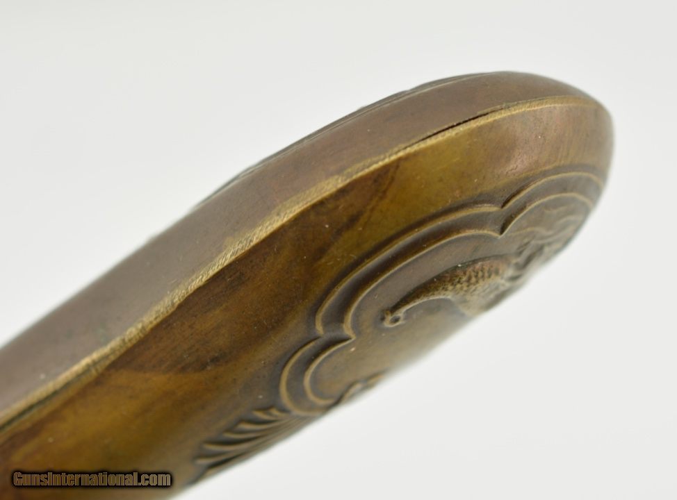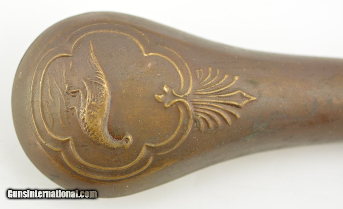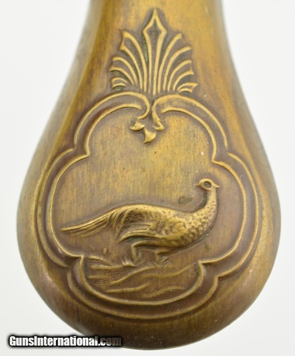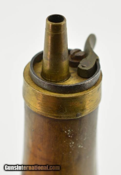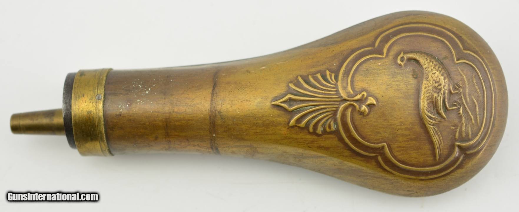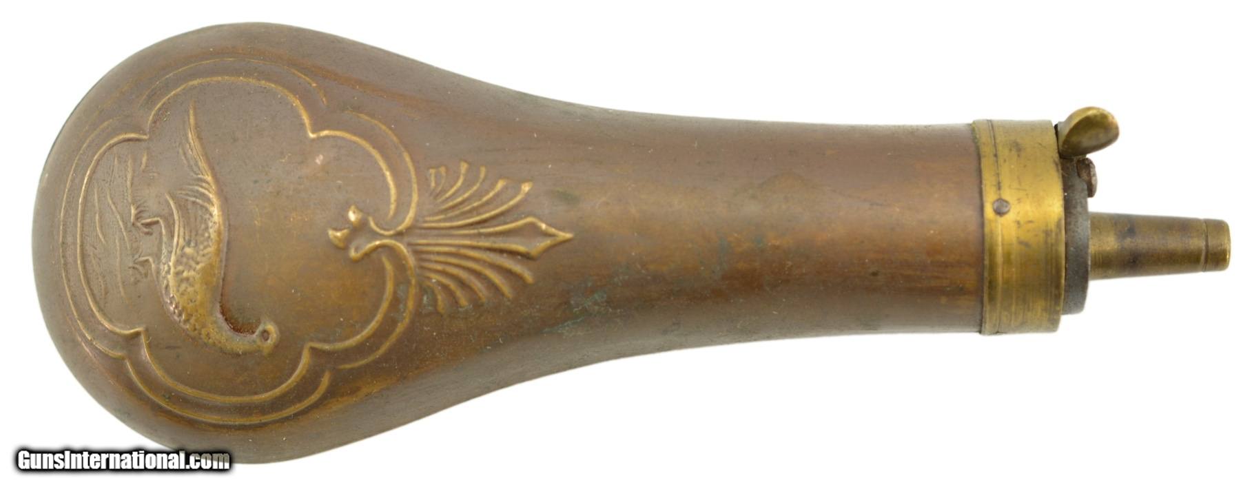 Description: This is an unidentified flask shown on page 333 in Ray Rilings "The Powder Flask Book", this is most-likely French and is in excellent condition with a working common top, removable charger and excellent patina, with one side having a different patina. Tiny split near the bottom. Over-all all in Excellent condition. 5 3/4X2 1/8" in size. SOLD |