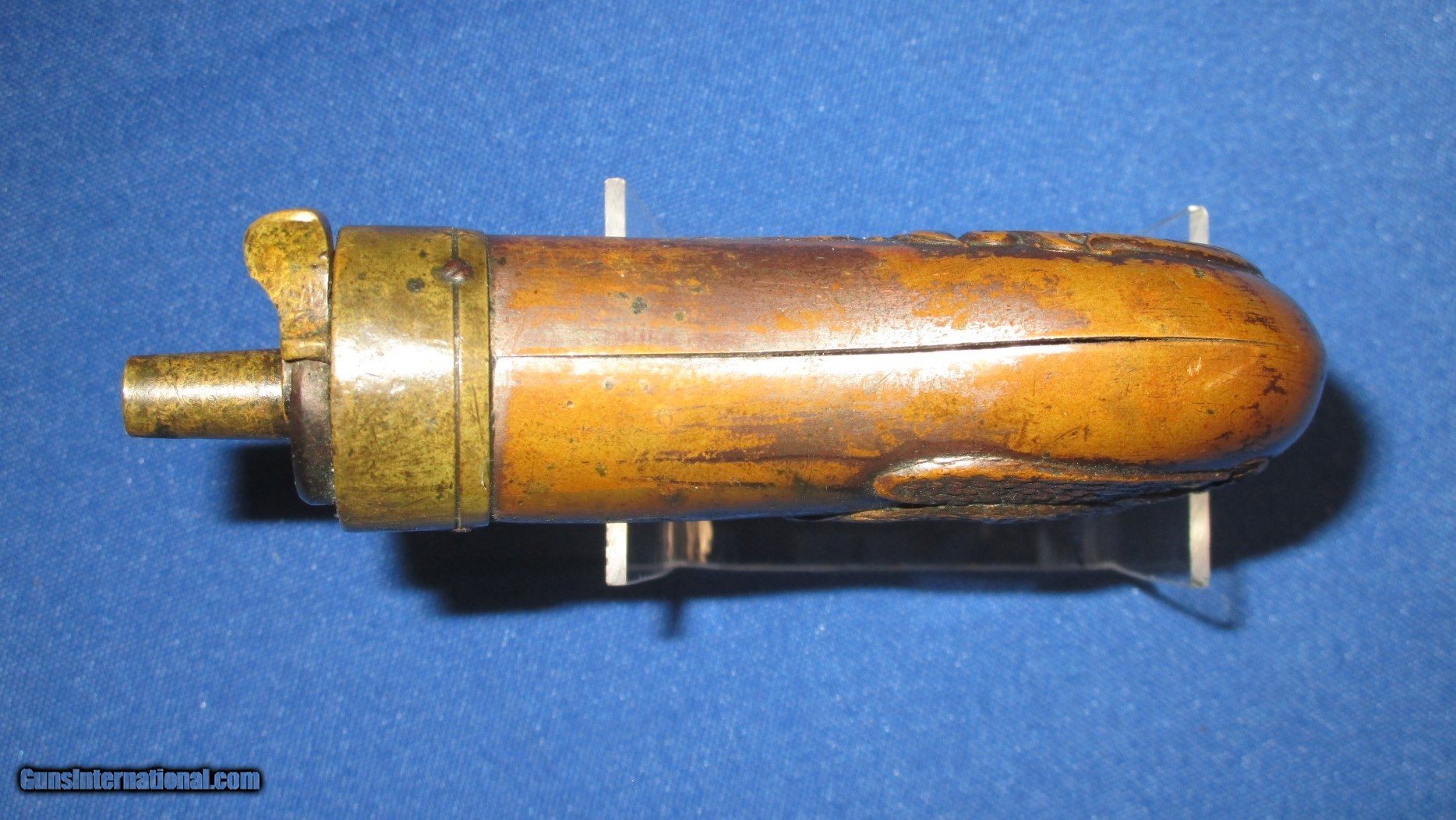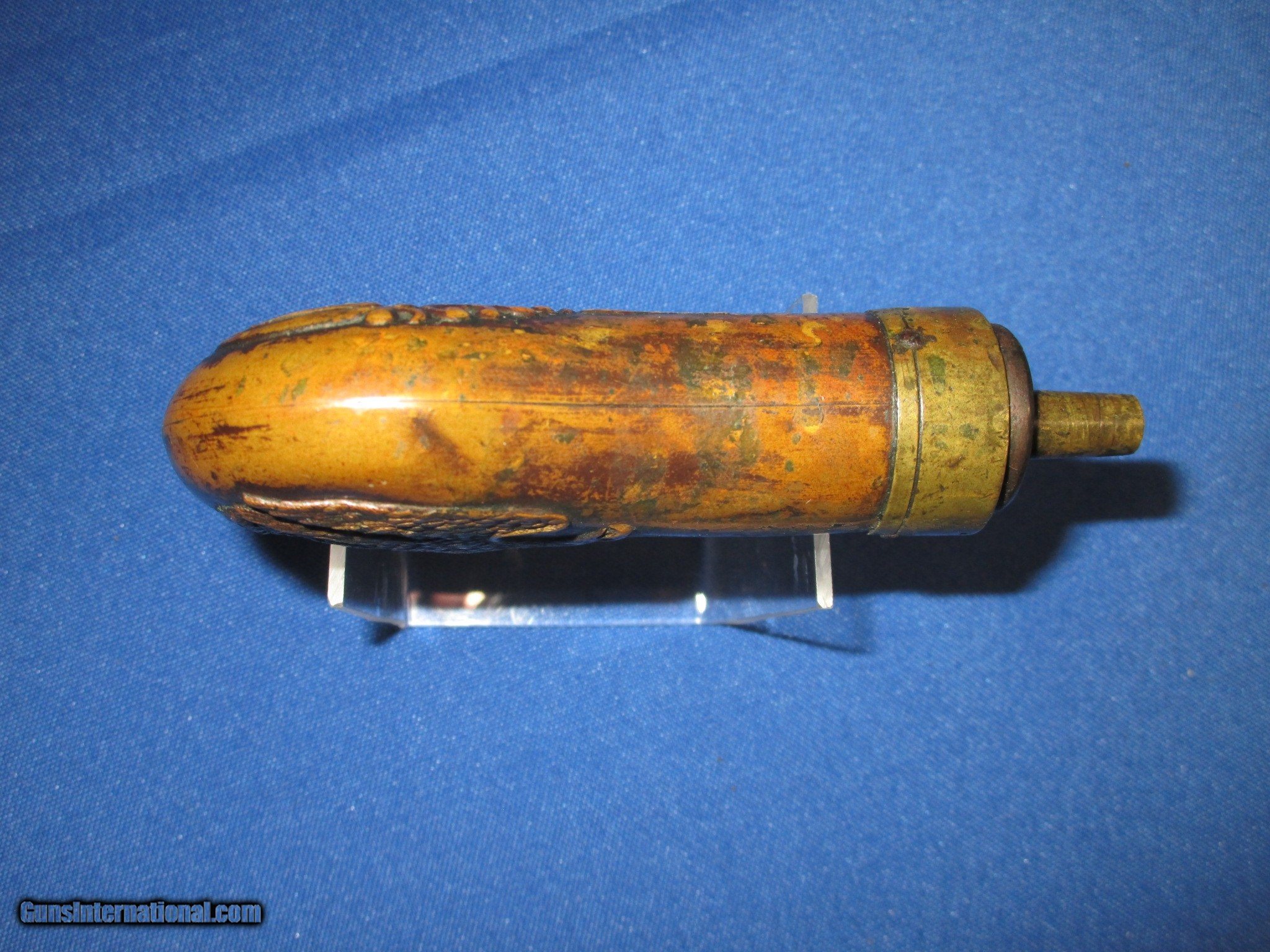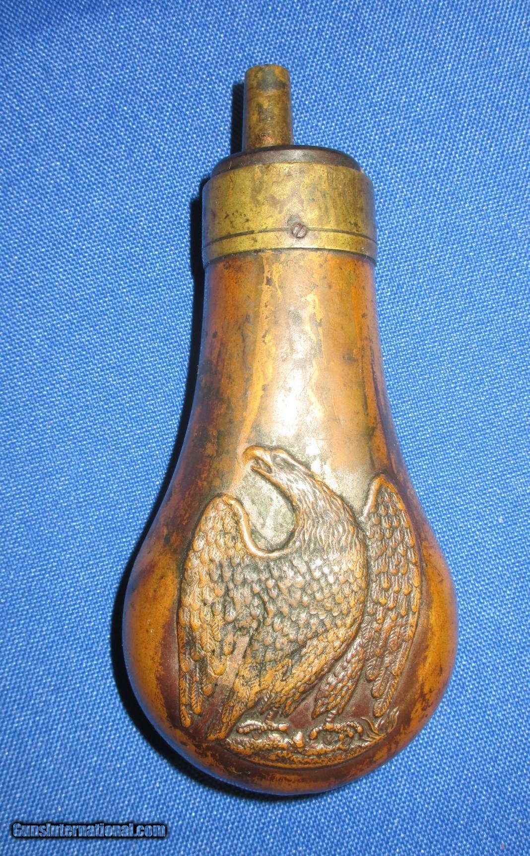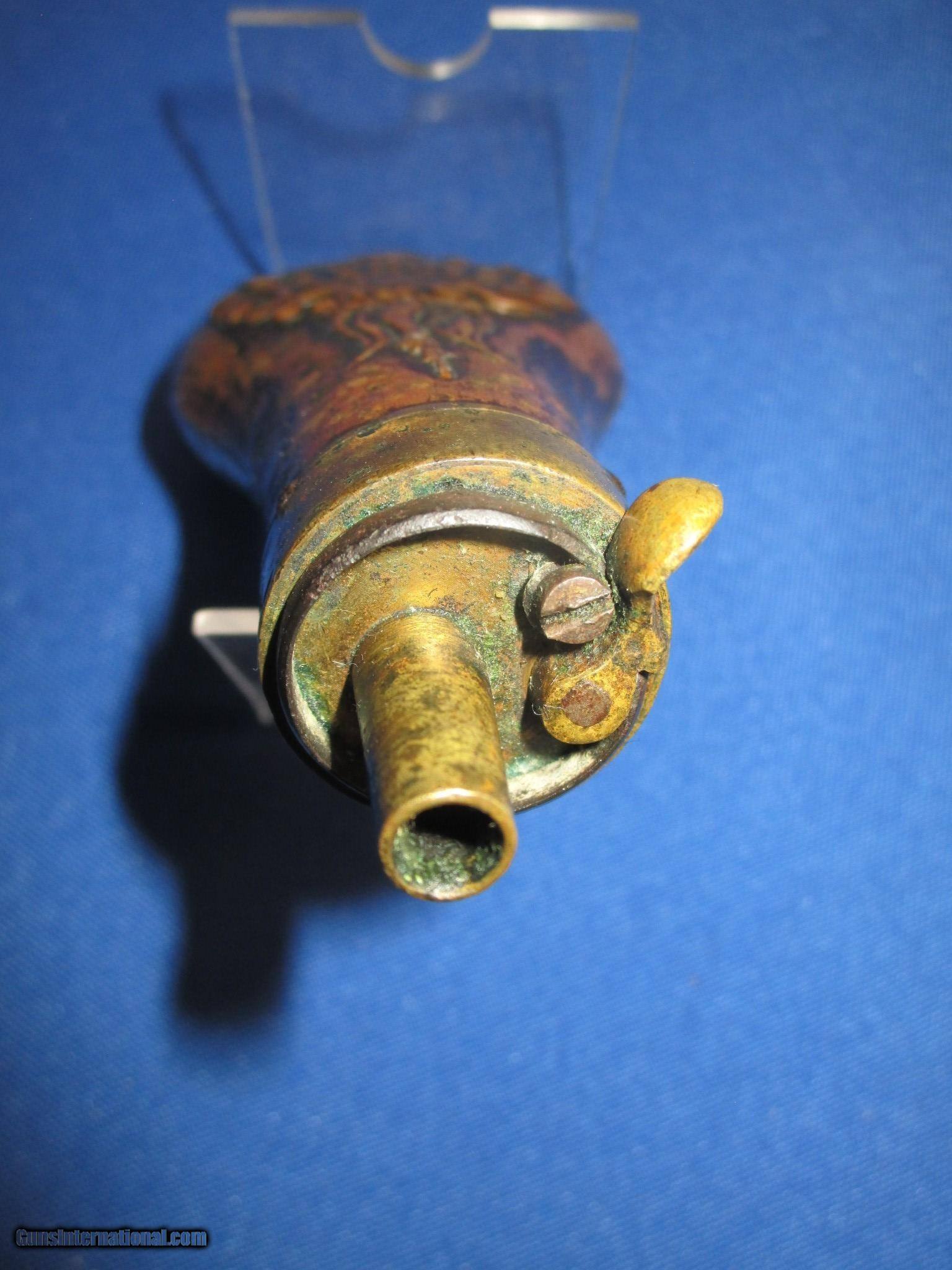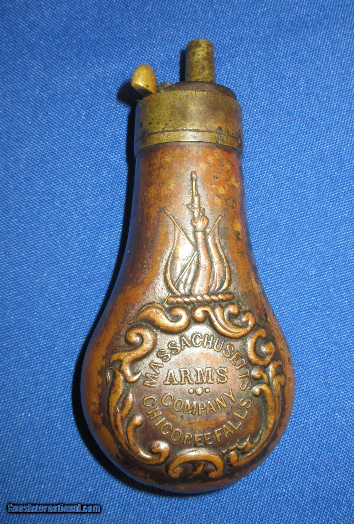 Description: This is a Scarce Civil War Era Mass. Arms, John Brown Belt Model Flask in nice Condition. The Flask is all original and works fine. The Flask is two sided with an Eagle on one side and Massachusetts Arms Company on the other side. There is a very small opening in the seam on one side. SOLD |