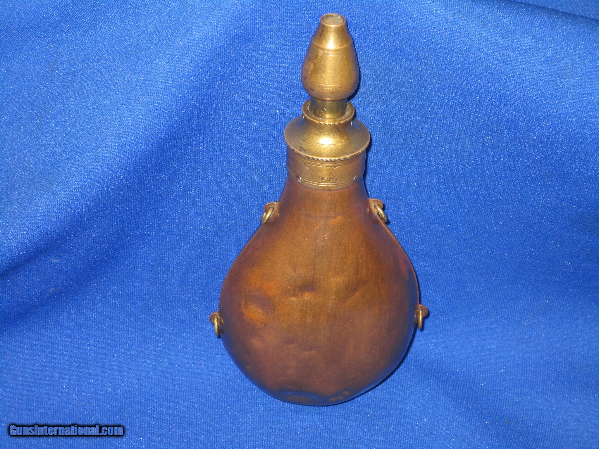 Description: This is a Very Early and Rare Powder Flask for a Colt Model 1839 Patterson Revolving Carbine in Nice Untouched Condition. The Flask is all original and complete. The rare flask has a fine body with tight seams all around. It is marked "PATENT" on the top brass rim. There is a small dent and a few tiny dings in it as shown in the photos. The entire flask has a wonderful natural patina on it. The original plunger top is fine throughout with a wonderful color to it. The flask measures 8 inches tall and 3 1/2 inches at the widest point. This Is A Nice Untouched Example Of A Very Rare & Desirable Colt Model 1839 Patterson Revolving Carbine Powder Flask. There Are Very Few Of These Patterson Flasks In Existence! SOLD |