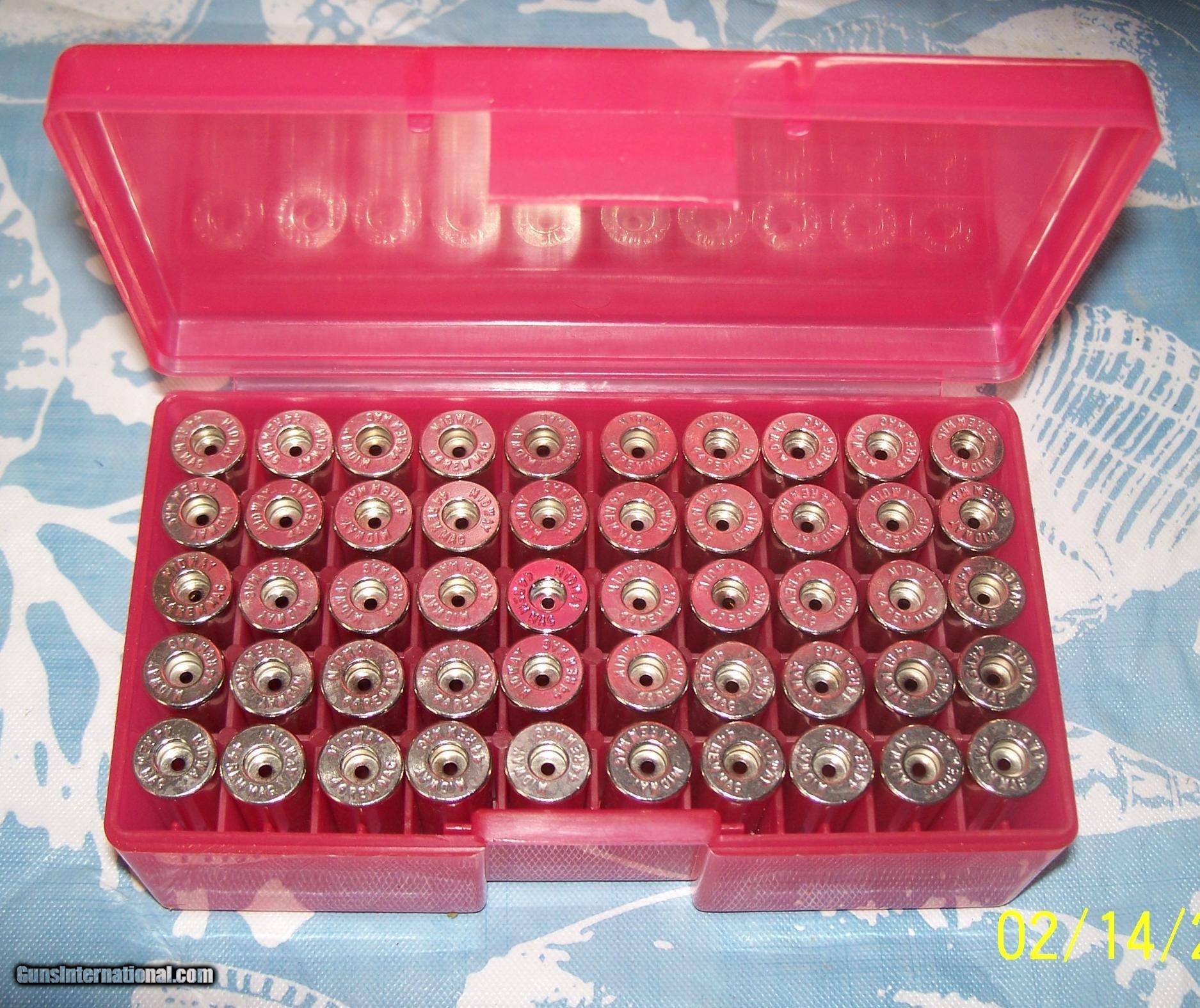 Description: 44 Magnum nickel plated brass by Midway, new, unfired, 50 empty cases with plastic box, as shown. Shipping is $12. SOLD |