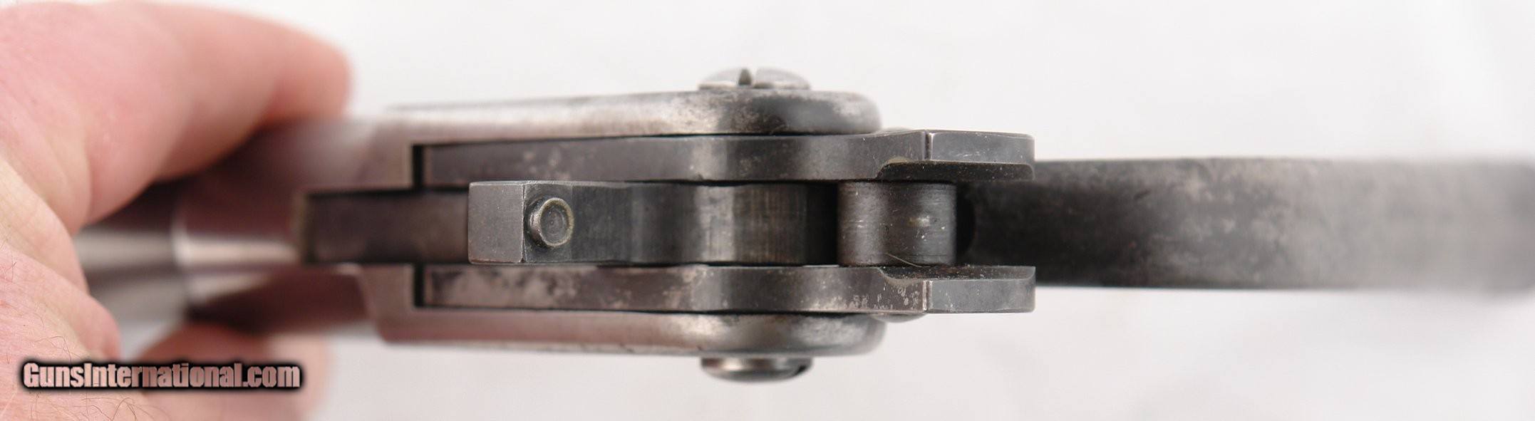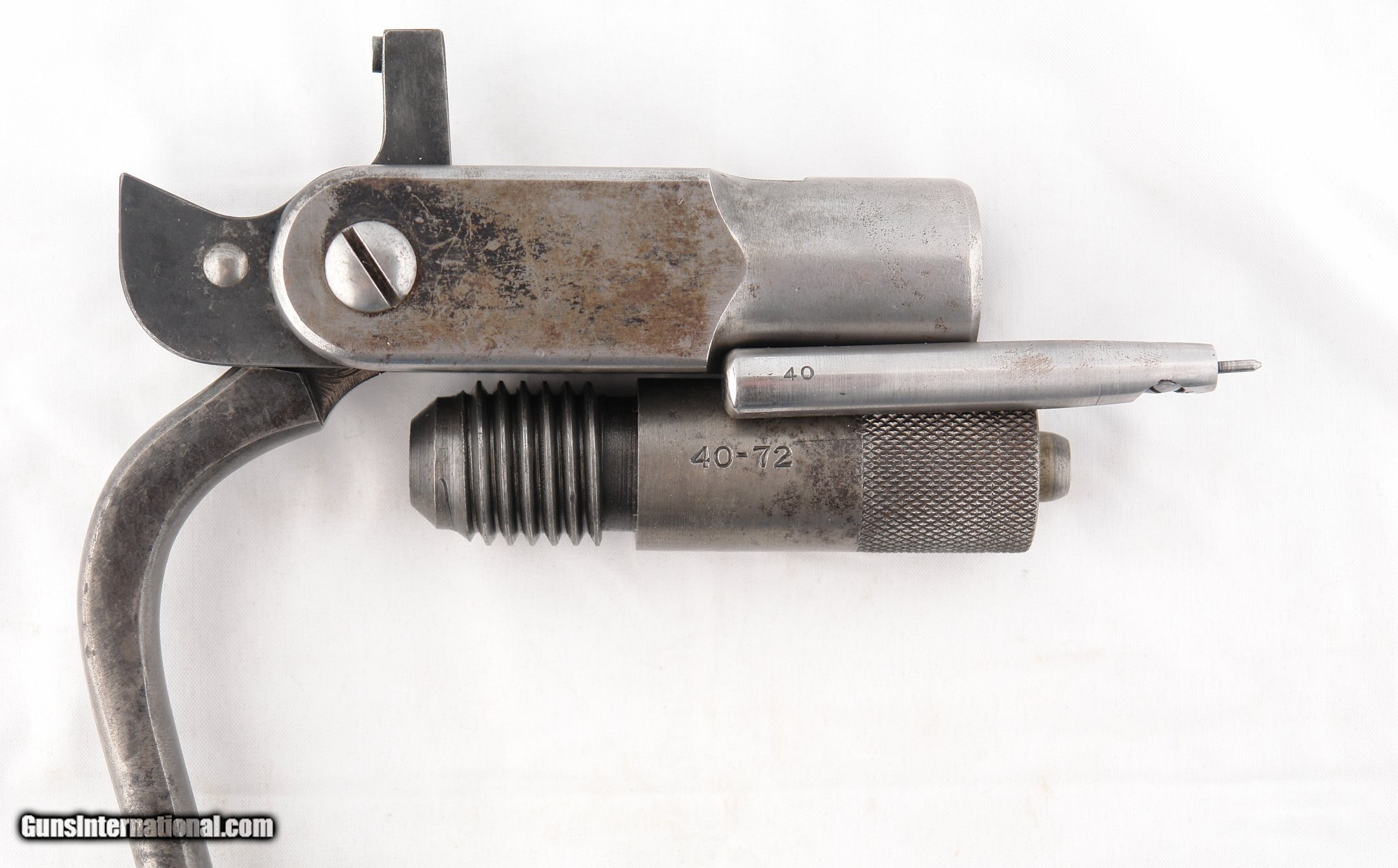 Description: WINCHESTER REPEATING ARMS HAND RELOADING LOADING TOOL FOR .40-72 WINCHESTER MODEL 1895 RIFLE CARTRIDGES. Original factory loading tool for priming and bullet seating. Also has the included de-priming tool with cleaner pin stamped "40"(usually lost). Excellent condition with traces of original factory blue. Perfect working order and tight lockup with no play in hinge. Stamped crisply with Winchester Rep. Arms address and "40-72" as it should. Main hinge screws unturned. Rare to find in this caliber. SOLD Rifle Caliber: .40-72 Winchester |
