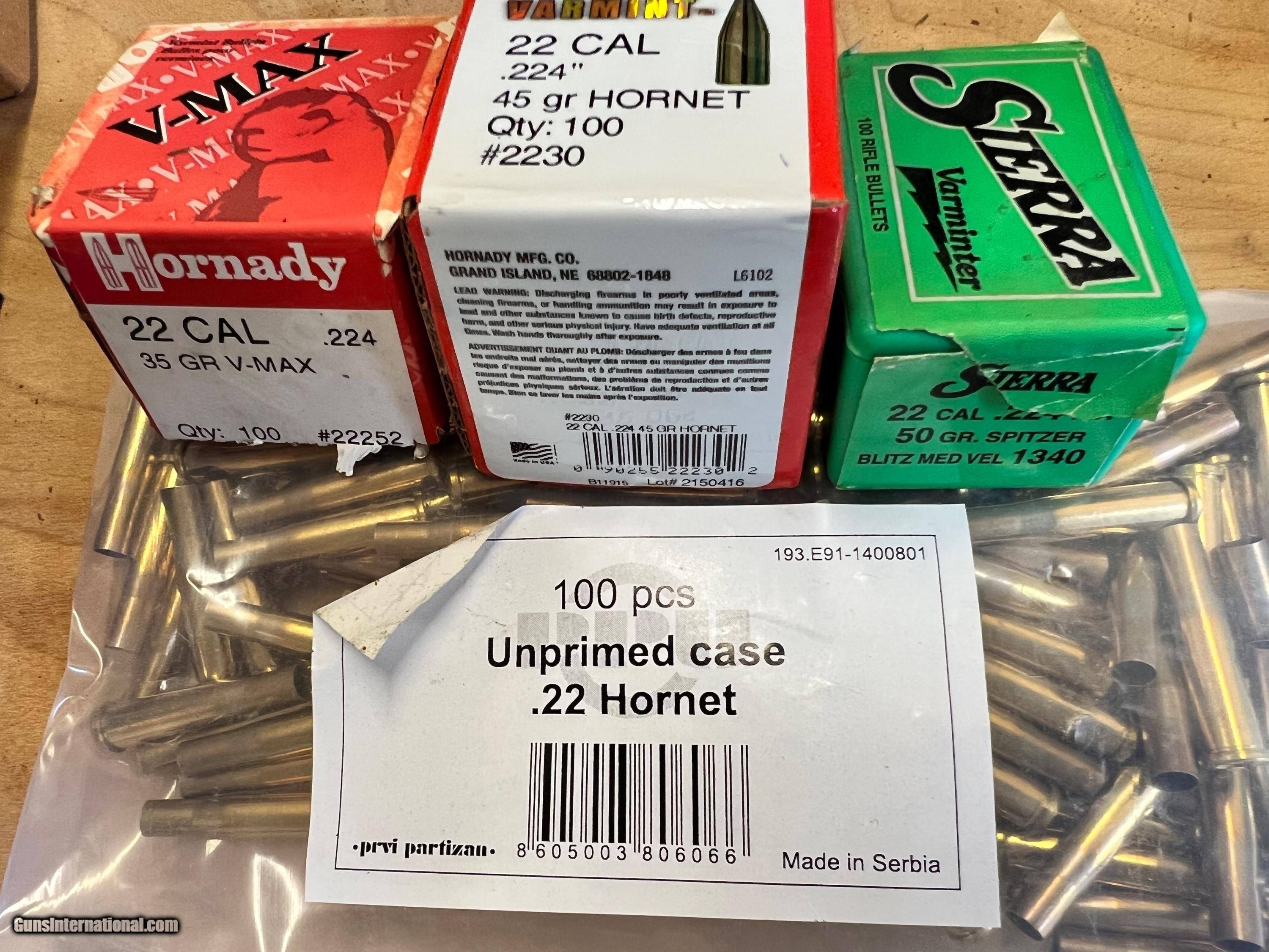 Description: 100 22 hornet cases & 3 boxes of bullets SOLD Rifle Caliber: .22 Hornet |