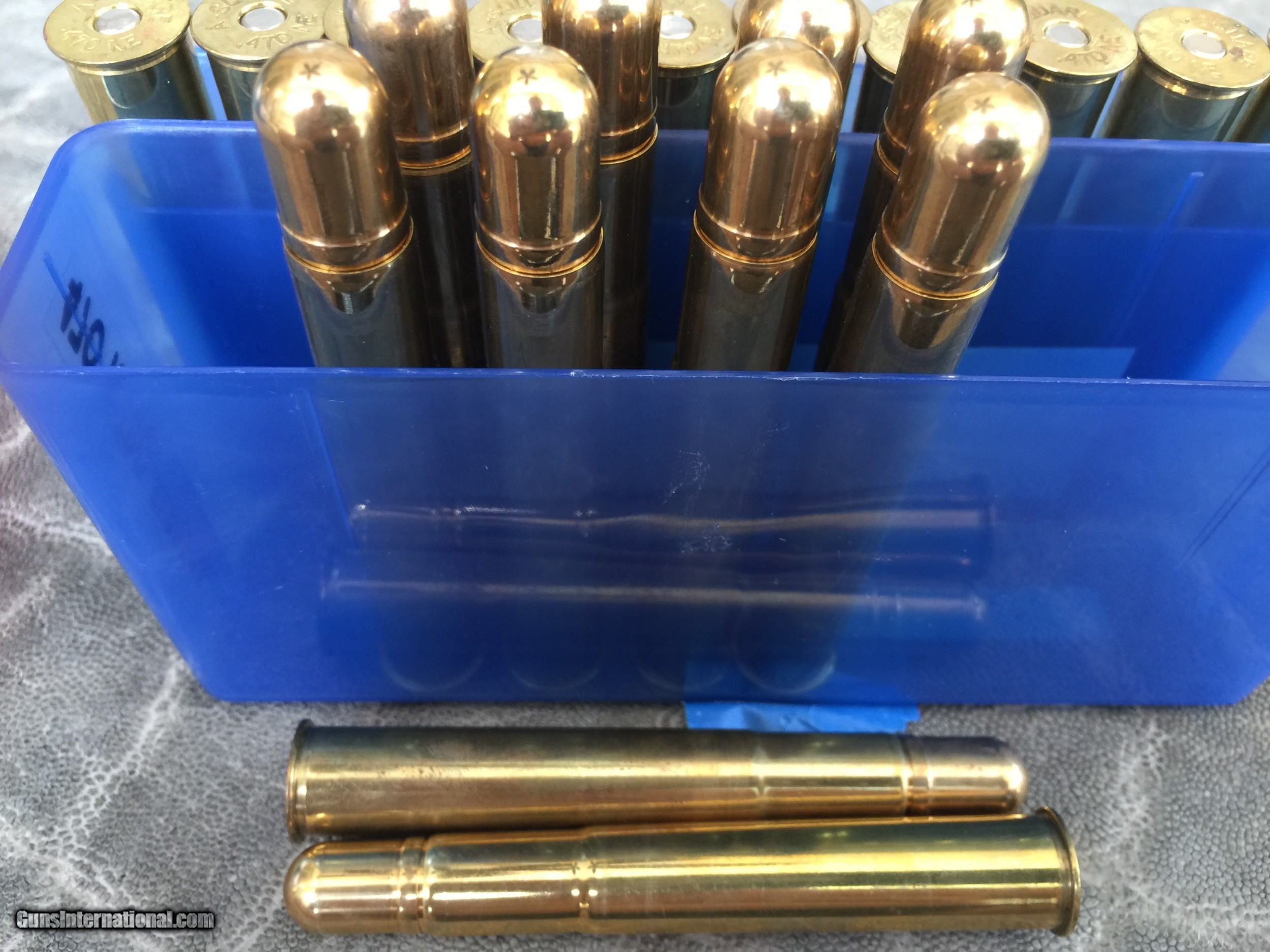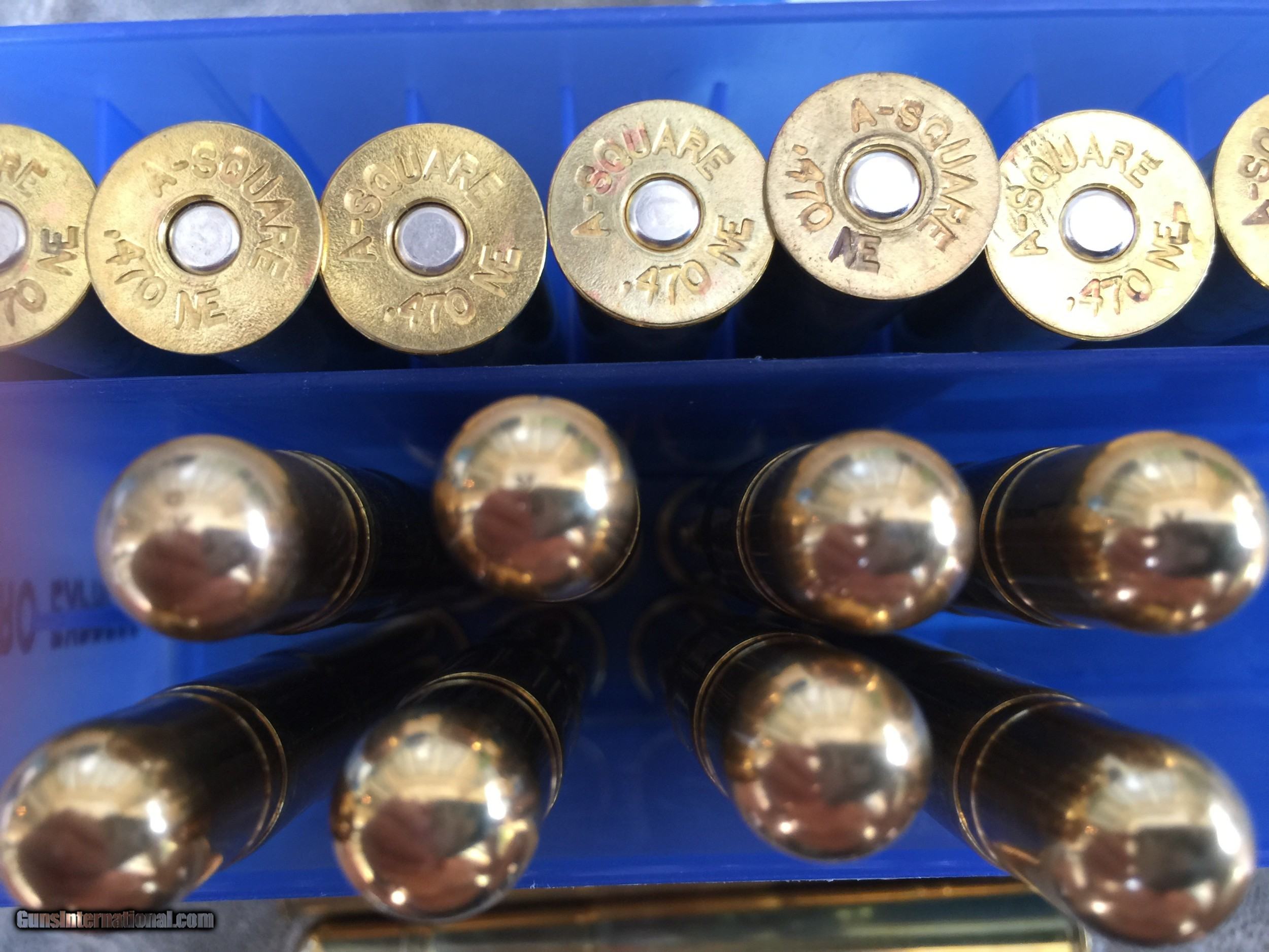 Description: A-Square .470 Nitro Express (10) pieces New Brass and (10) rounds loaded with Barnes Solids. These loaded rounds are being sold as components although they are likely just fine, shoot at your own risk. 20 total SOLD |