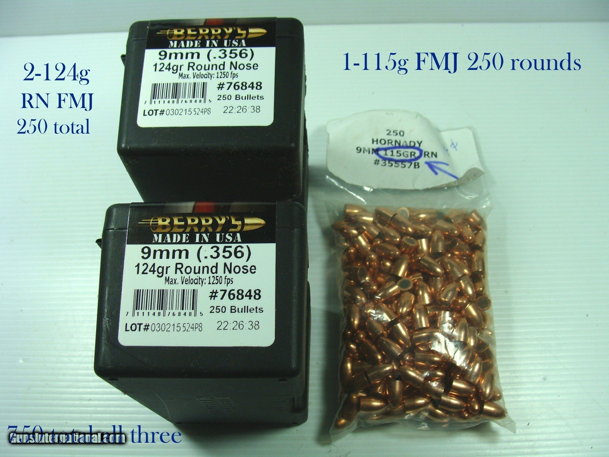 Description: BERRY'S BULLETS 9MM HORNADY 9MM 750 TOTAL BULLETS. 2-BOXES BERRY'S BULLETS 124g. FMJ. 1-BAG HORNADY 115g FMJ 250 BULLETS EACH, 750 BULLETS TOTAL. SOLD |
