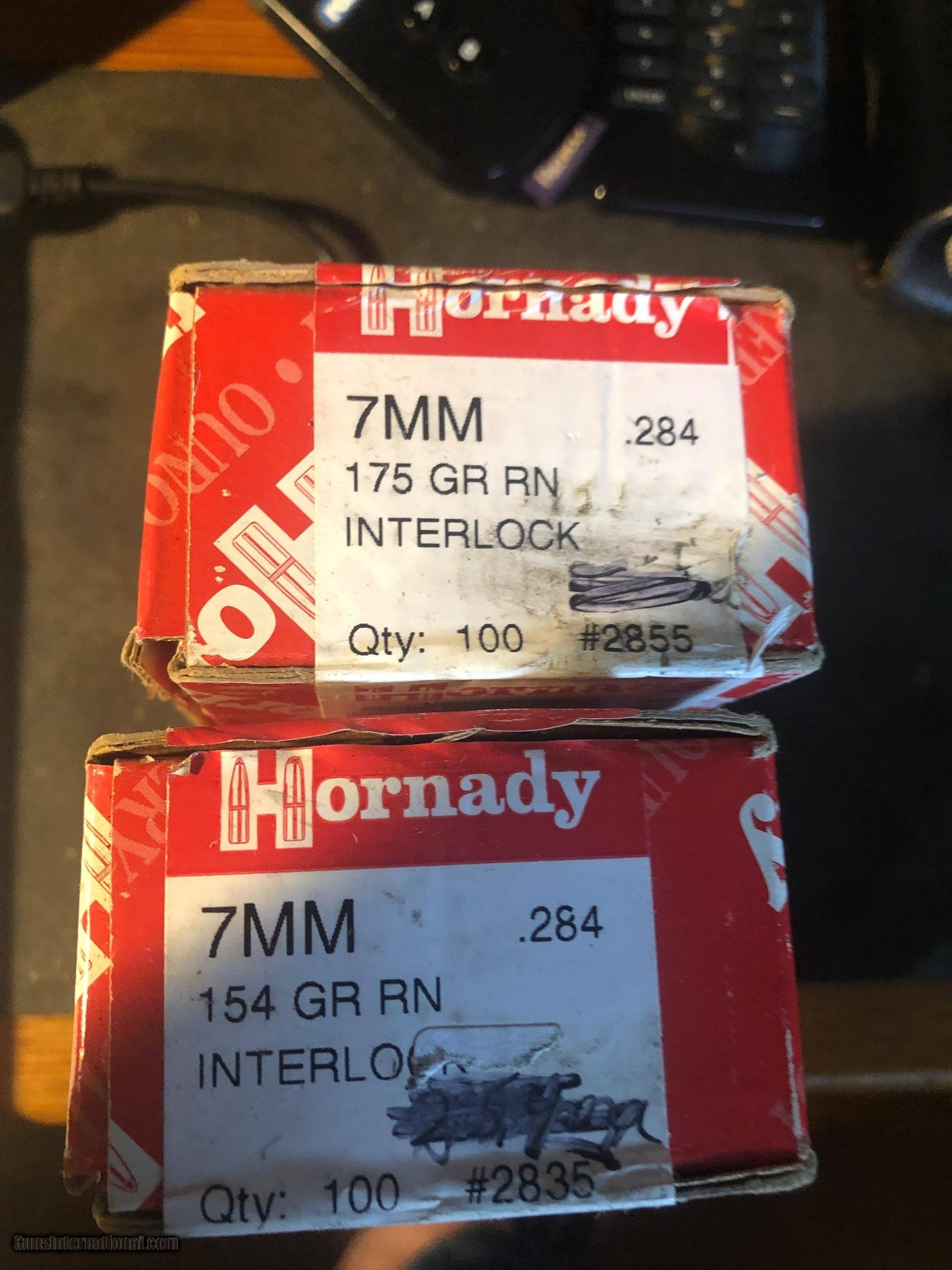 Description: 2 boxes of 7mm Hornady Interlock bullets 154gr and 175gr RN Interlock 100 pieces each. $55.00 each plus 10.50 shp SOLD |