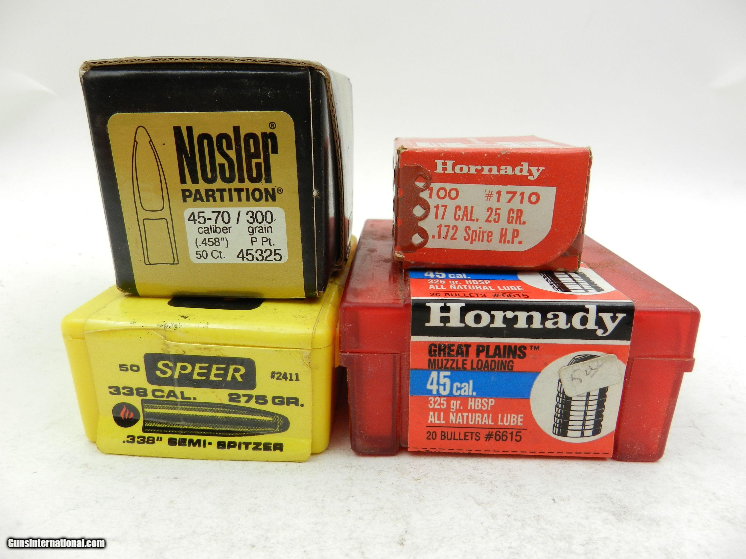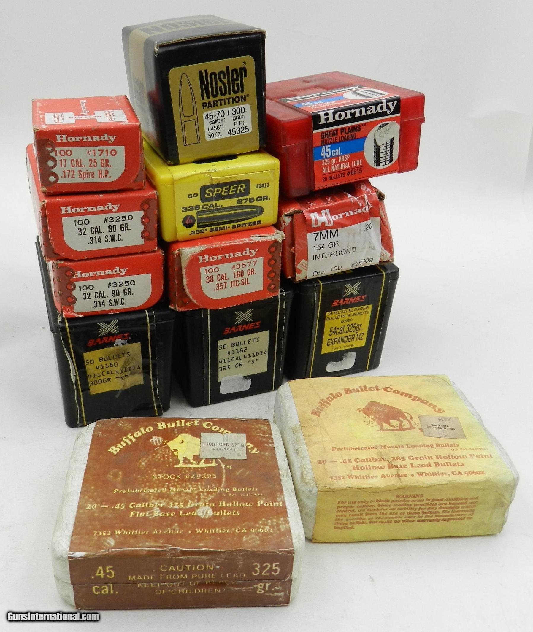 Description: Approx. 810 miscellaneous caliber bullets . All are new. Lot of 8 Boxes of Miscellaneous .44 Caliber Bullets Hornady .17 cal 25 grain Spire Hollow Point - 100 pieces Hornady .32 cal 90 grain Semi Wad Cutter - 200 Pieces Hornady .38 cal 180 grain JTC-SIL - 100 pieces Hornady 7mm 154 grain Interbond - 100 pieces Hornady Great Plains .45 cal 325 grain HBSP - 20 pieces Buffalo Bullet Co. .45 cal 325 grain HP - 20 pieces Buffalo Bullet Co. .45 cal 285 grain HP/HB - 20 pieces Nosler .45-70 300 grain - 50 pieces Speer .338 cal 275 grain Semi Spitzer - 50 pieces Free Shipping Free LocalPickUp California residents pay 7.75% sales tax. SOLD |
