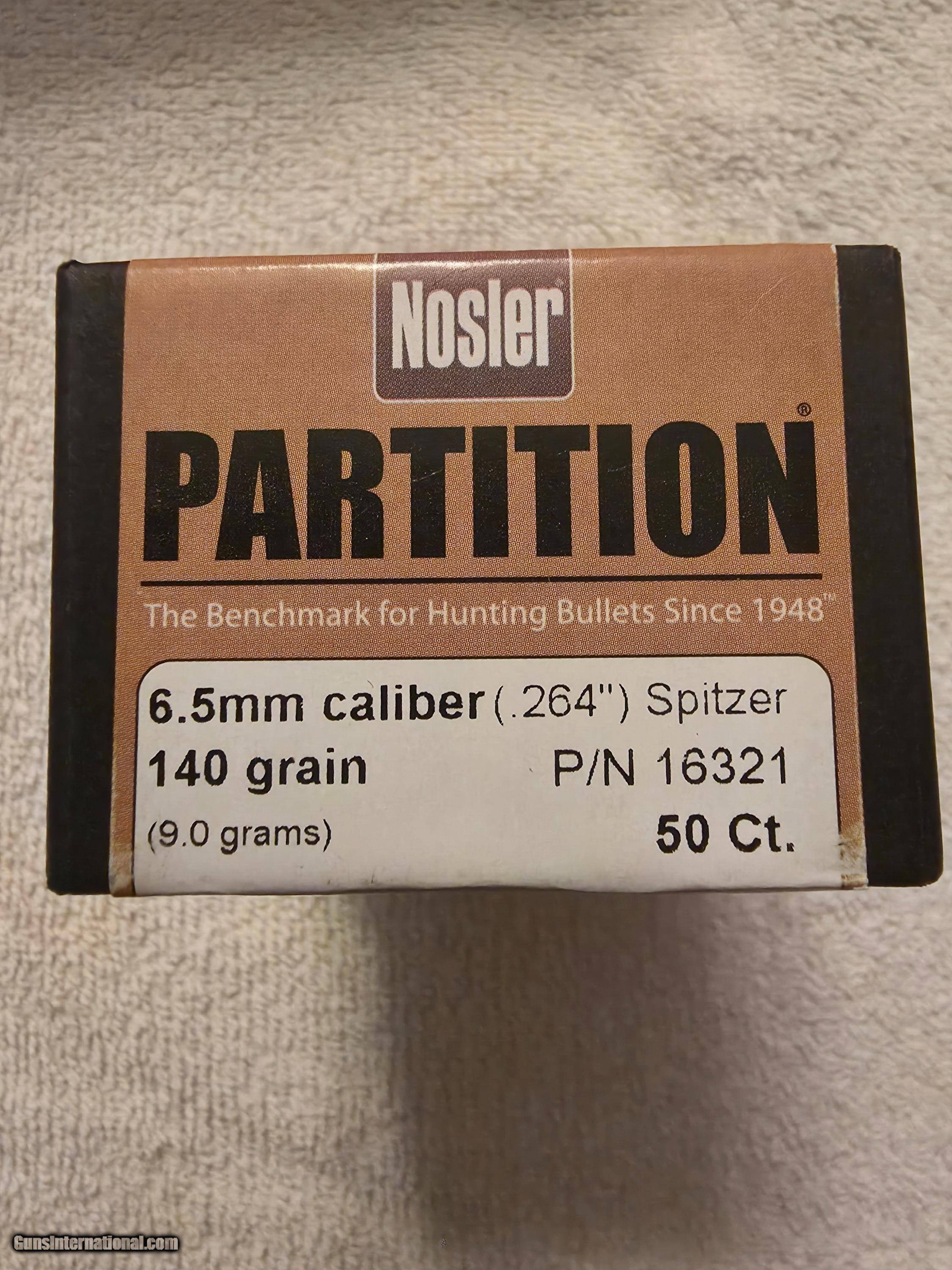 Nosler Partition. 264 cal 6.5mm 140 gr 50 ct