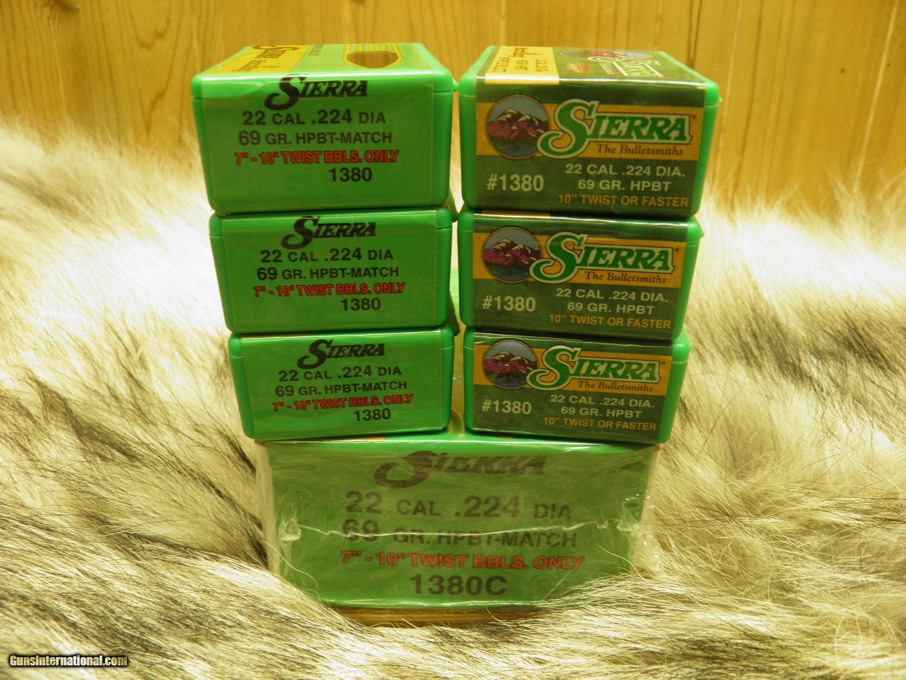 Description: SIERRA 22 CAL. 224 DIA. 69 GRAIN HOLLOW POINT BOAT TAIL MATCH MADE FOR 7" TO 10" TWIST BARRELS FOR THE M16 SERVICE RIFLE OR AR 15 RIFLE COMPETITION SHOOTS THESE BULLETS HAVE SET INCREDIBLE NUMBER OF NATIONAL RECORDS. 100 COUNT BOXES AND 500 COUNT BOXES. SOLD |