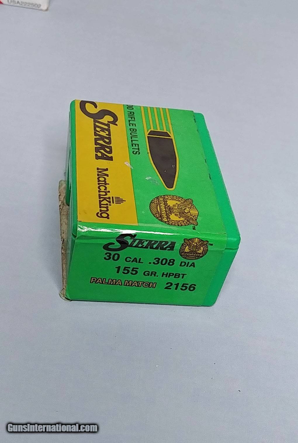 Description: Sierra Matchking Palma Match 30 Cal .308 155 Grain HPBT. The box of 100 bullets is unopened, factory sealed. Send me your mailing address and I'll give you the exact mail cost. I only charge the exact amount. Nothing added. SOLD Rifle Caliber: .308 Winchester |