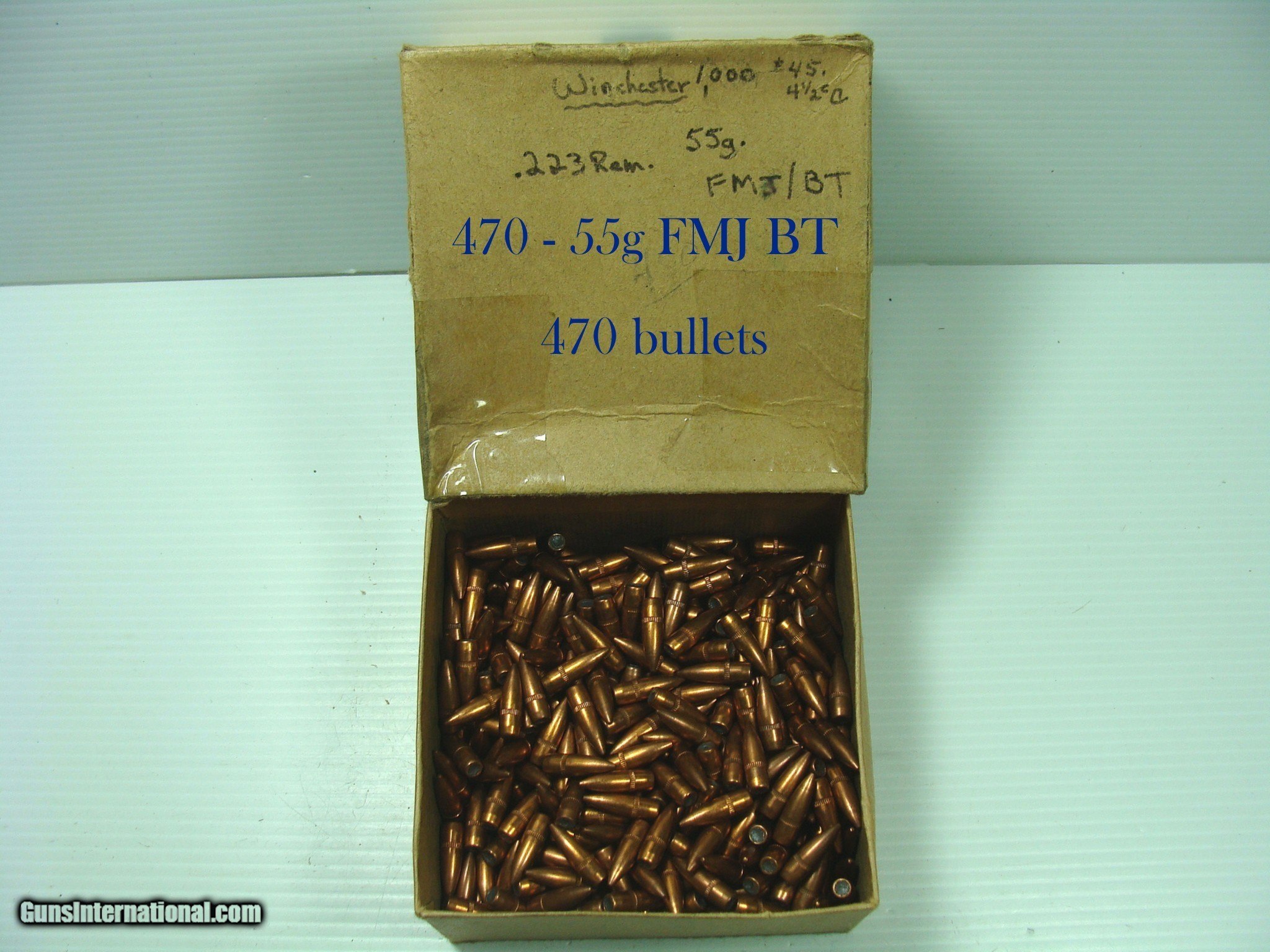 Description: WINCHESTER ..223 / 5.56 .55 grain FMJ BOAT TAIL W/CANNELURE. 470 BULLETS. SOLD |
