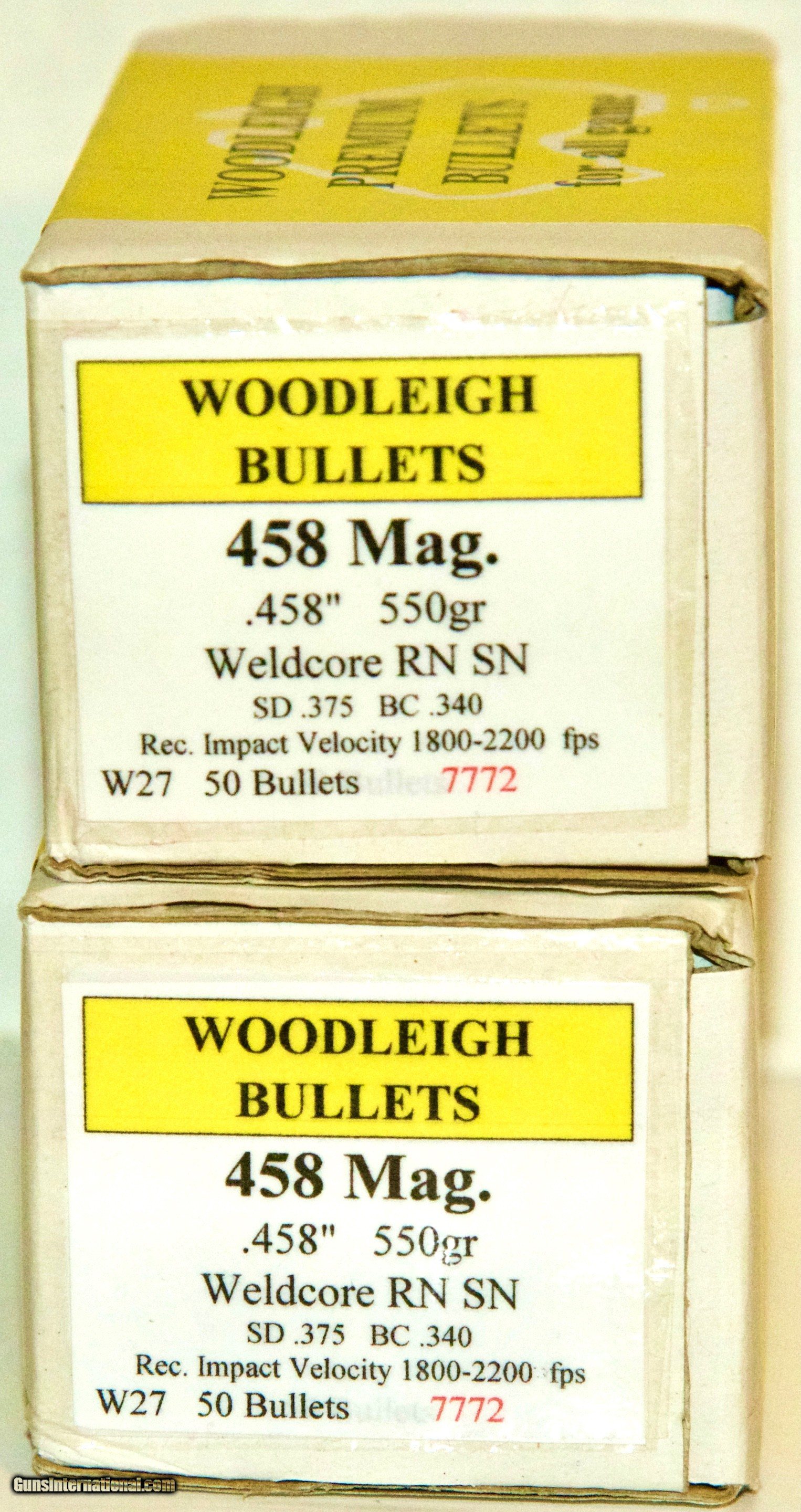 Description: WOODLEIGH WELDCORE SOFT POINT .458" 550 GRAIN ROUND-NOSE SOFT-POINT COPPER ALLOY - LEAD FLAT BASE BULLETS PERFECT APPLICATION FOR THESE BIG BOYS: 450 RIMMED NITRO EXPRESS 450 RIGBY 460 WEATHERBY 458 LOTT 458 WINCHESTER MAGNUM IS ONE BOX OF 50 BULLETS FLAT RATE SHIPPING $18.99/BOX LOWER 48 SPECIFICATIONS: Company: WOODLEIGH Brand: 550 GRAIN COPPER ALLOY .458" Location: MADE IN AUSTRALIA Caliber: .450 NITRO EXPRESS Caliber: .450 RIGBY Caliber: .460 WEATHERBY Caliber: .458 LOTT Caliber: .458 WINCHESTER MAGNUM Bullet: COPPER - ZINC ALLOY - LEAD Bullet: WOODLEIGH WELDCORE Box: 50 BULLETS/BOX [1 BOX = 50 BULLETS] SOLD Rifle Caliber: .458 Lott |