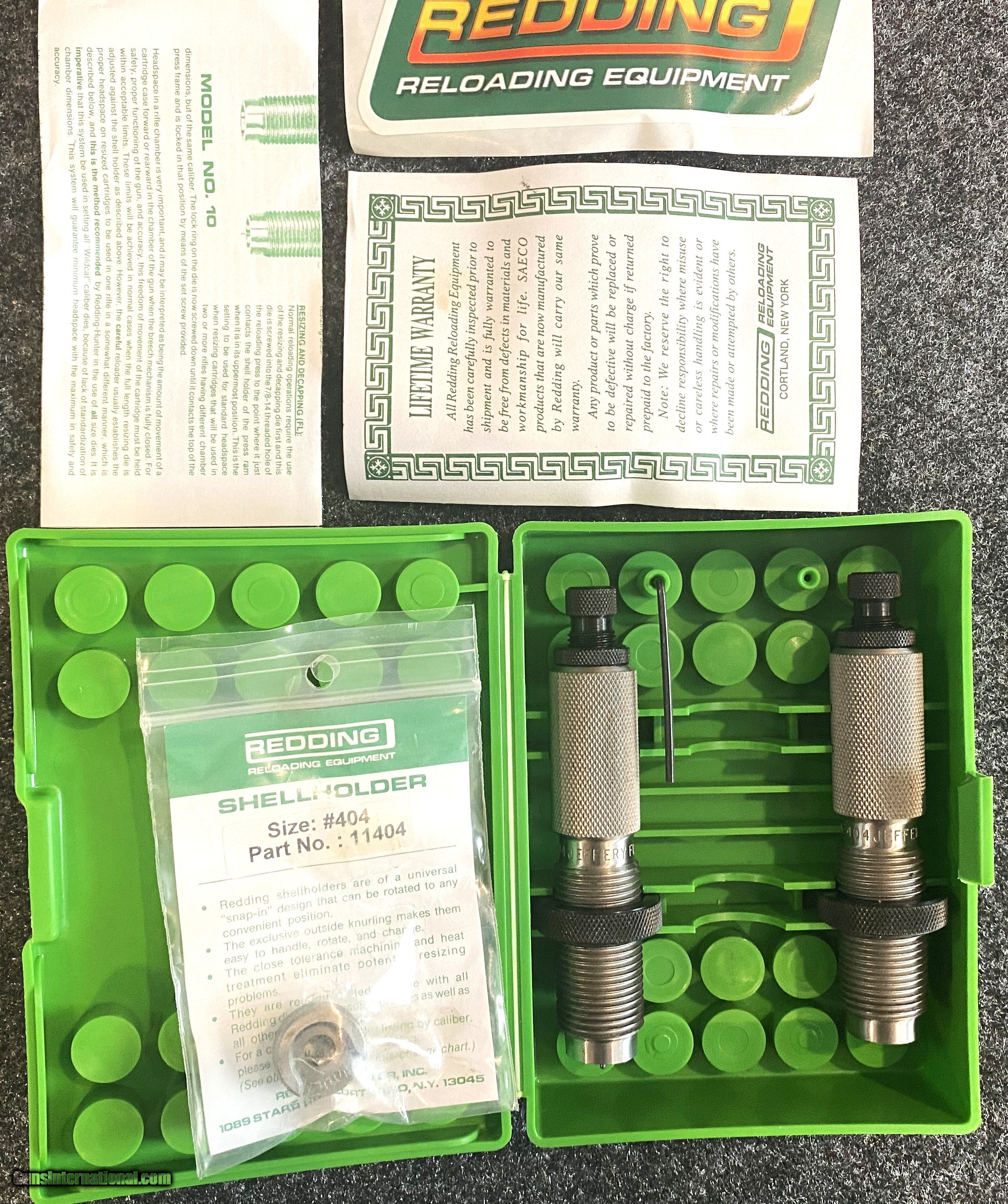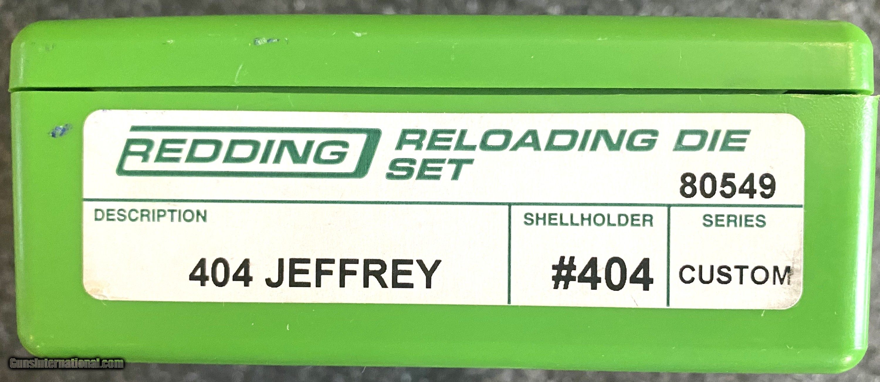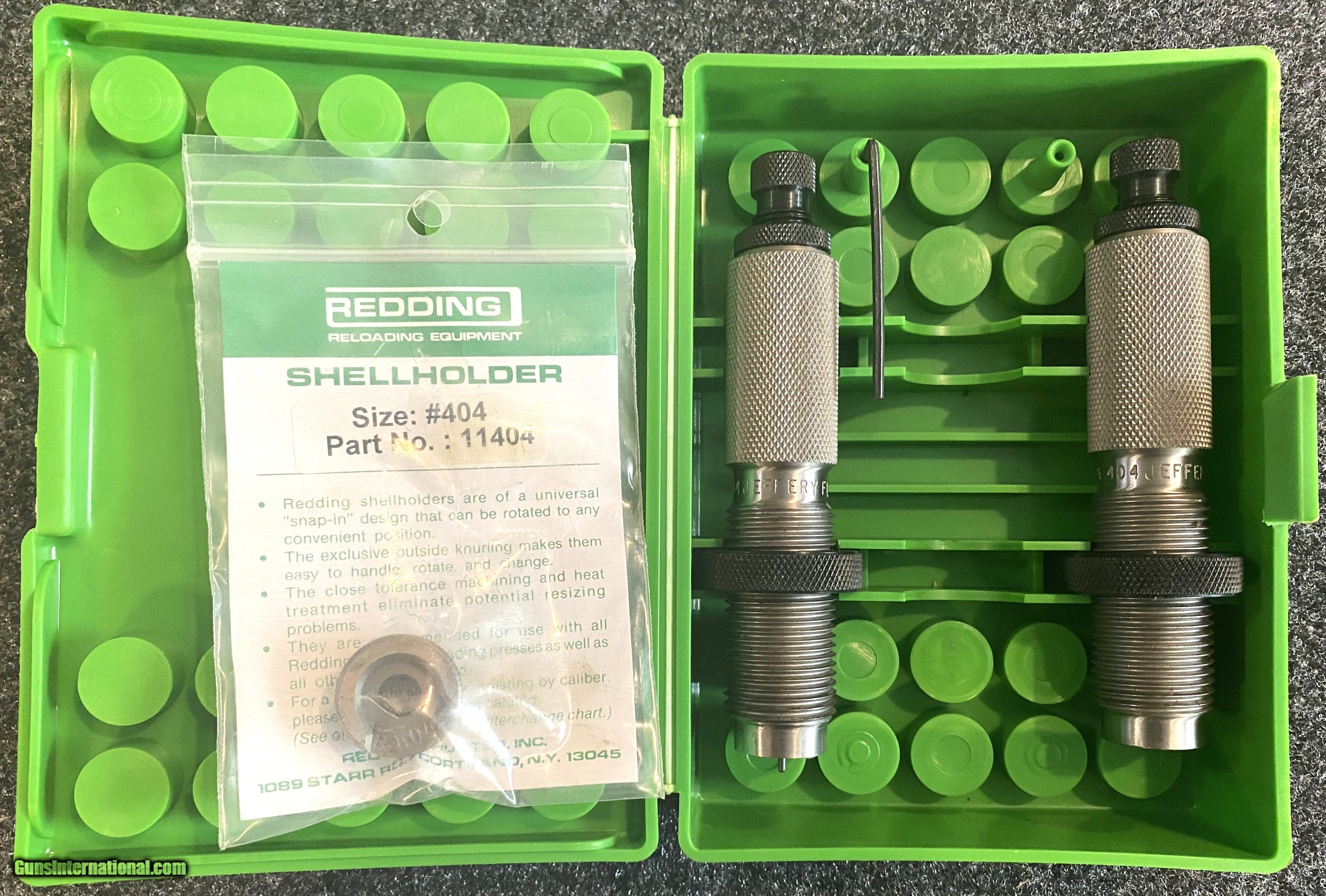 Description: These dies are from a private collection. These are Custom 404 Jeffery Dies made by the Redding Company. The set comes complete with the shell holder. The dies are in excellent - as new condition. SOLD Rifle Caliber: .404 Jeffery |
