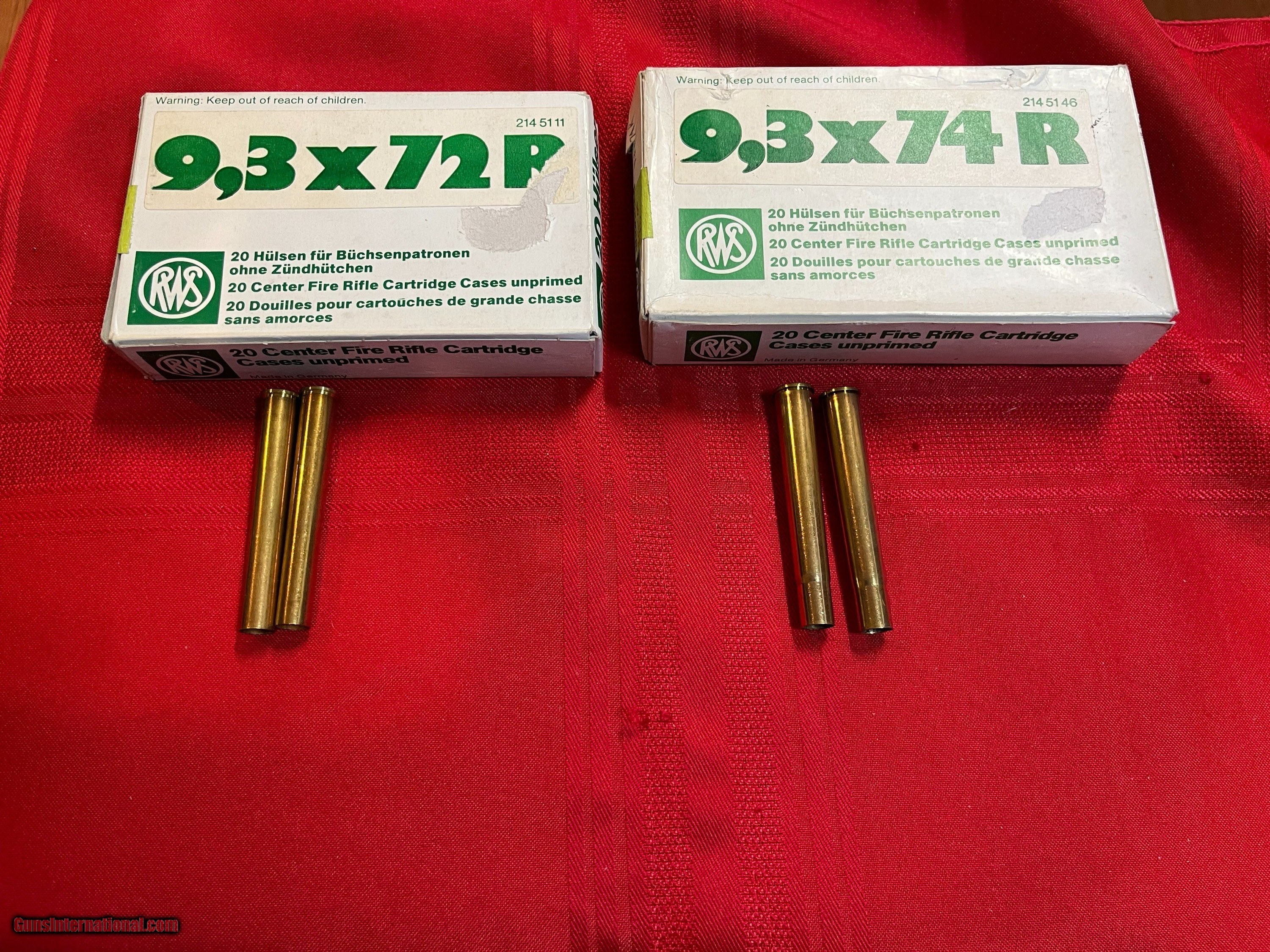 Description: NIB 9.3 brass. RWS. 20 per box. $50 for both SOLD Rifle Caliber: 9.3x74mmR, 9.3x72mmR |