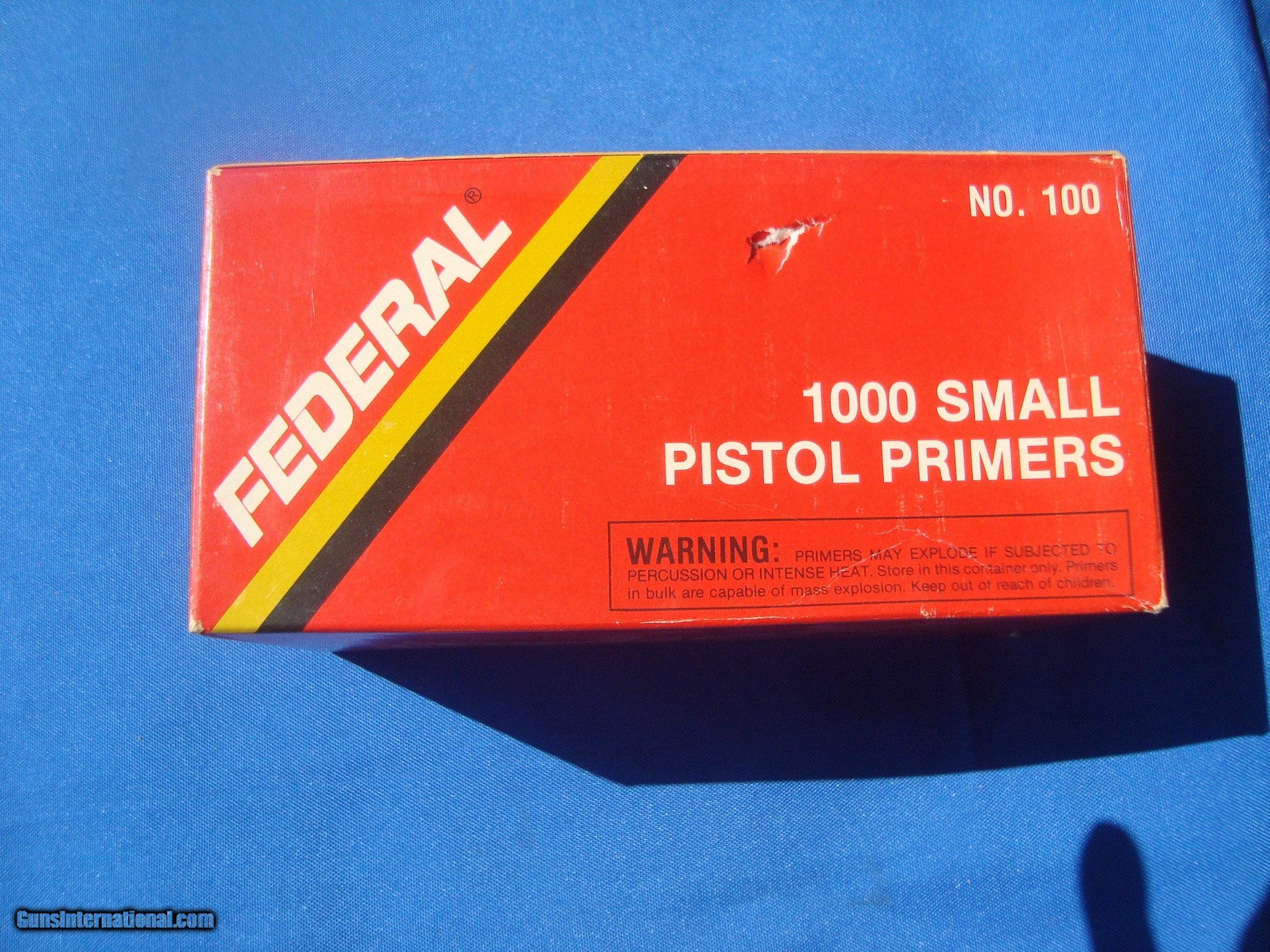 Description: One box of Federal large pistol qty 1000, one box of Federal small pistol primers qty. 800, and one box of Remington large rifle primers qty. 1000. $ 85.00 pre. box, free shipping SOLD |