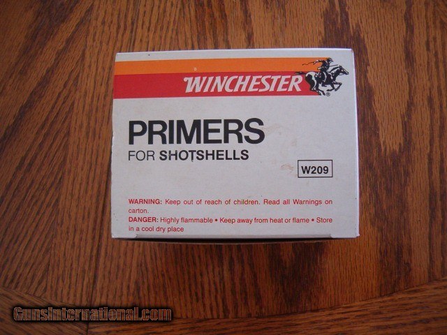 Description: 1000 WINCHESTER W209 PRIMERS, NEW, IN ORIGINAL BOX $160. PLUS $25. GROUND SHIPPING. I HAVE ANOTHER 700 NEW IN BOX FOR $112. PLUS SHIPPING. BUY ALL 1700 FOR $270. PLUS $25. SHIPPING TO LOWER 48. NOTICE: THESE ARE FOR SHOTGUN SHELLS!!! YOUR RESPONSIBILITY: BE CERTAIN IT IS LEGAL TO RECEIVE THIS MERCHANDISE IN YOUR STATE, BEFORE BUYING. USPS OR BANK MONEY ORDER OR BANK CASHIERS CHECK. SOLD |