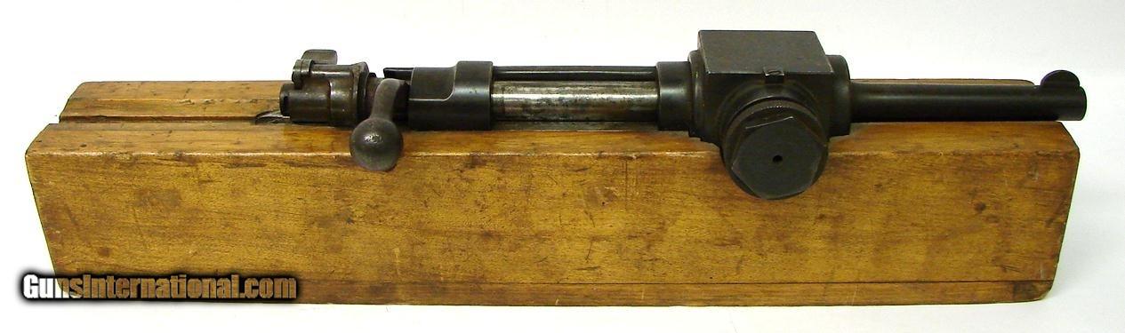 Description: "Ammunition Pressure Tester for .32-20 Ammo. Rare. Marked on pressure block ""Crusher de Rec. 32-20."" Device uses a Colt Official Police 32-20 barrel. Side bolt unscrews to reveal pressure plunger. A lead wafer was inserted and after firing the weapon was removed and gauged to see the pounds per square inch of pressure exerted. Probably around 1910-1920. Trigger actuates from a groove in the bottom of the wood block. Over many years we have sold others in different calibers mounted like this. Devices such as this were used by all ammo manufacturers to check the pressure consistency of their ammo. This one was used in Mexico. Price: $995.00 Contact Seller |