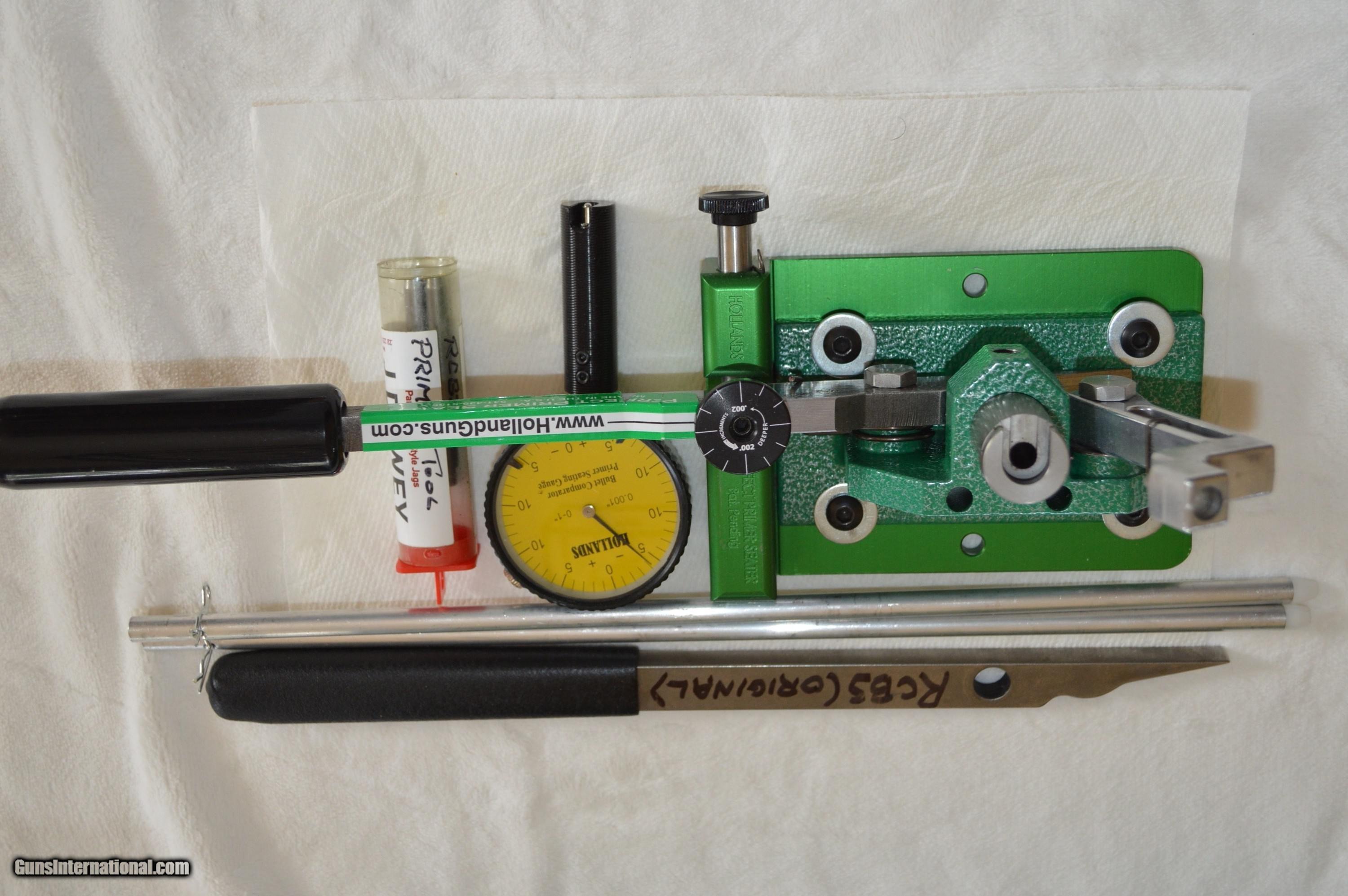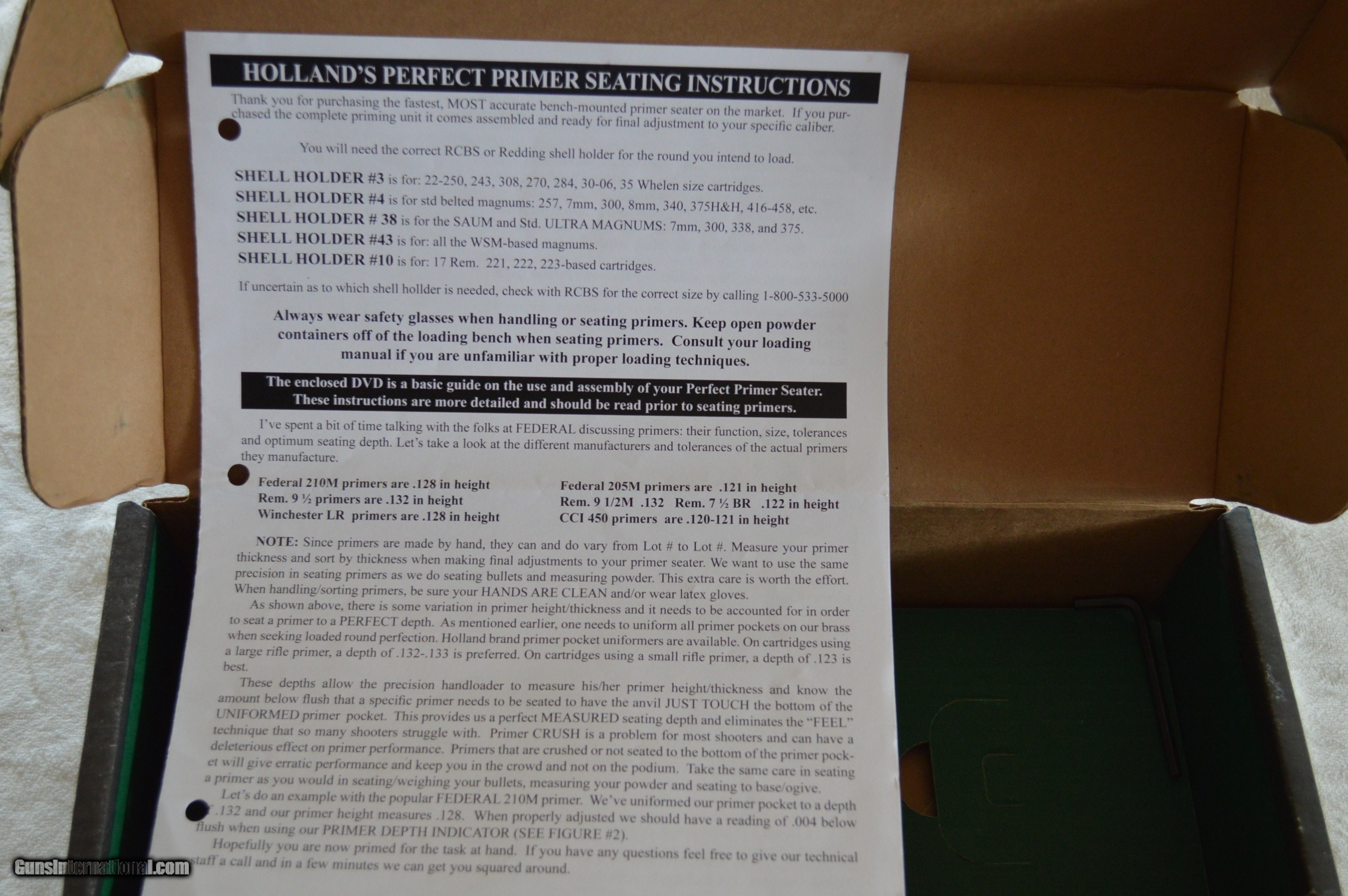Description: This unit is manufactured by Holland Guns, to fit perffectly with the RCBS manufactured priming tool. I purchased this many years ago, then decided I had more than enough loaded ammunition.The unit was never used, but my experience with Holland's Guns, is it would be top notch. The complete tool sells on hollandguns for $360.00. The unit comes with all the original supplied equipment and detailed instruction brochure. The design is basic and I would expect it to operate smoothly. The entire unit is literally like new. The unit incudes both small and large rifle primer tubes as well as the small and large seater plug assemblies.It also comes with Holland's Primer Depth Indicator Guage. The unit does not include RCBS shellholders. SOLD |