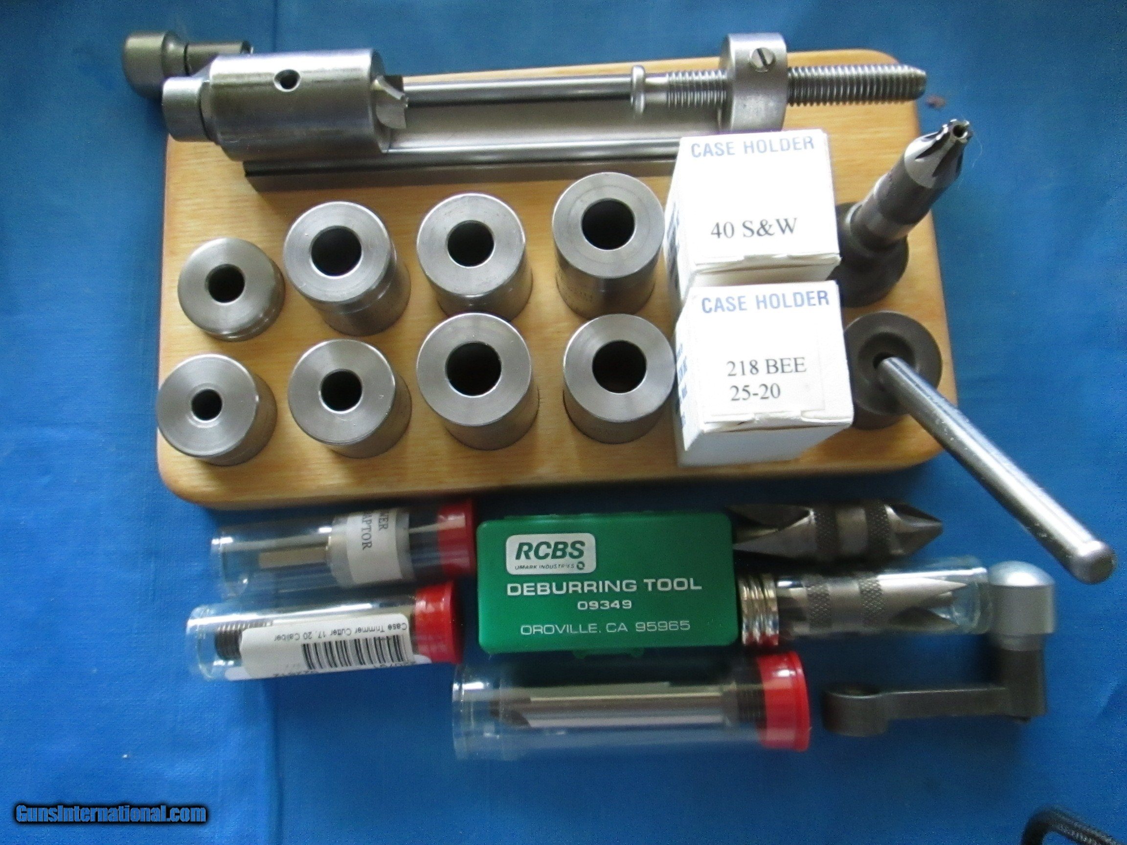 Description: This trimmer package includes the following: Trimmer as shown plus spare cutting head and power adapter 10 case holders - .40 S&W, .218 Bee, .22 Hornet .221 FB, .222 REM, .225 WIN, .22-250, .243, .257 Roberts, .3006 Wood base for case holders Military primer case punch tool and reamer 3 - Regular inside/outside case deburring tools 1 - 45 degree long inside reamer that works in the trimmer Shipping is included SOLD |