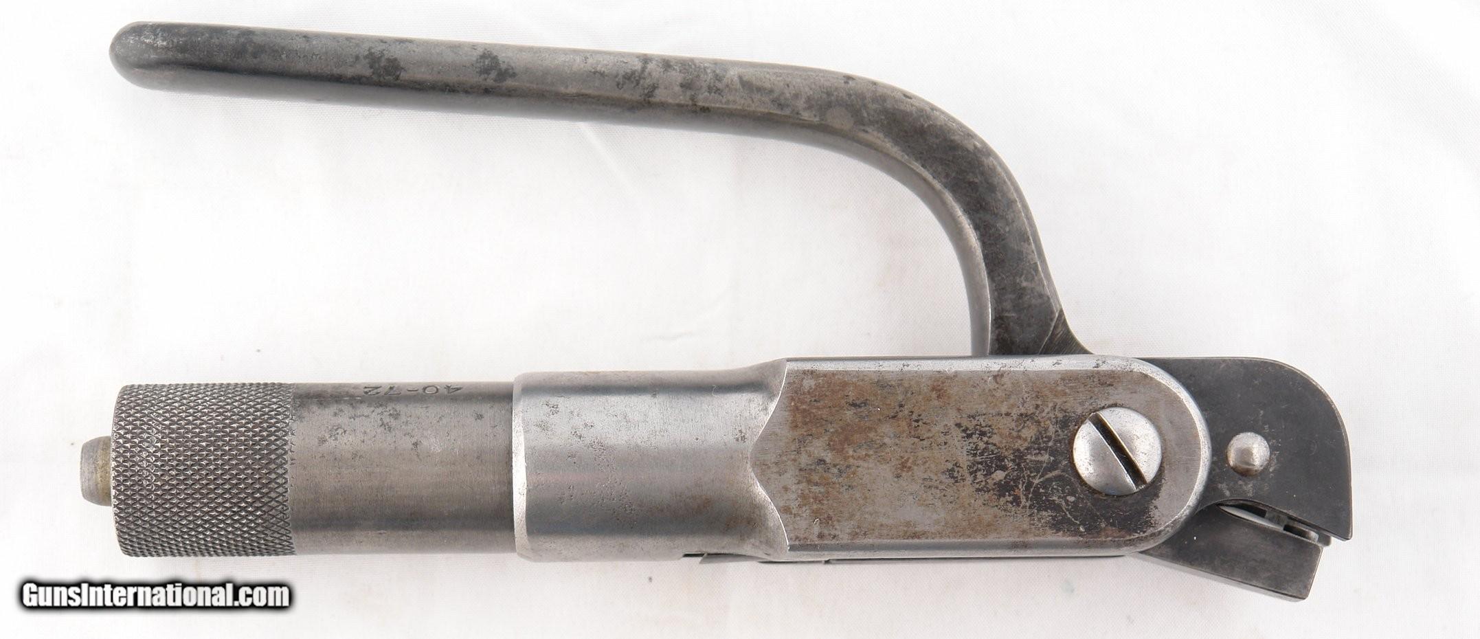 Description: WINCHESTER REPEATING ARMS HAND RELOADING LOADING TOOL FOR .40-72 WINCHESTER MODEL 1895 RIFLE CARTRIDGES. Original factory loading tool for priming and bullet seating. Also has the included de-priming tool with cleaner pin stamped "40"(usually lost). Excellent condition with traces of original factory blue. Perfect working order and tight lockup with no play in hinge. Stamped crisply with Winchester Rep. Arms address and "40-72" as it should. Main hinge screws unturned. Rare to find in this caliber. SOLD |
