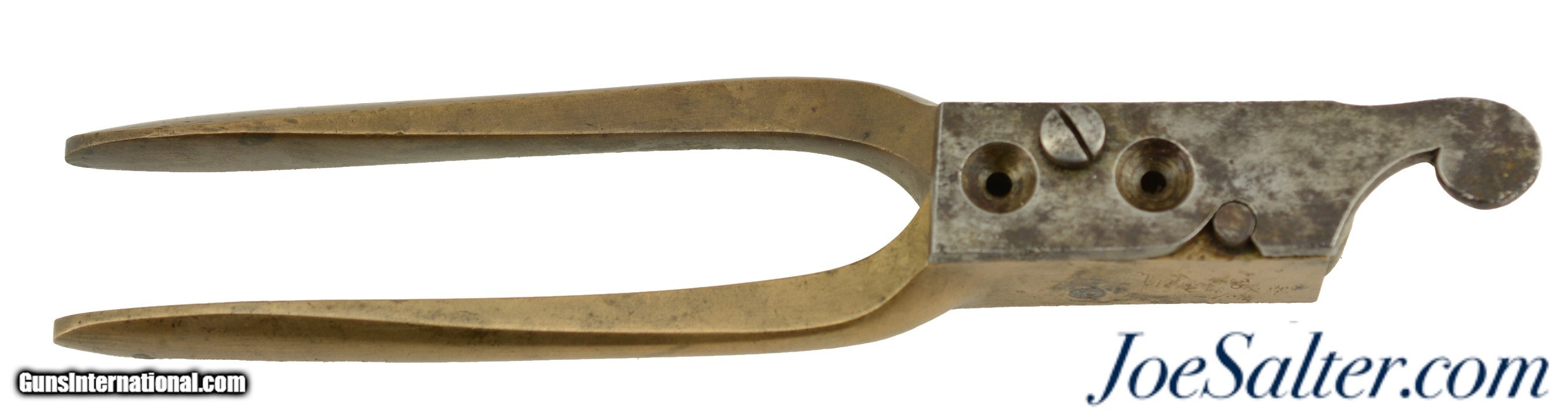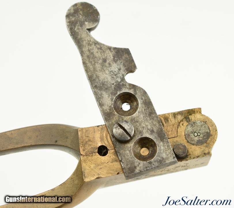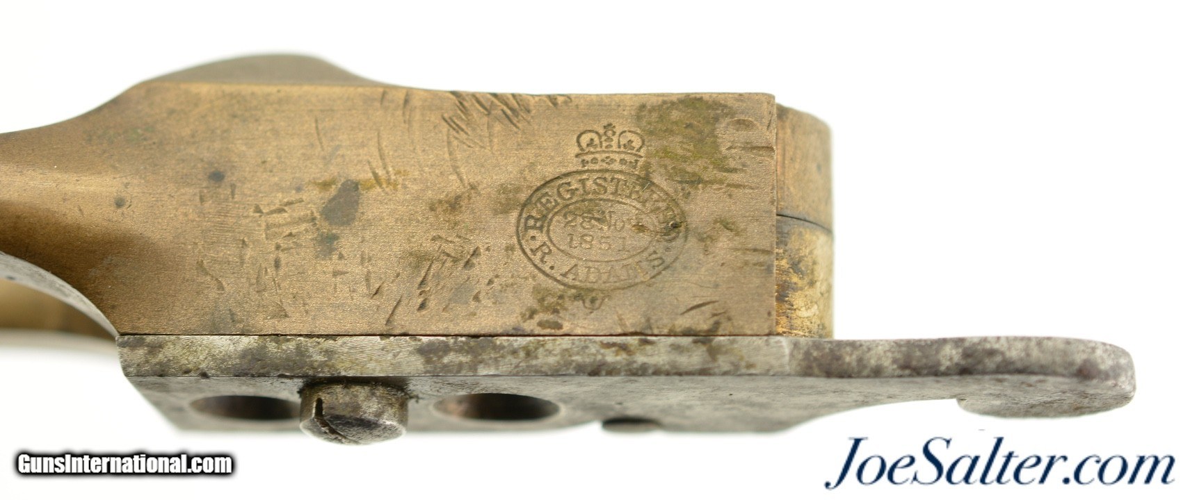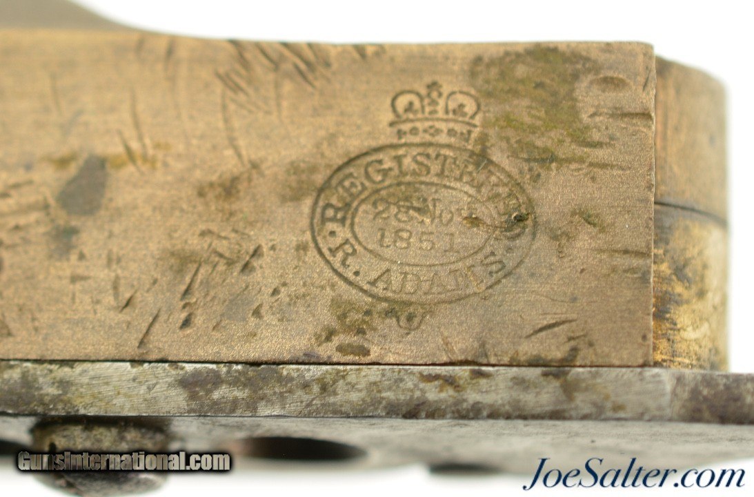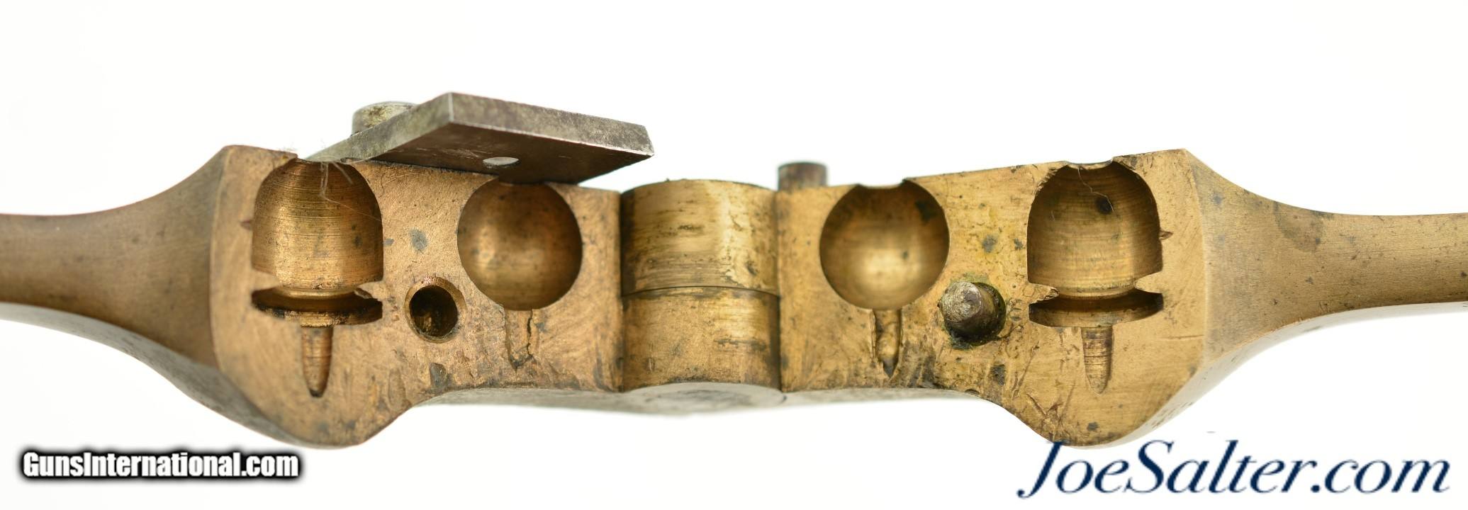 This is an R. Adams Patent 1851 38-Caliber Dragoon revolver bullet mold, stamped "REGISTERED R. ADAMS 28 NOV 1851" and 38, the sprue cutter stamped 8 as is the privet pin. This example is in very good condition with a nice patina on the brass, cavities remain clean and crisp and signs of use. Extremely well built mold for the cased Adams.;