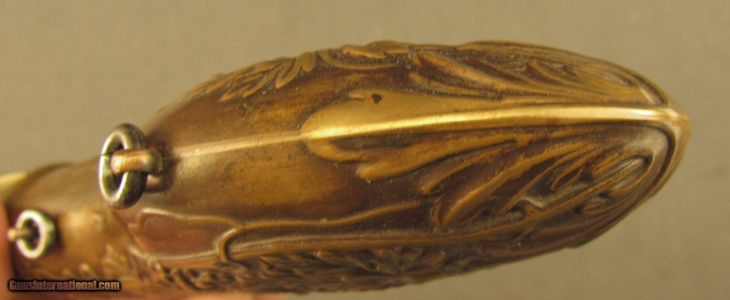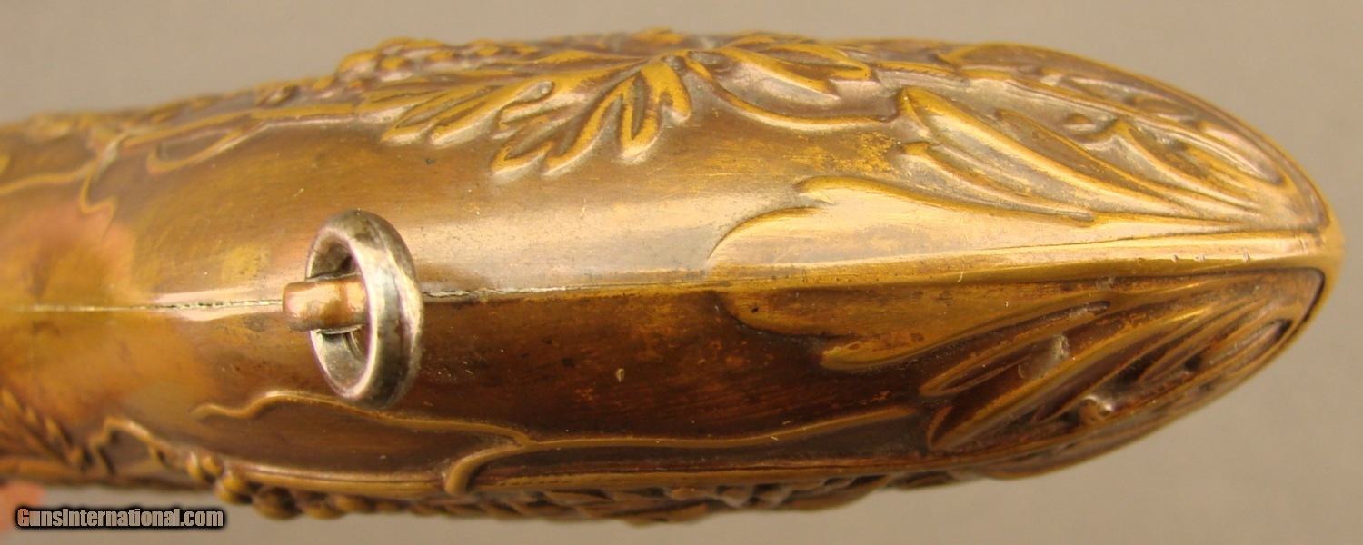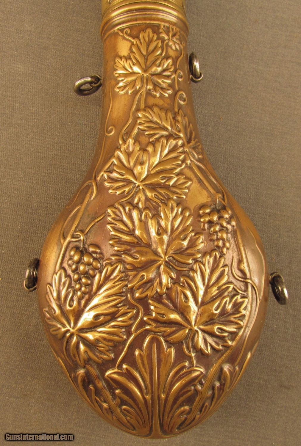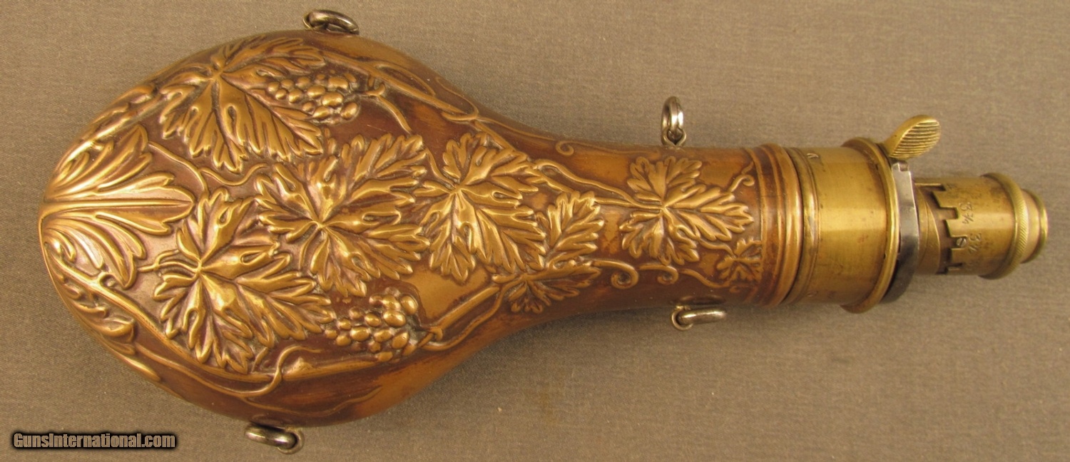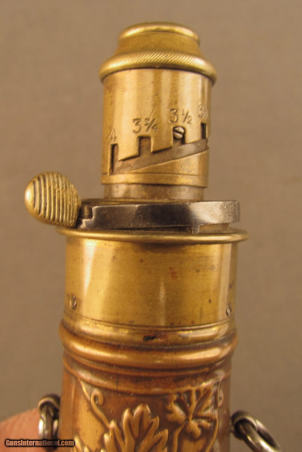 Description: Riling shows this flask under the "dead game" listing with a grade leaf pattern on the back. Both sides have the grade leaf pattern as shown at bottom right on page 321. A very nice condition factory error flask with the spout marked from 3 to 4 drams. No maker's name. Excellent condition with tight seams and all four carry rings. Nice fire blue on the spring with minor pitting. One side shows 90% original finish, the other has 60%. A very unusual 2 faced flask. SOLD Manufacturer: Hawksley Model: Flask Serial Number: NSN |