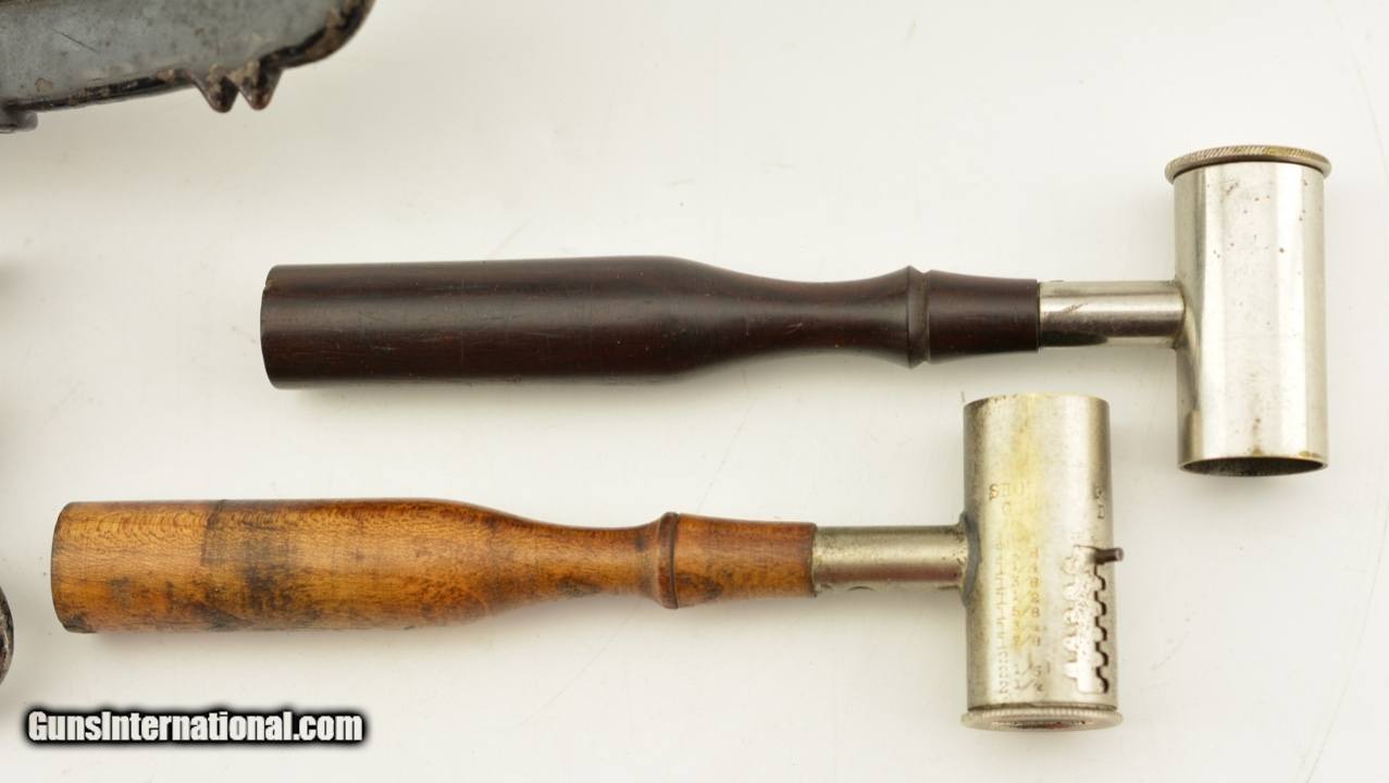 Description: This is a group of Antique 12ga. Hand Re-Loading Tools consisting of a Sears Roebuck and Co. hand crimping tool is excellent condition with almost all of the original black paint and is fully functional next is a Bridgeport Gun Implement Co. powder/shot measure from the late-1800's with a Union Hardware Co. also a powder/shot measure from the mid-1800's both in excellent working condition. To round out the set a cast iron, unknown maker, 12ga. marked, primer/de-primer in very good condition with a deep patina and smooth finish. SOLD |