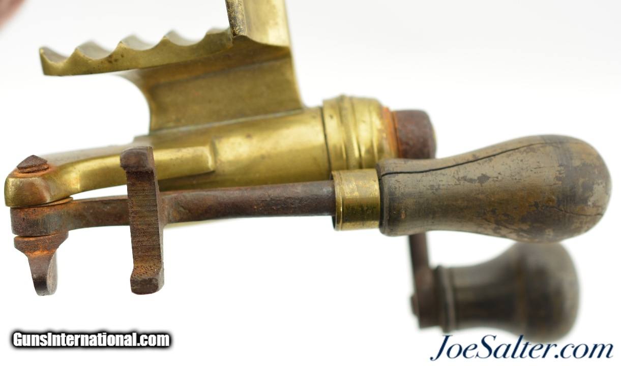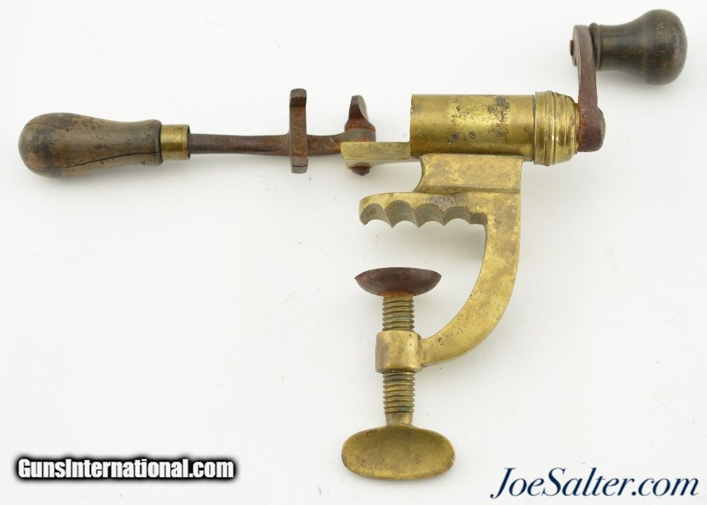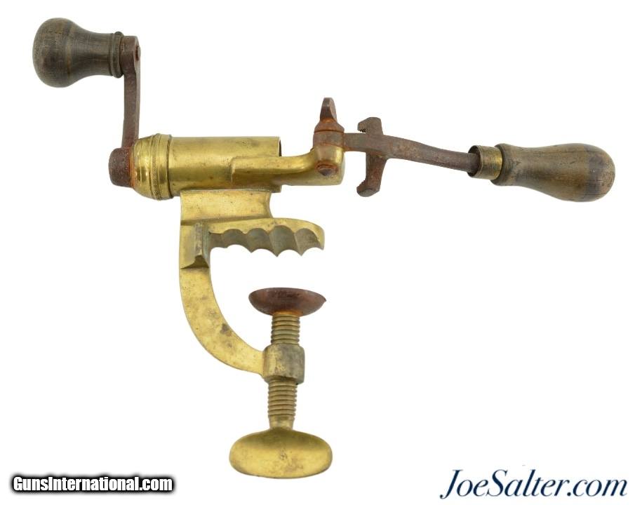 Description: This is a Brass roll crimper reloading tool. The bench mounted tool for 16 Gauge paper shotgun shells has brass body with oxidized metal arms and wood handles. It is in very good condition with some metal oxidation and small split on the charging handle. A great looking antique tool that functions and will display well. SOLD |