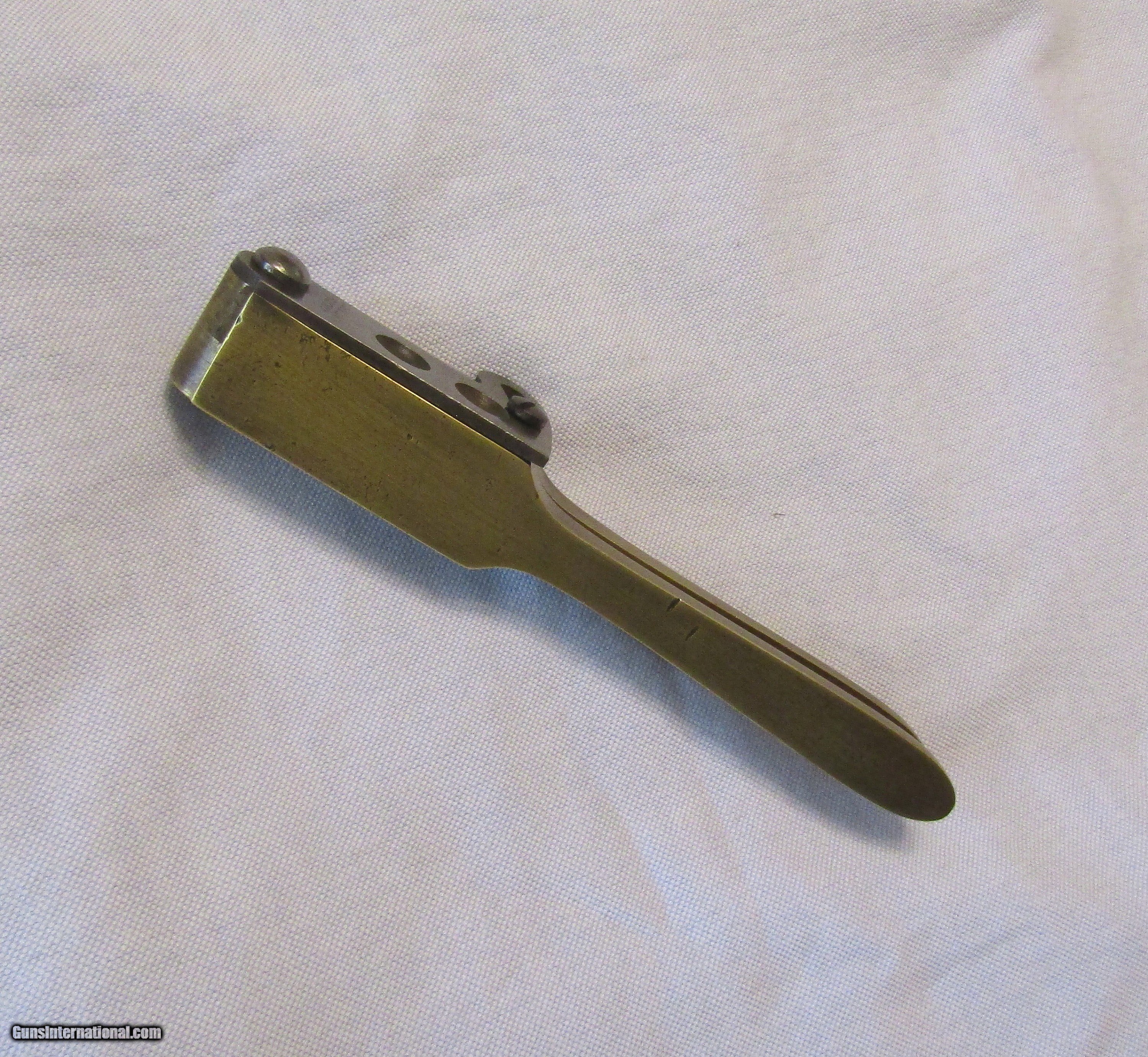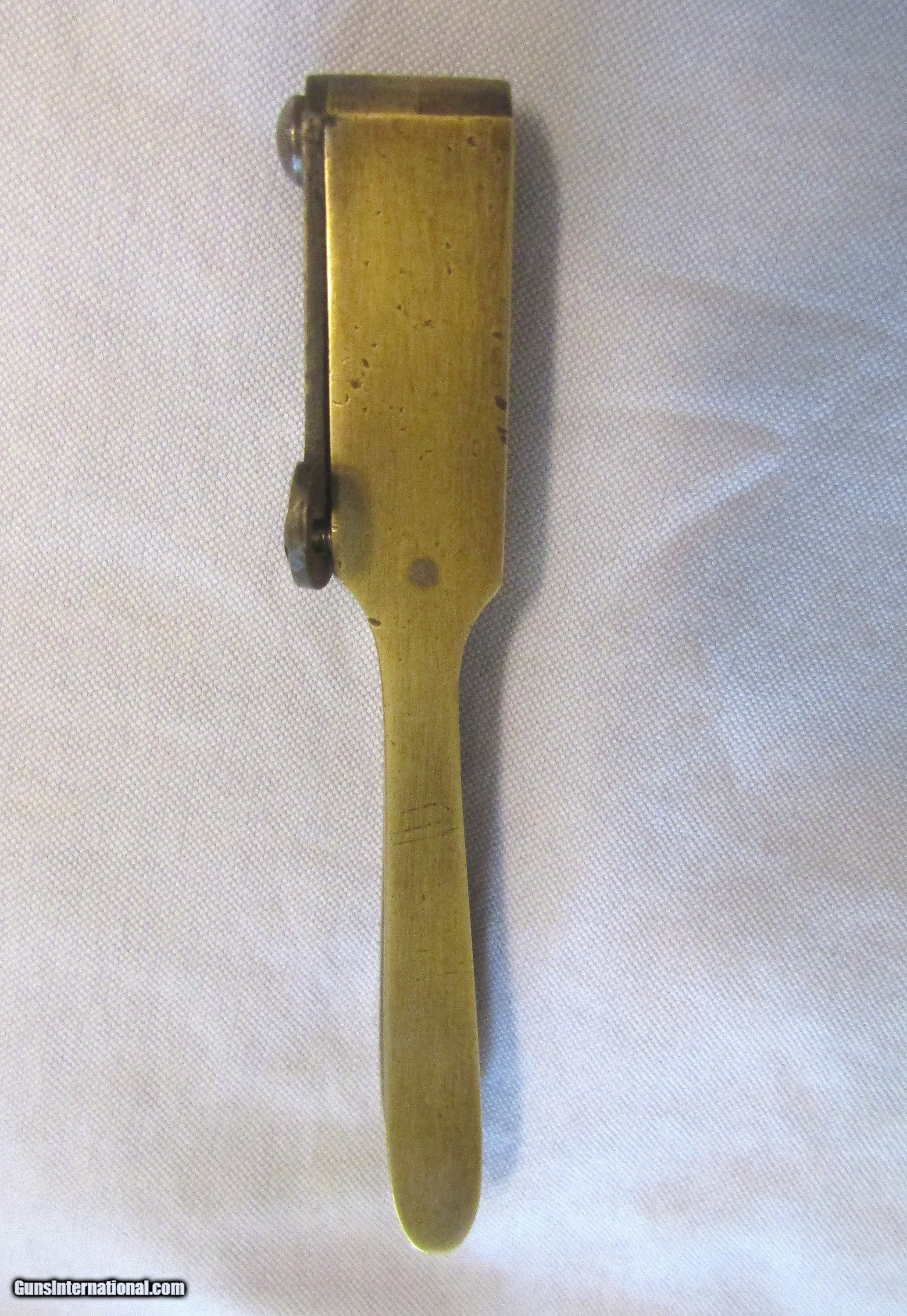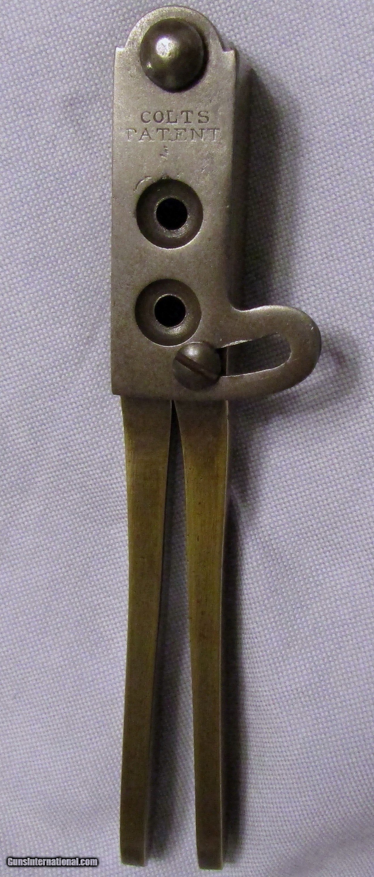 Description: Here is an extremely rare Colts Patent bullet mold for the square-back 1851 Navy Colt or any other early Navy Colt. This bullet mold is worthy of a nice, early cased Navy Colt. It has a very pleasing golden patina. It opens and closes just as it should. The cavities are perfect! It certainly has never been used as a hammer having only minor handling marks. It would be hard to improve on this early Colt mold. SOLD |