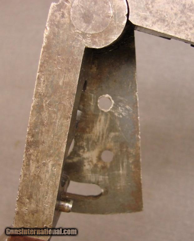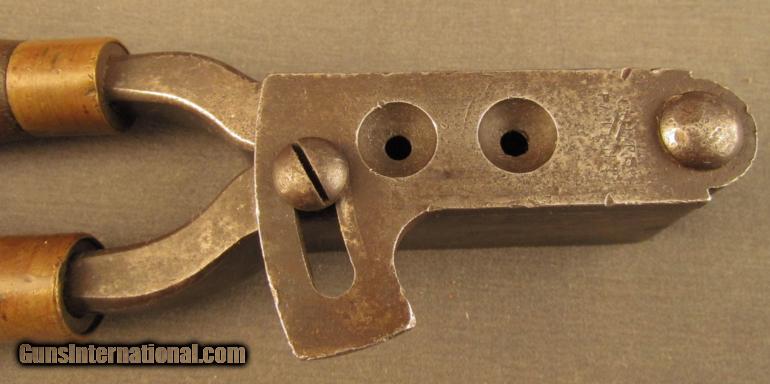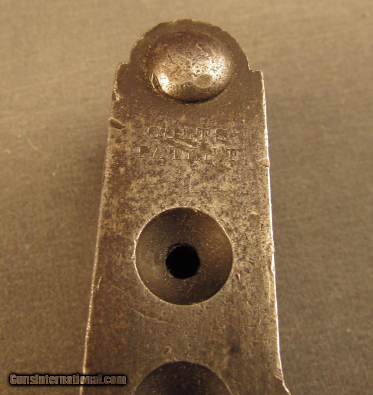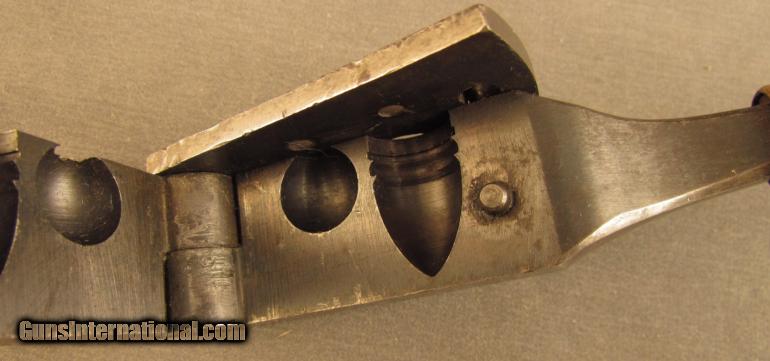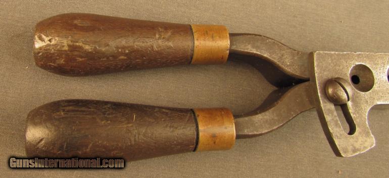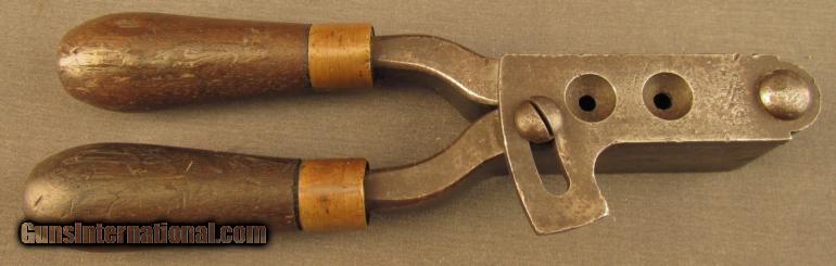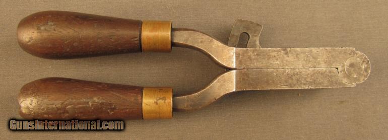 Description: Colt mold .64 cal. This piece is marked "Colts Patent" on the sprue cutter, with some light pitting. The iron retains 50% of its grey-blue original finish. The interior retains most of its original blue and appears to have had little use. The handles are all original with the brass ferrule, the ends are counter sunk but the wood plug on the left is missing. There are a few gash marks on the left side of the mold and the top end of the cutter. A very scarce and hard to find mold for the Colt revolving rifle. See Rapley's book, "Colt Accouterments"pg. 259 #M41. SOLD Manufacturer: Colt Model: Mold Caliber Info: .64 Cal Gauge Info: .64 Cal |