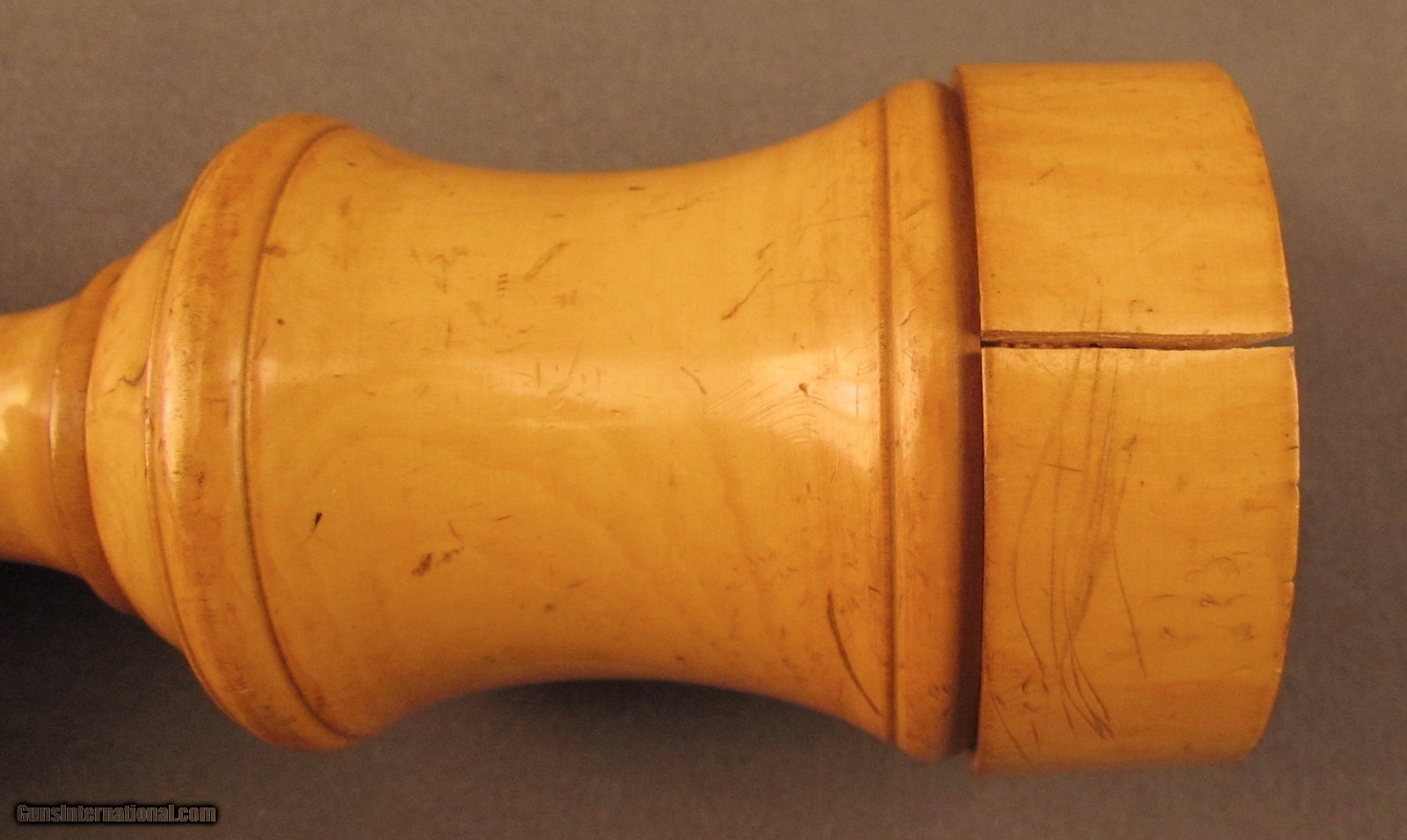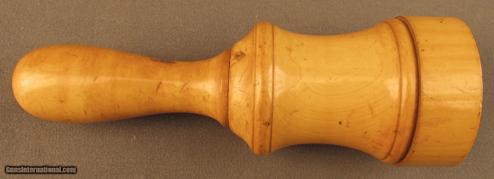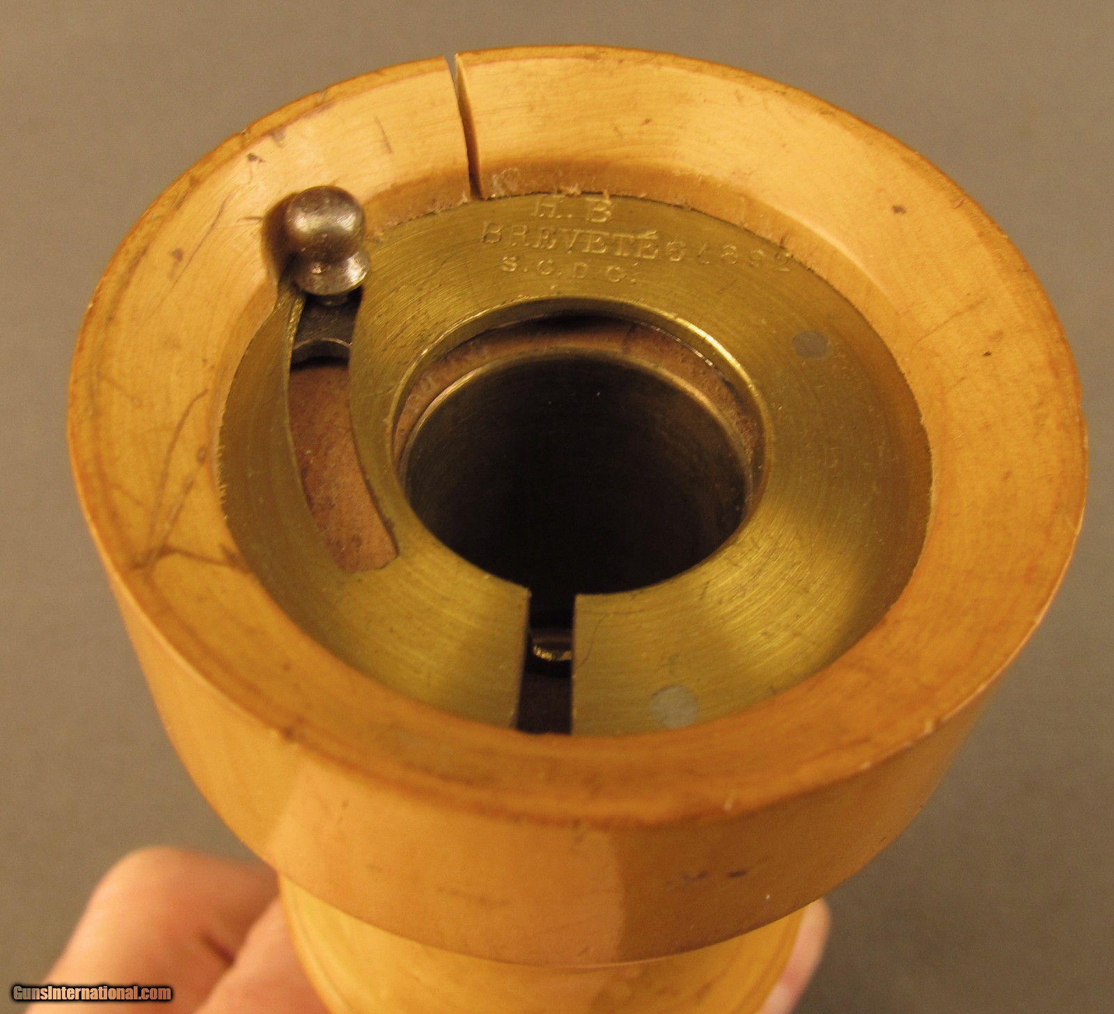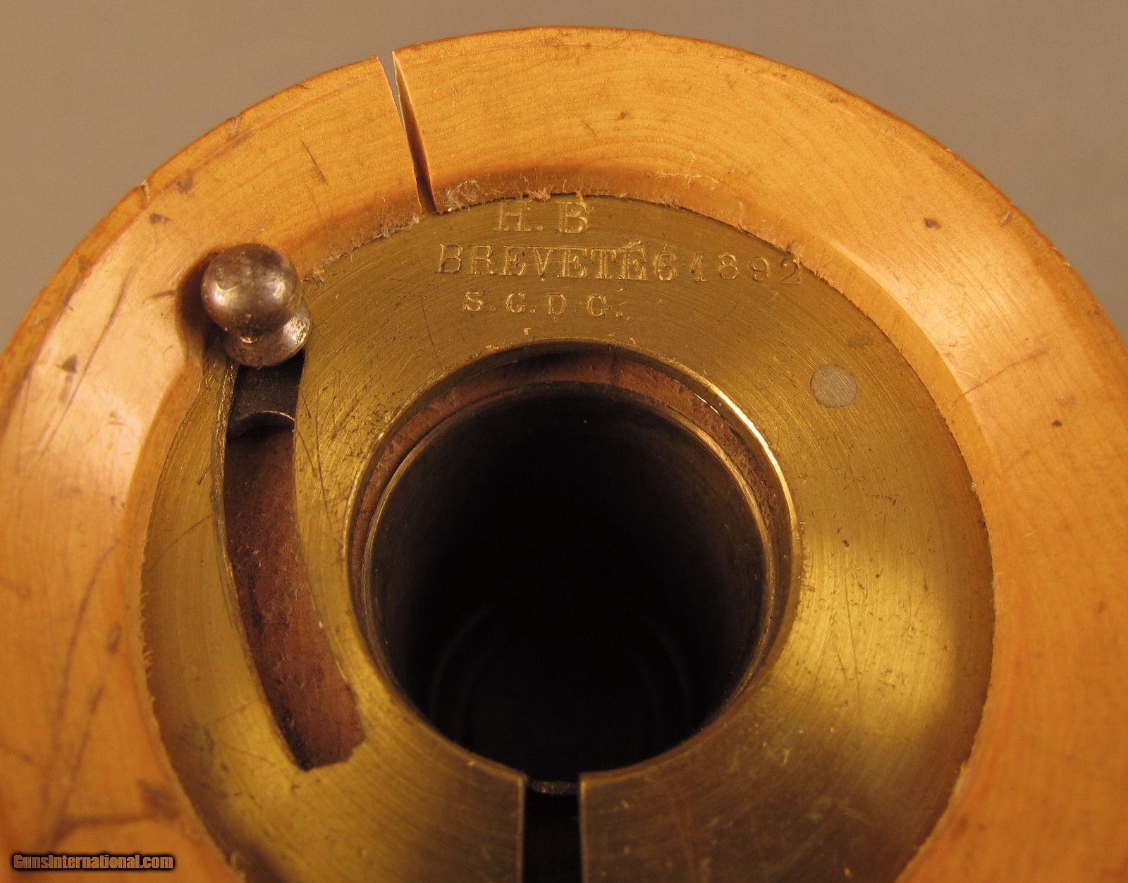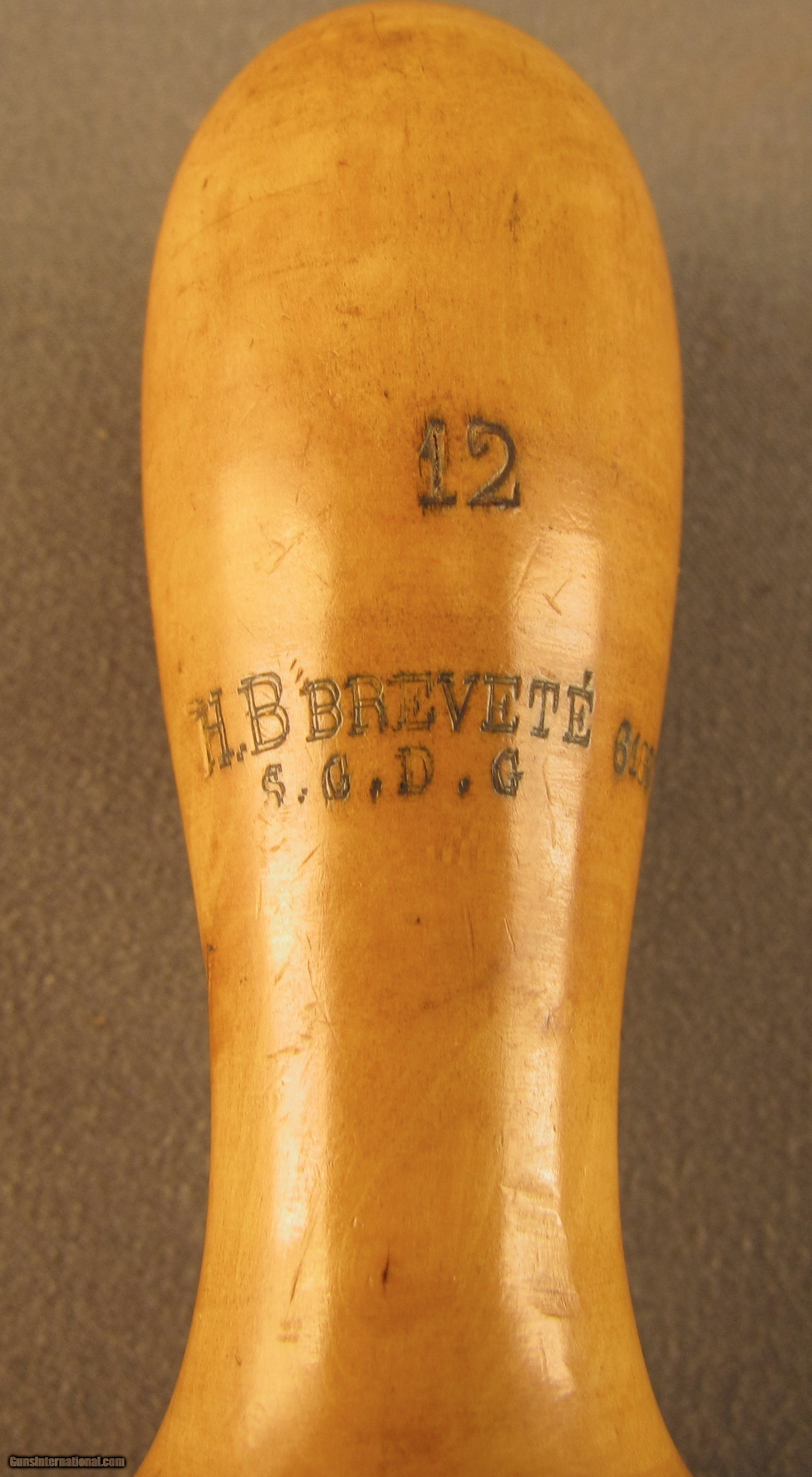 Description: These two tools are made of turned maple with brass internal parts. First is a shell funnel marked "12" on center band with a slot for the pin. Second is a shell roll crimper, also marked "12" on handle with "H.B. Brevete S.G.D.G. 61892" on the handle and on the bottom plate inside tool. The shell is inserted in bottom with pin in slot, a steel plate pivots out to hold base, and top is screwed down to crimp a paper shell. These are well built tools of high quality and show wear from use and storage. The crimper has an age check in base tht reveals screw thread construction. These rare tools will look great on display in any reloading collection. SOLD Manufacturer: Pinfire Model: Tool Caliber Info: 12ga Gauge Info: 12ga |