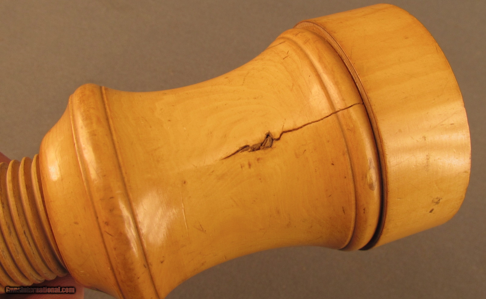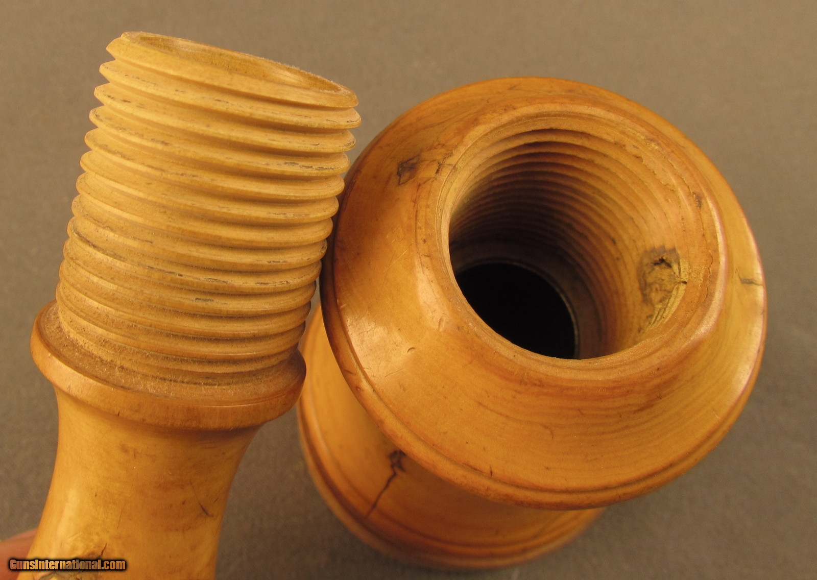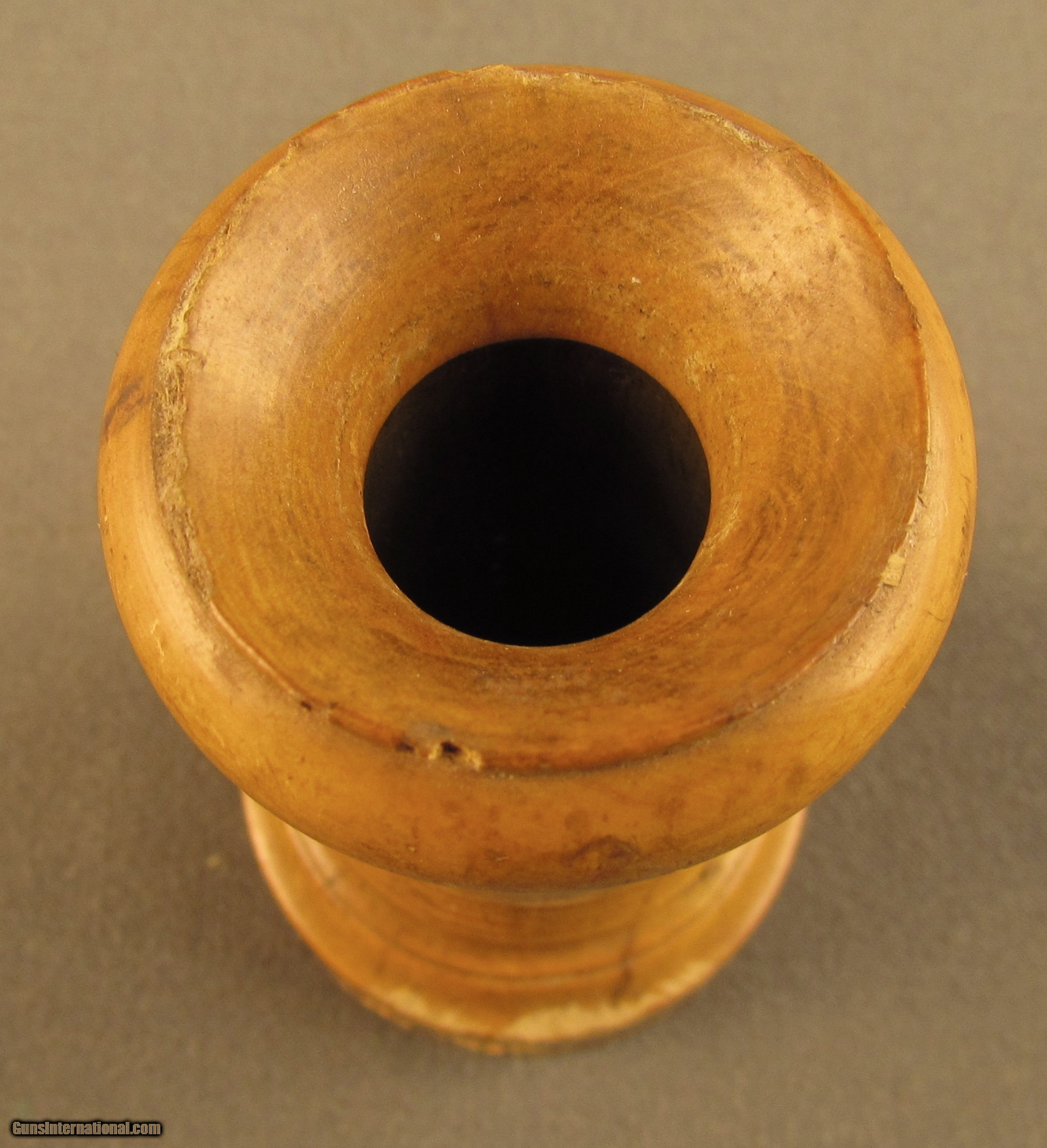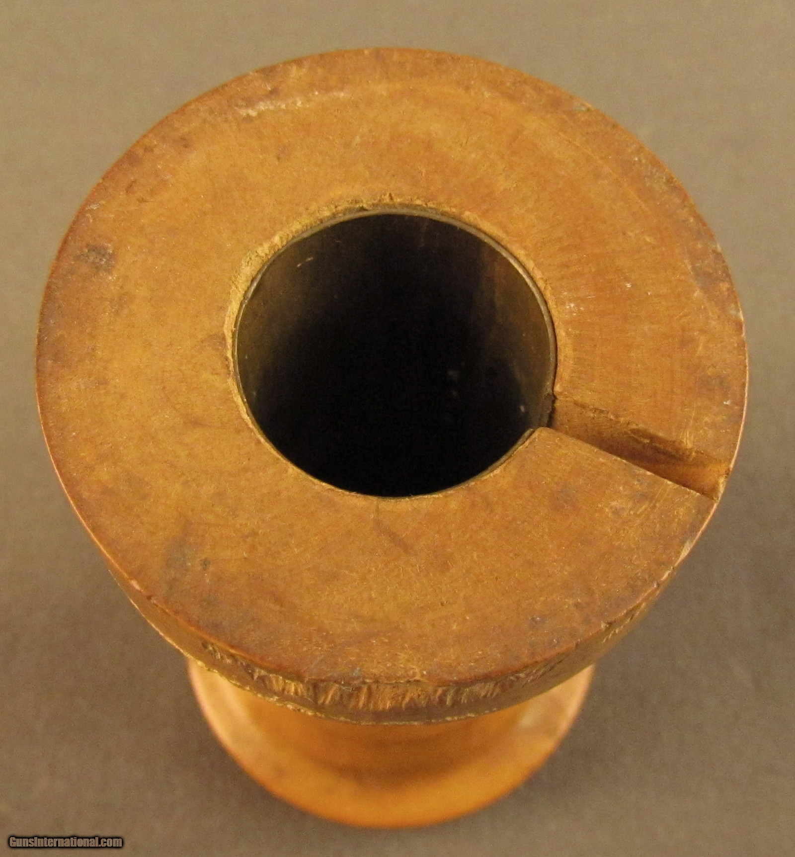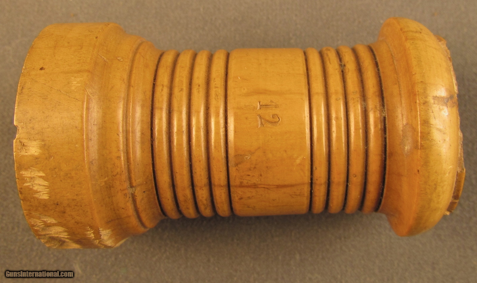 Description: These two tools are made of turned maple with brass internal parts. First is a shell funnel marked "12" on center band with a slot for the pin. Second is a shell roll crimper, also marked "12" on handle with "H.B. Brevete S.G.D.G. 61892" on the handle and on the bottom plate inside tool. The shell is inserted in bottom with pin in slot, a steel plate pivots out to hold base, and top is screwed down to crimp a paper shell. These are well built tools of high quality and show wear from use and storage. The crimper has an age check in base tht reveals screw thread construction. These rare tools will look great on display in any reloading collection. SOLD Manufacturer: Pinfire Model: Tool Caliber Info: 12ga Gauge Info: 12ga |