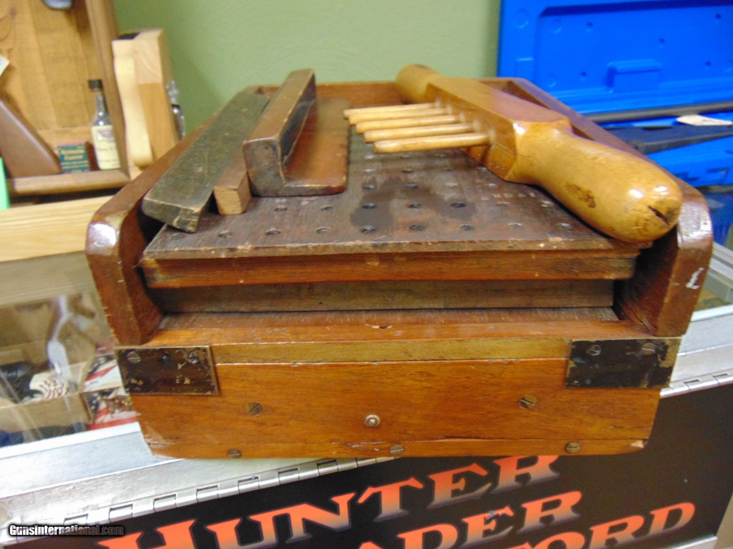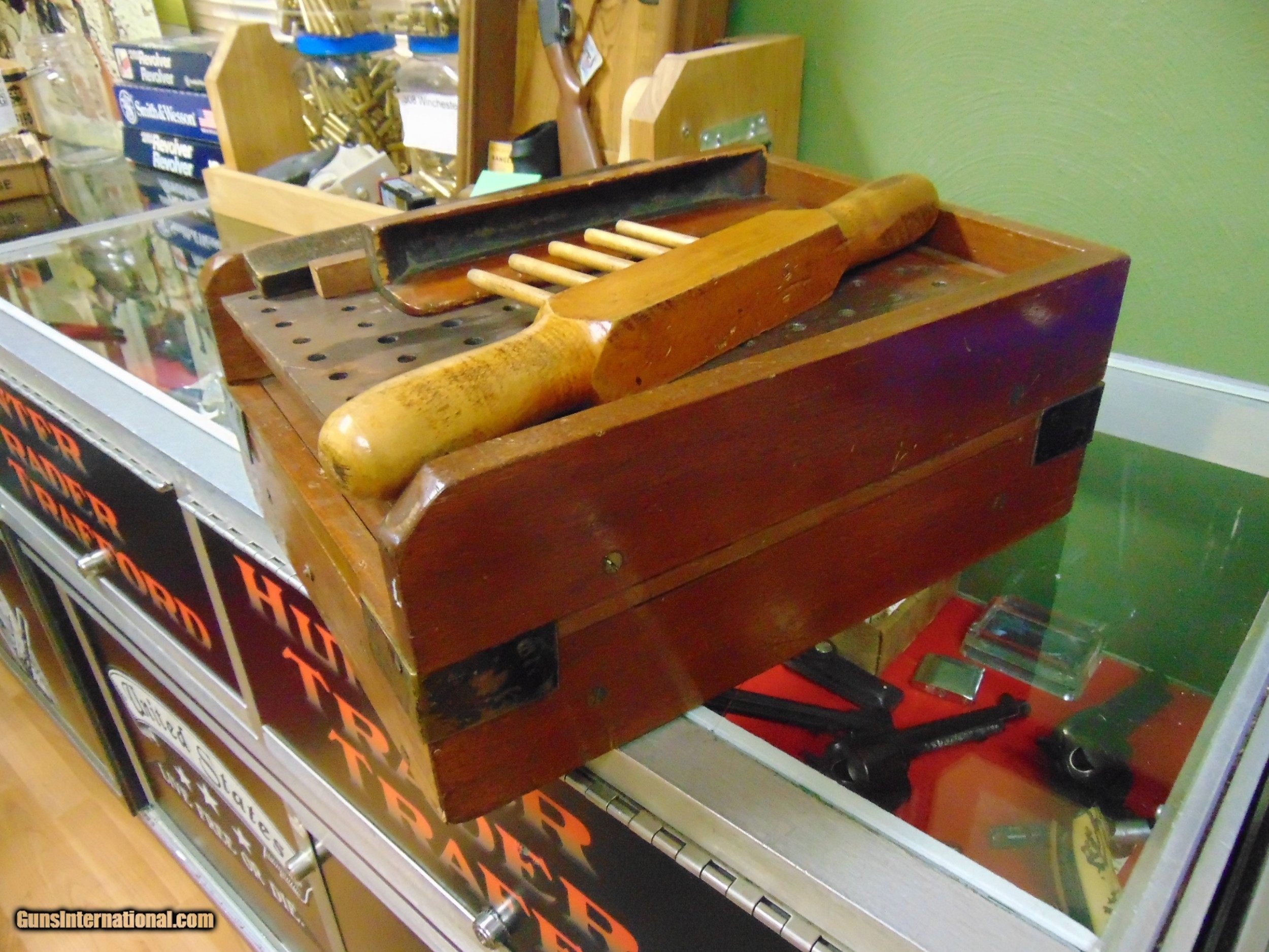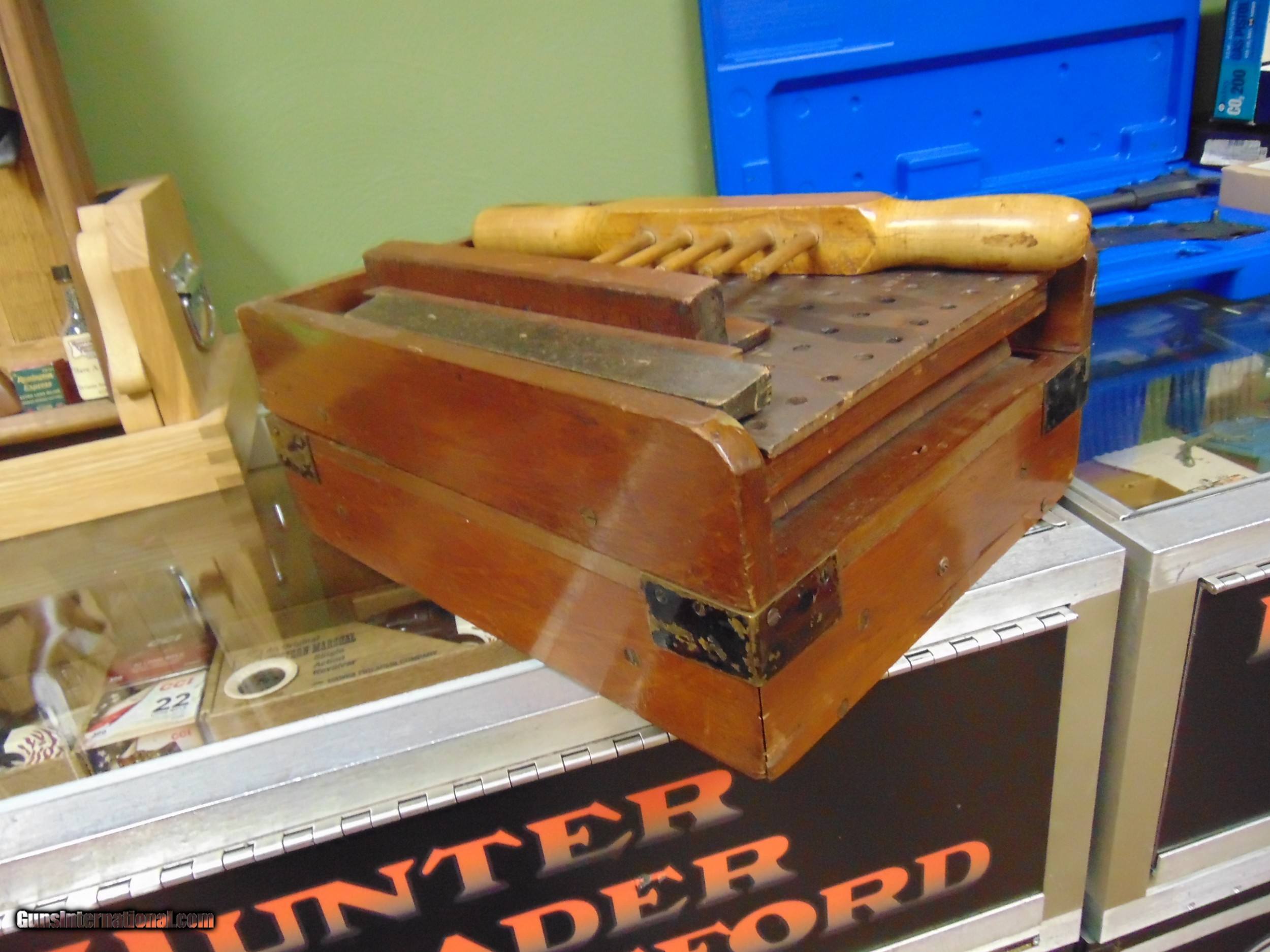 Description: For sale is a Antique J. Erskine Newton Stewart 410 shot shell reloader. This solid mahogany loading box lets you reload 100 shells at one time. These where made in the late 1880s, and I can only imagine the impact they must of had on the reloading issue. This one remains in really nice shape for its age, and as far I can see it has everything you would need to reload, and reload 100 at a clip. This is one way past cool addition to your reloading room, and none of your buddys have one for sure. Need more info. give us a call. Buyer pays actual shipping charges. The first and only one we have ever came across. This is screaming with what we would call the cool factor. ****Sold**** SOLD |