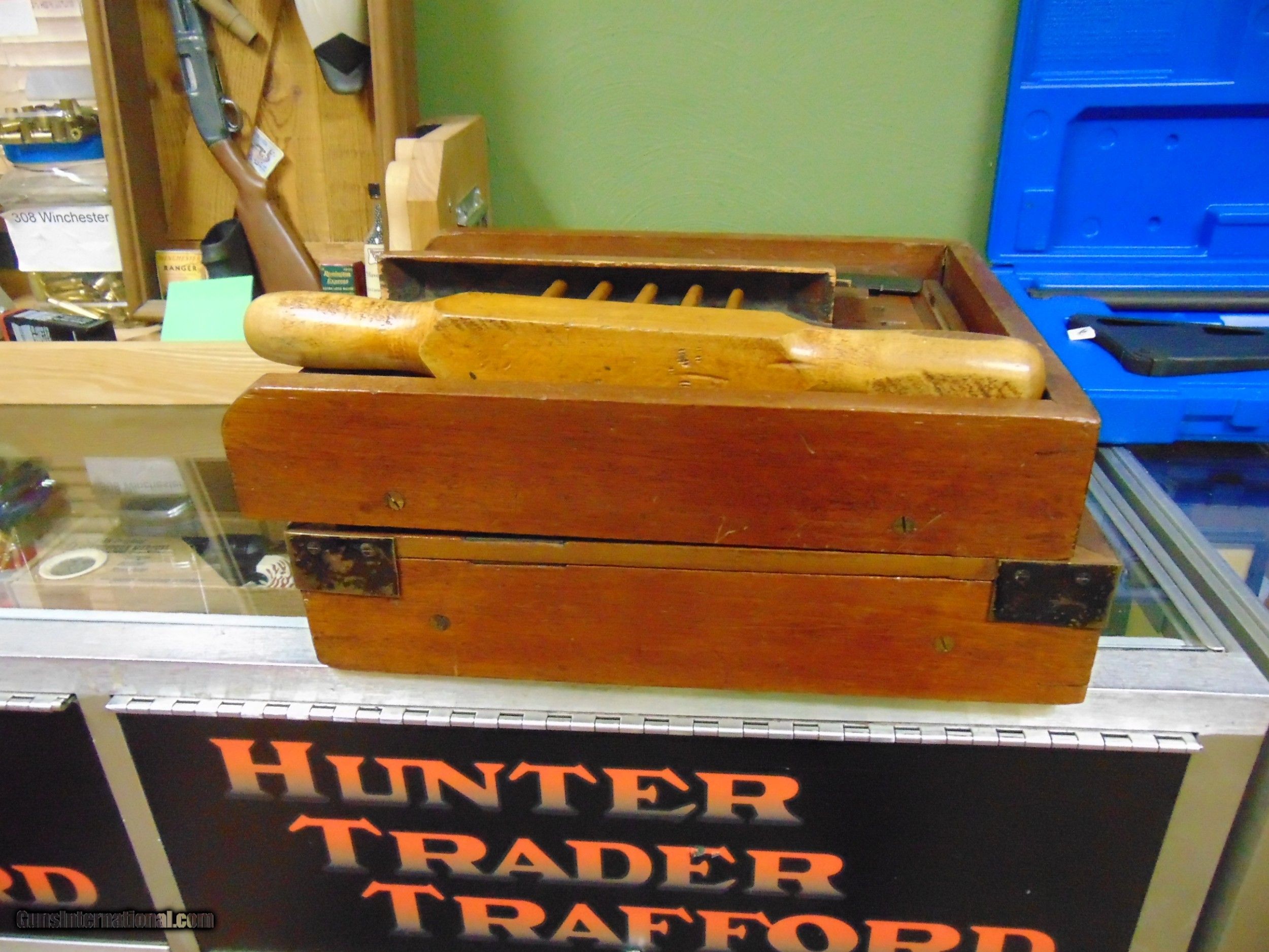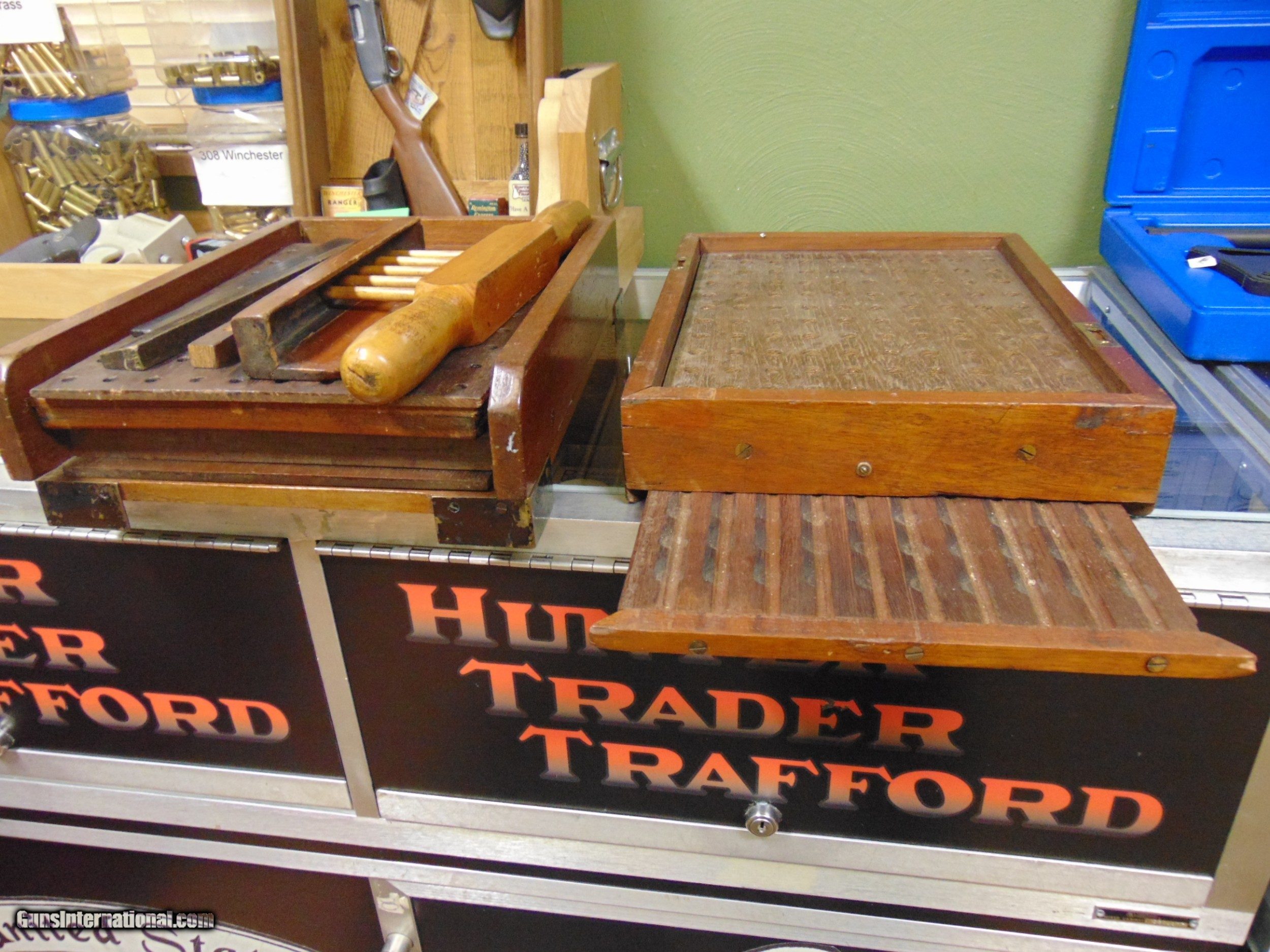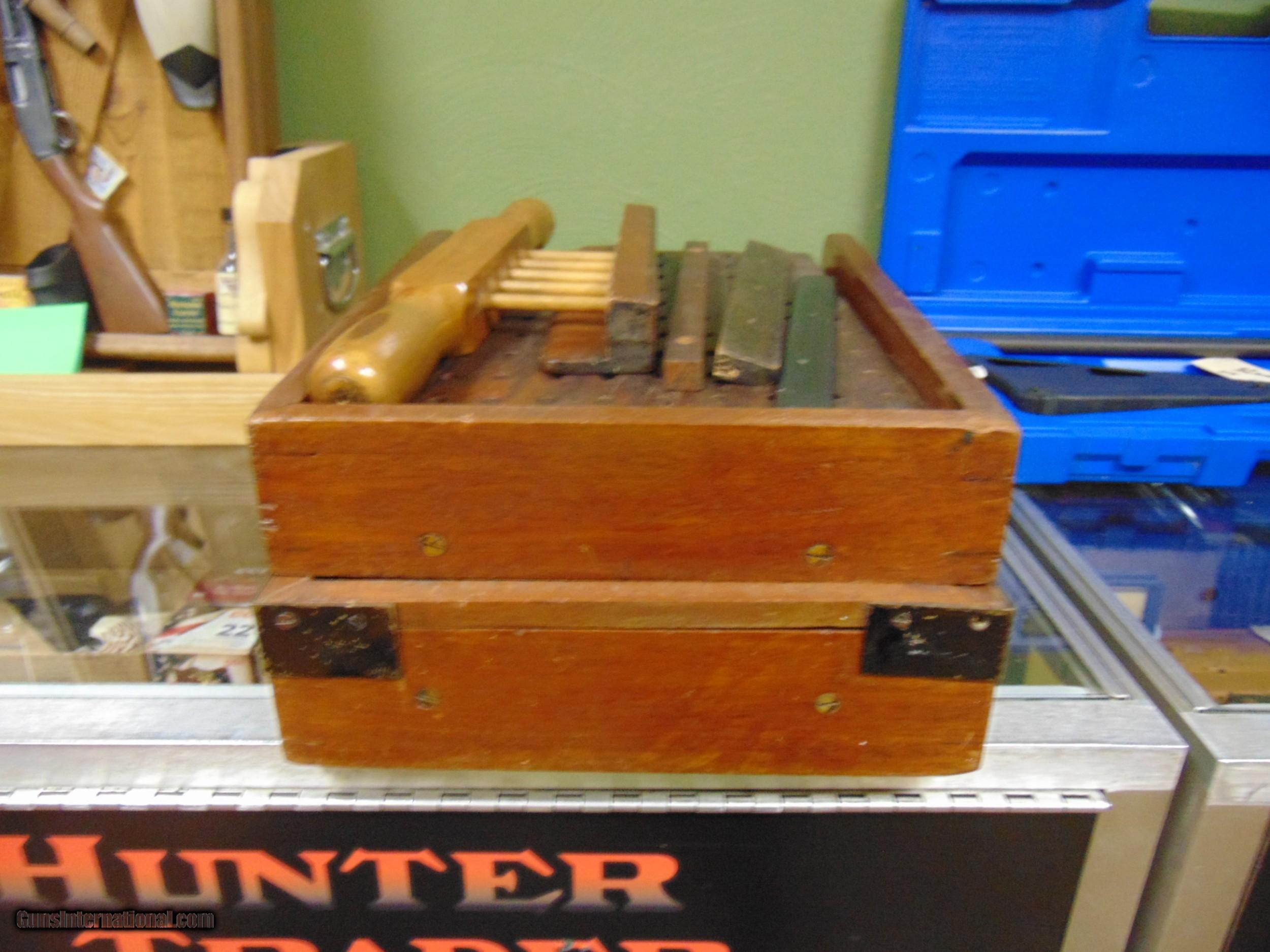 Description: For sale is a Antique J. Erskine Newton Stewart 410 shot shell reloader. This solid mahogany loading box lets you reload 100 shells at one time. These where made in the late 1880s, and I can only imagine the impact they must of had on the reloading issue. This one remains in really nice shape for its age, and as far I can see it has everything you would need to reload, and reload 100 at a clip. This is one way past cool addition to your reloading room, and none of your buddys have one for sure. Need more info. give us a call. Buyer pays actual shipping charges. The first and only one we have ever came across. This is screaming with what we would call the cool factor. ****Sold**** SOLD |