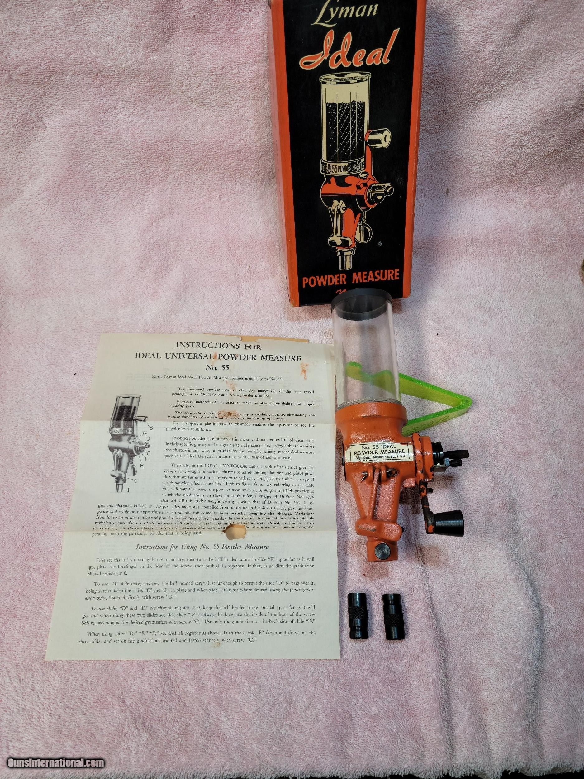 Description: LYMAN IDEAL POWDER MEASURE #55 IN THE ORIGINAL BOX WITH INSTRUCTIONS AS SEEN IN THE PHOTOS. SOLD |