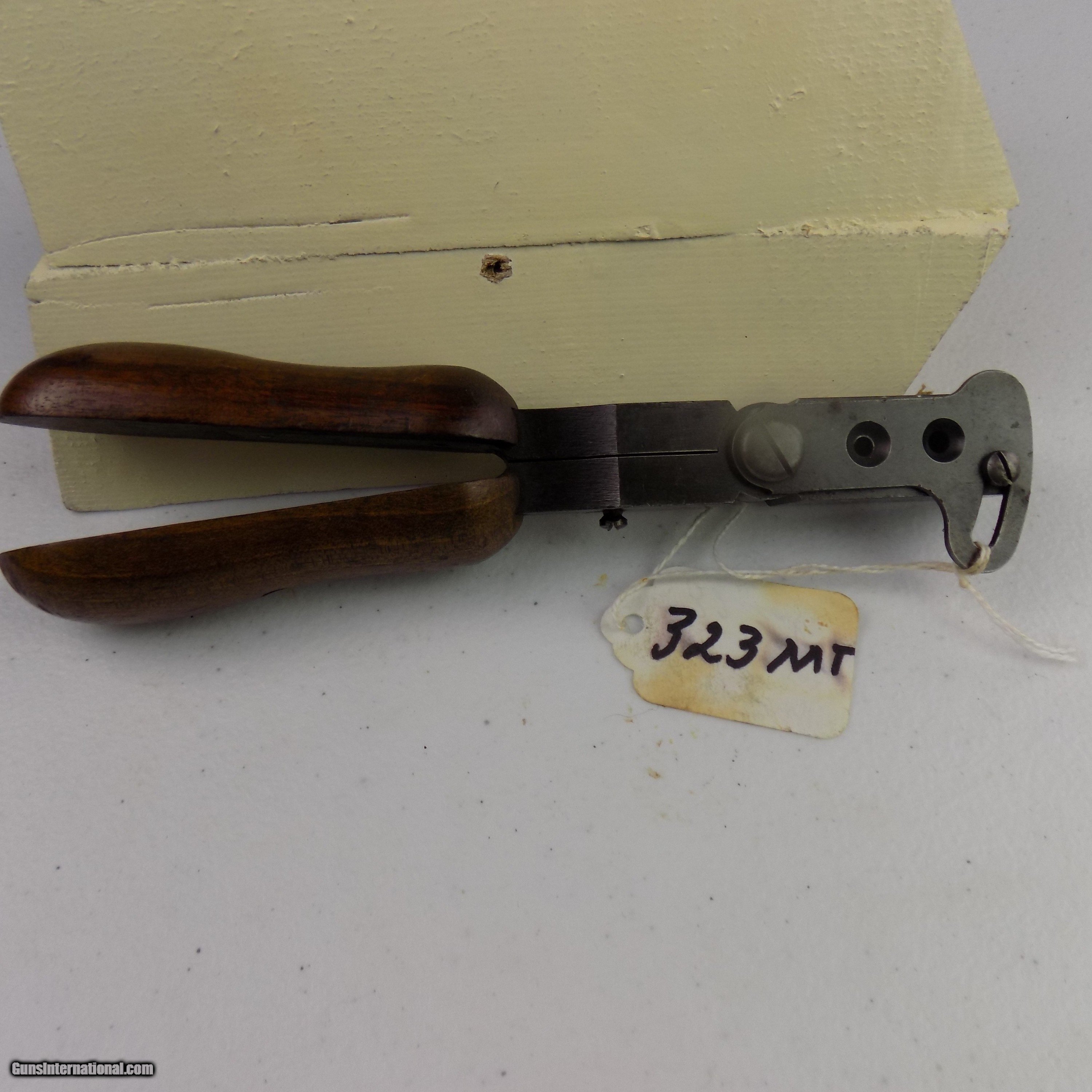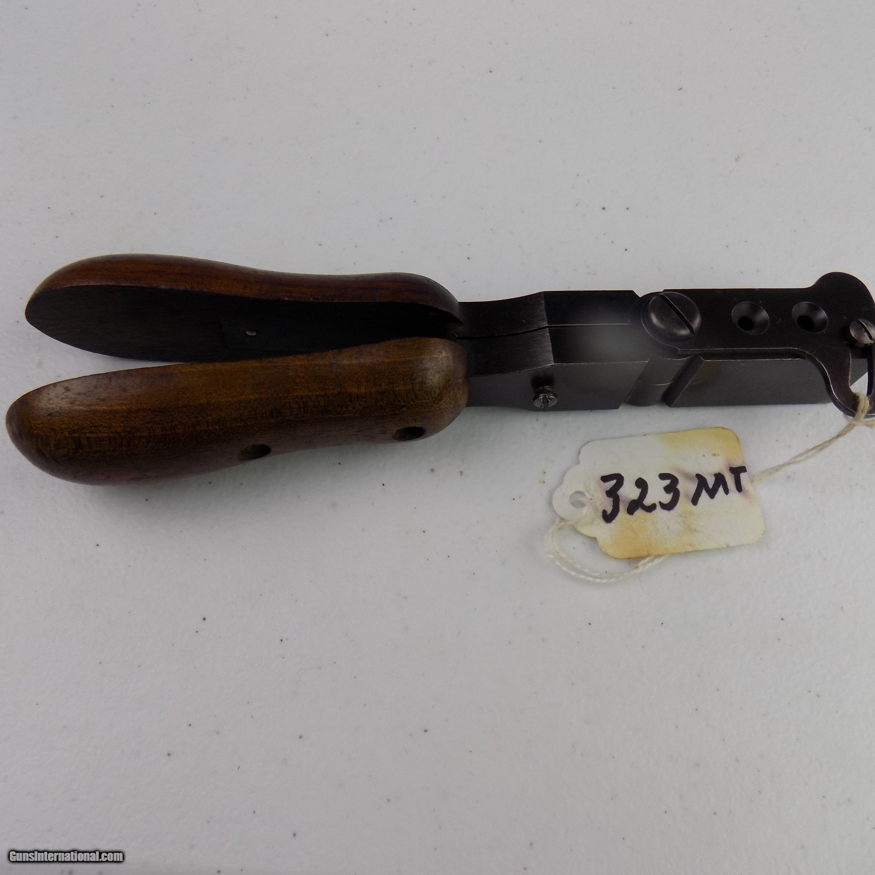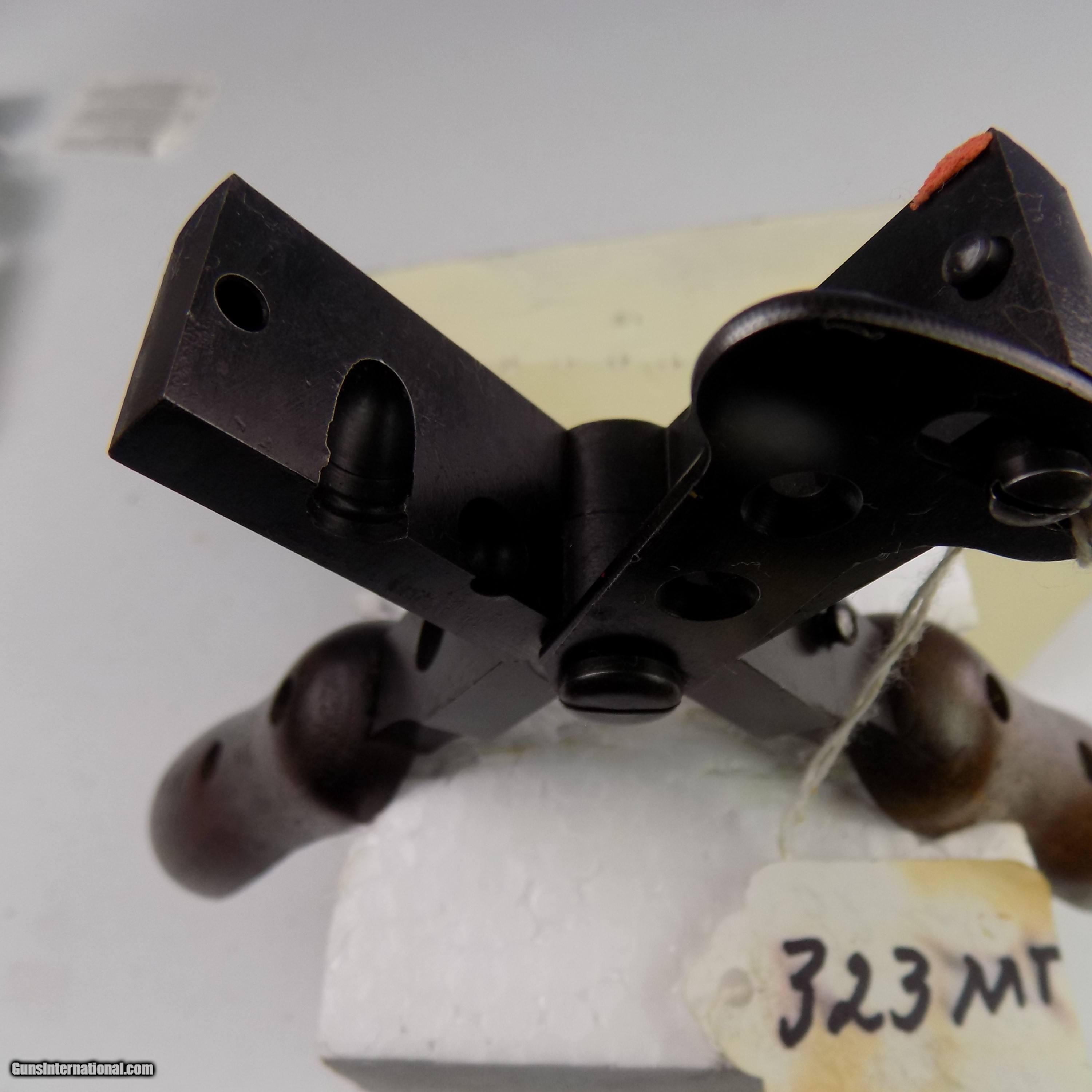 Description: #323MT 32 S&W double cavity mold, round ball & conical bullet, also capping pin, wooden handles, mold is in mint condition, rare. $345 SOLD Rifle Caliber: .32 S&W |
