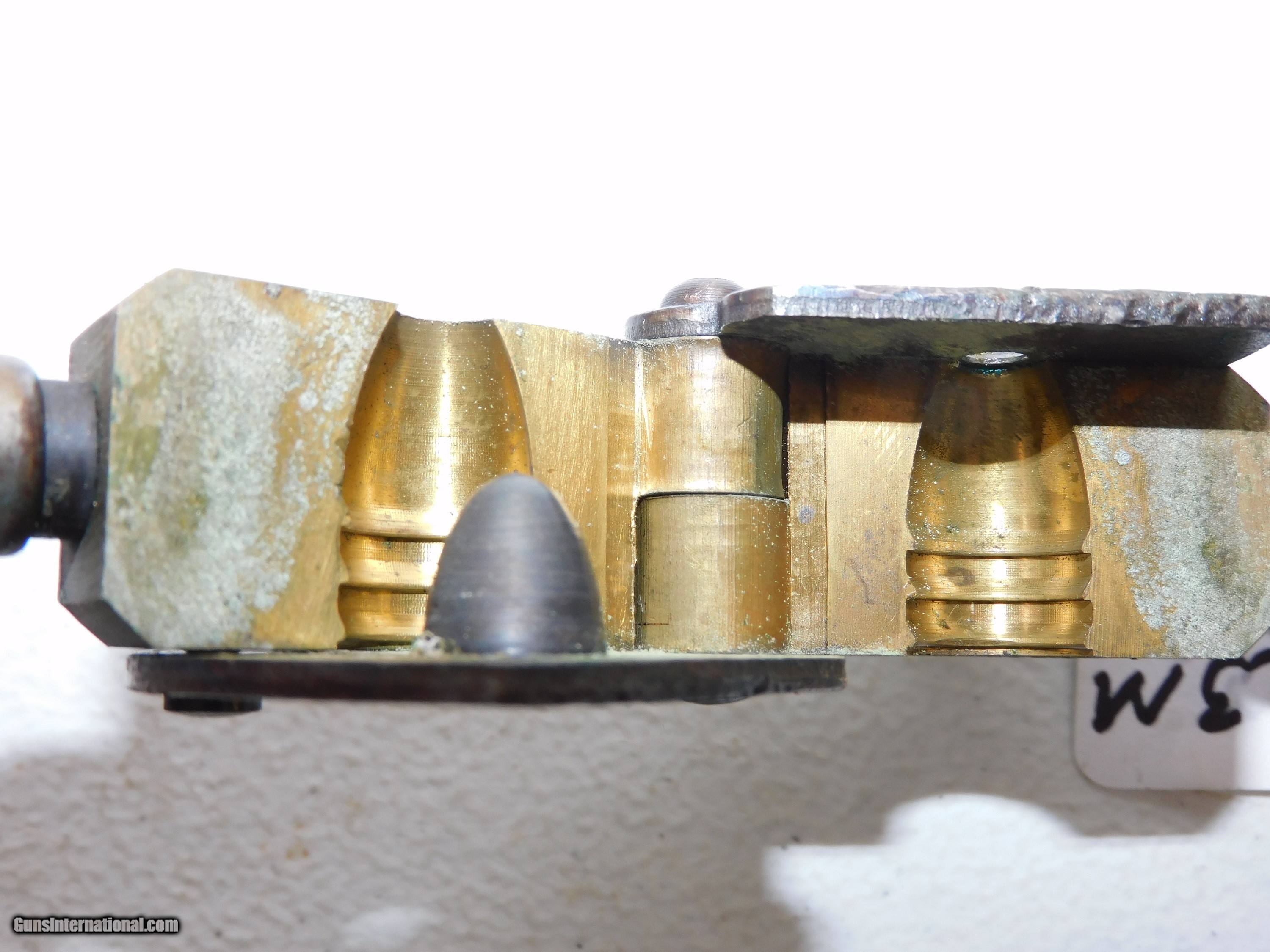 Description: #223MT 58 cal. brass mold with hollow base, looks like Rosewood handles, circa 1800’s, exc. cavities, probably for one of the Civil War Guns, exc. condition. $295 SOLD |
