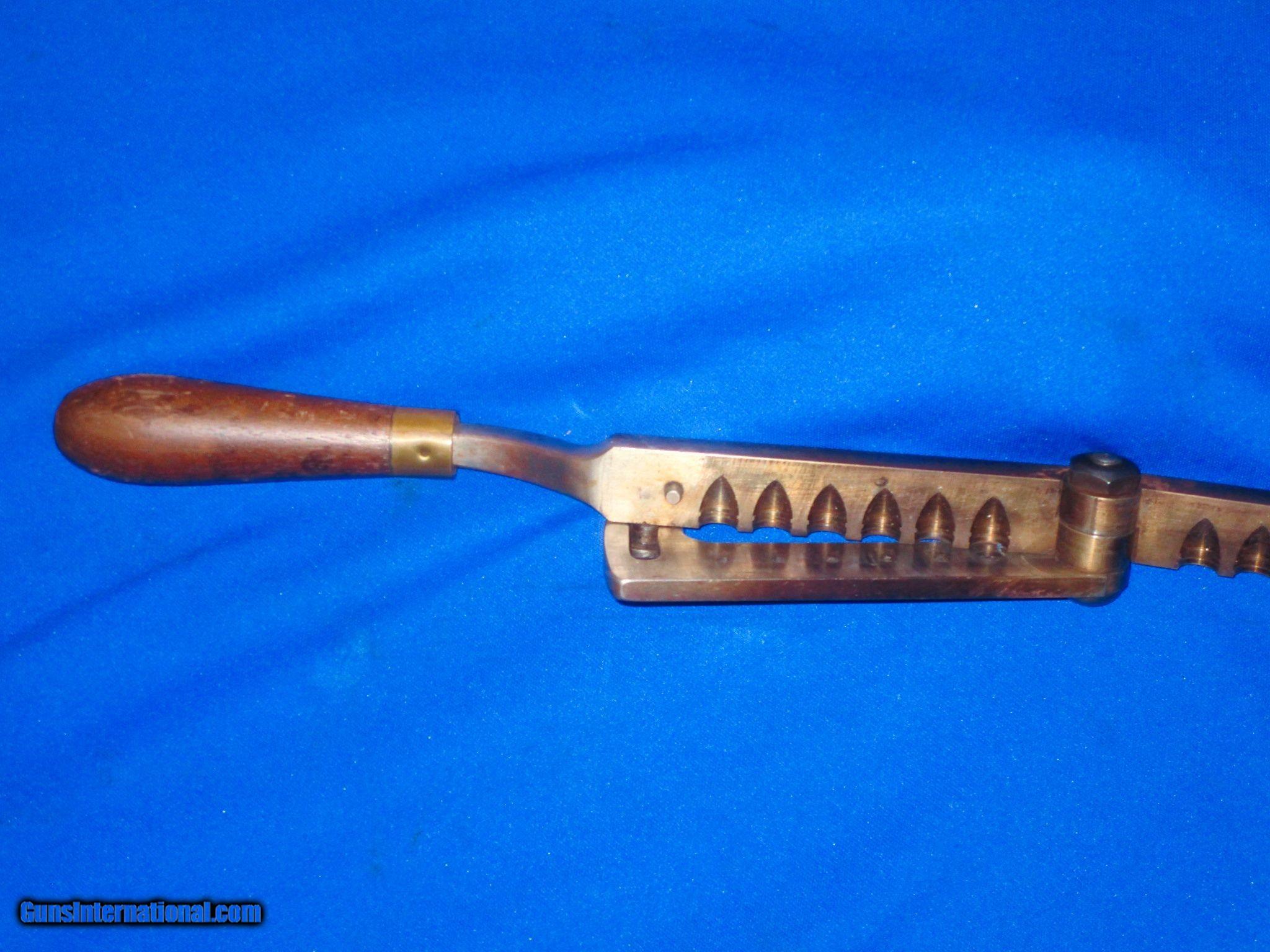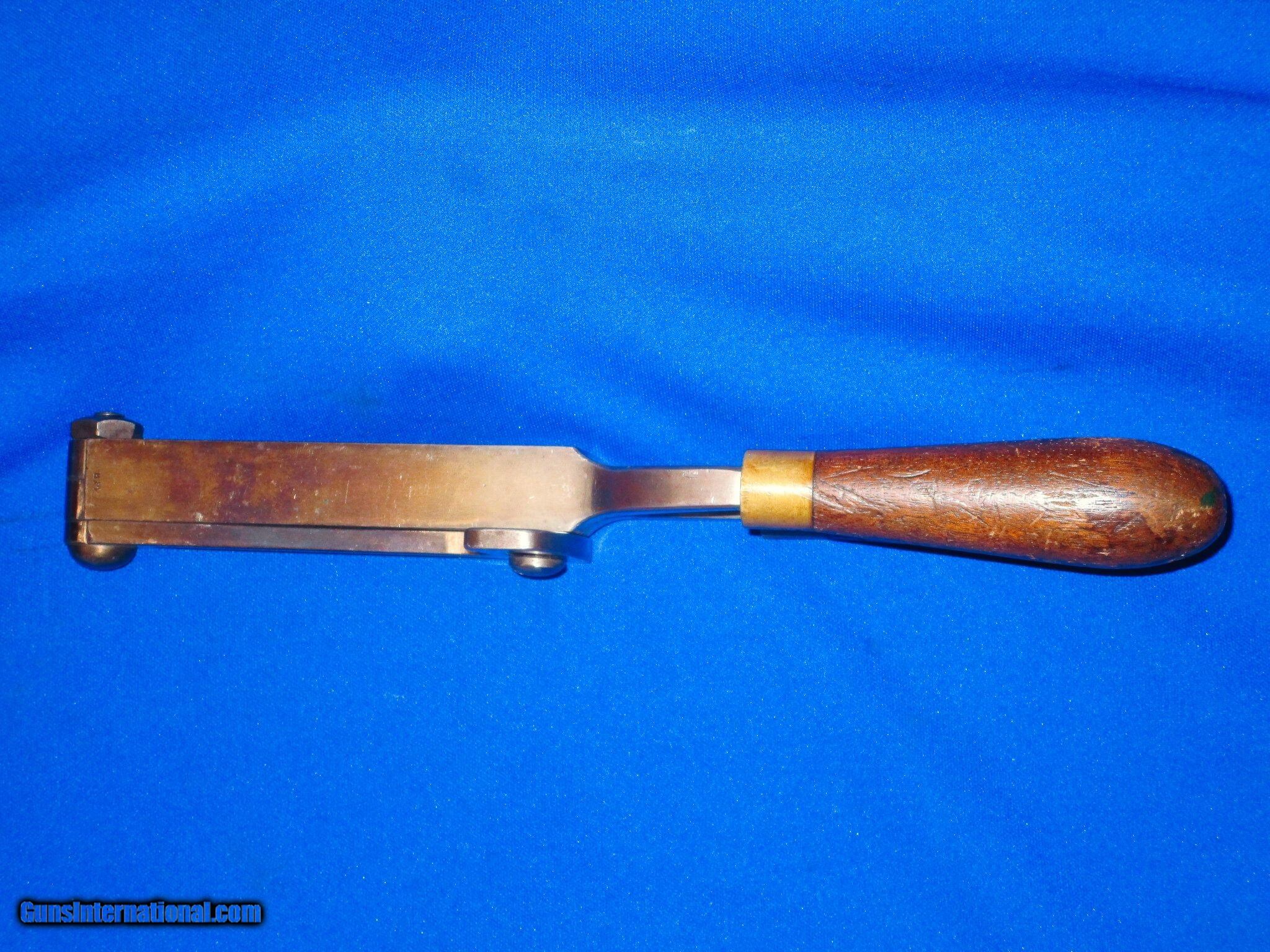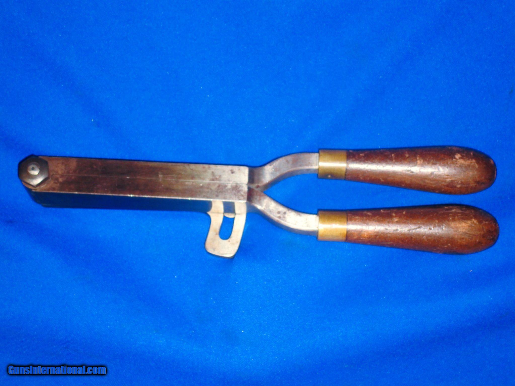 Description: A Scarce U.S. Civil War Colt Model 1860 Percussion Army Revolver Gang Mold In Excellent Plus To Mint Condition. All original and complete. The Mold has mint metal, markings, and edges. It is marked on the top right side "44h" for (44 Holster Pistol). The iron handle is sub inspected "G' On both sides of the top, and "D" on the bottom on one side. The large part of the mold retains its original factory colors throughout it inside the cavities and out. The original wood handles are fine throughout showing light wear. One of the brass fittings above the handles is stamped with #266. The inside bullet cavities are factory mint as new. This Is A Very Scarce U.S. Civil War Colt Model 1860 Percussion Army Revolver Gang Mold To Find Especially In This Wonderful Condition! SOLD |